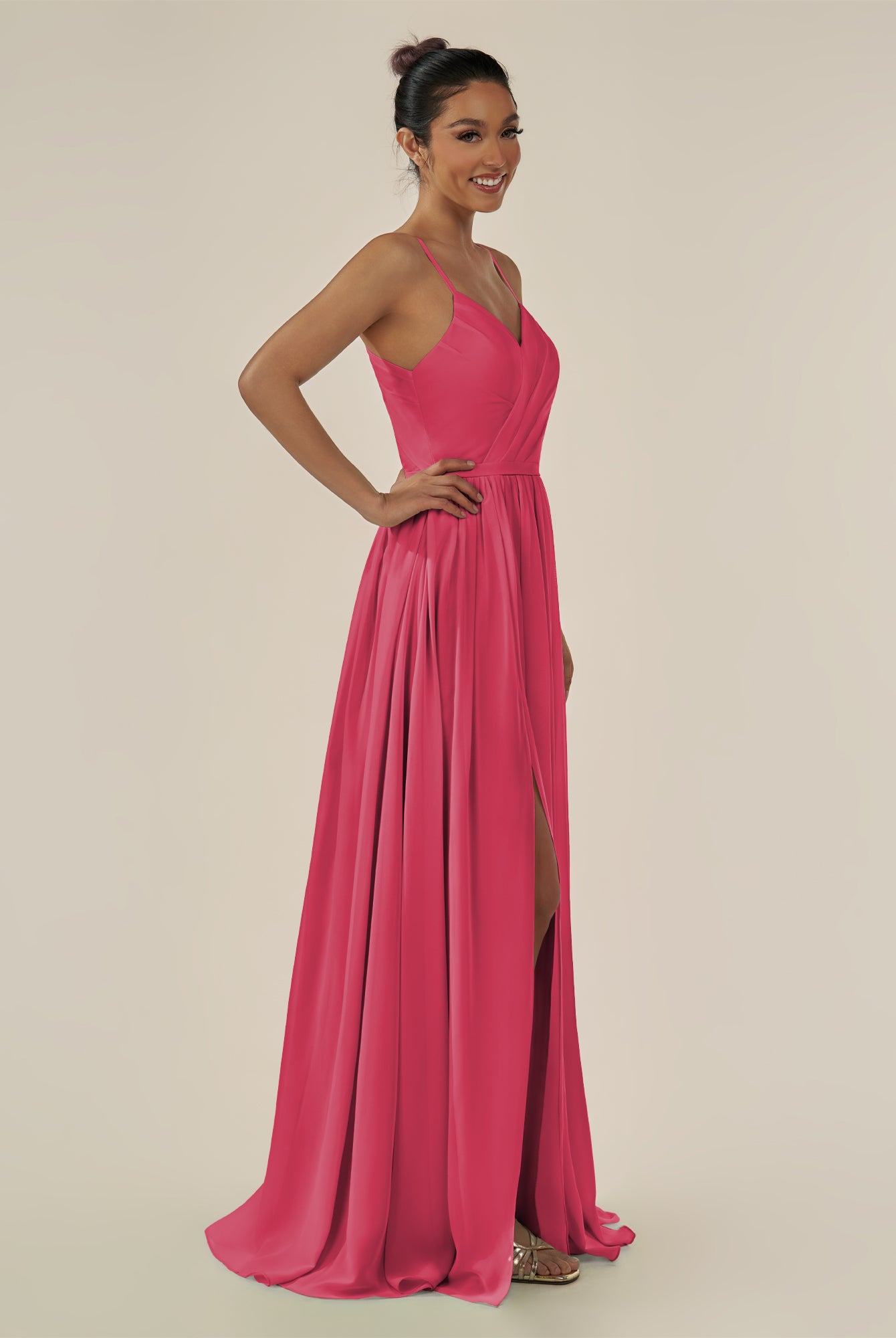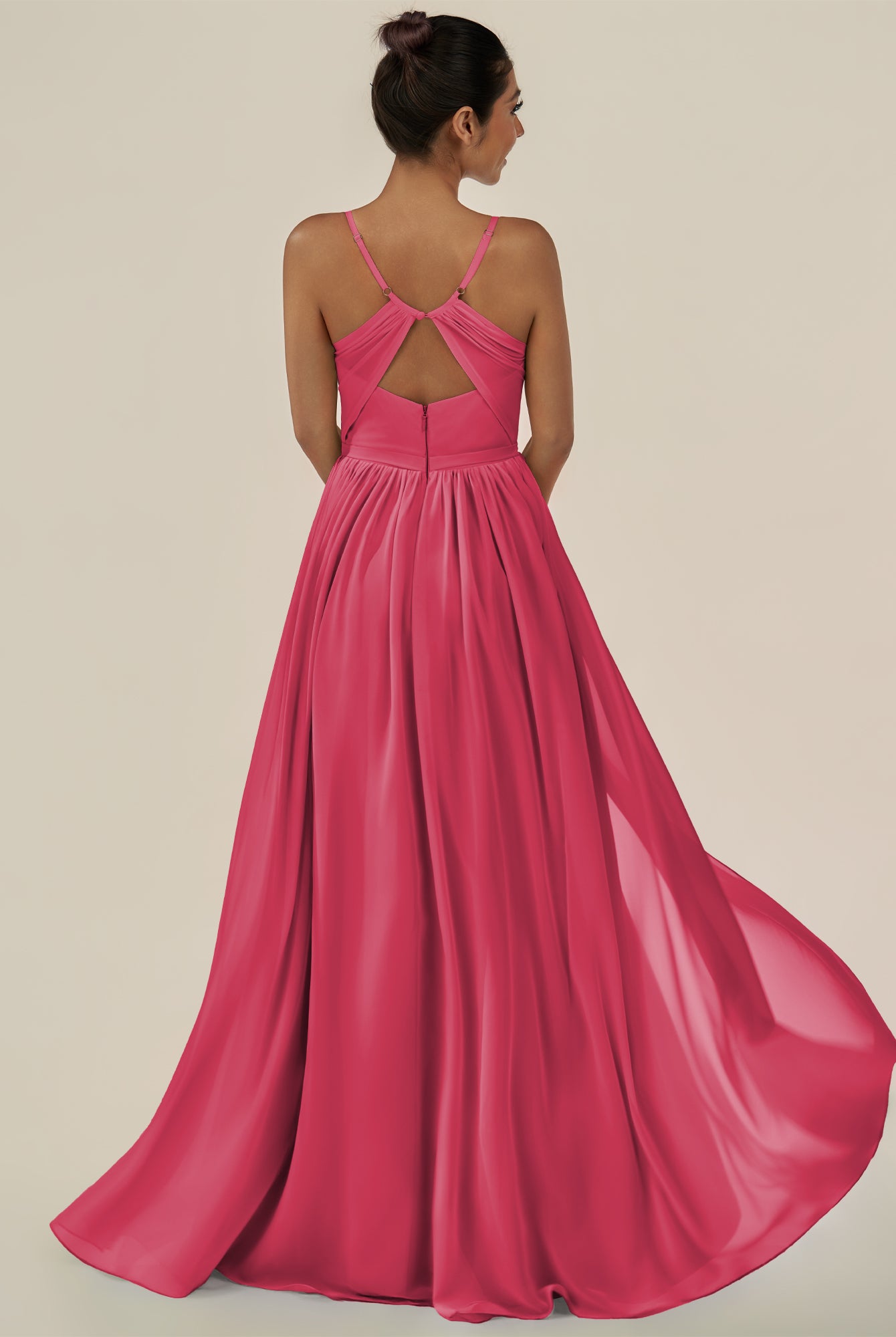 Irissa | Fuchsia - A Line Chiffon V Neck Pleated Long Bridesmaid Dress with Slit