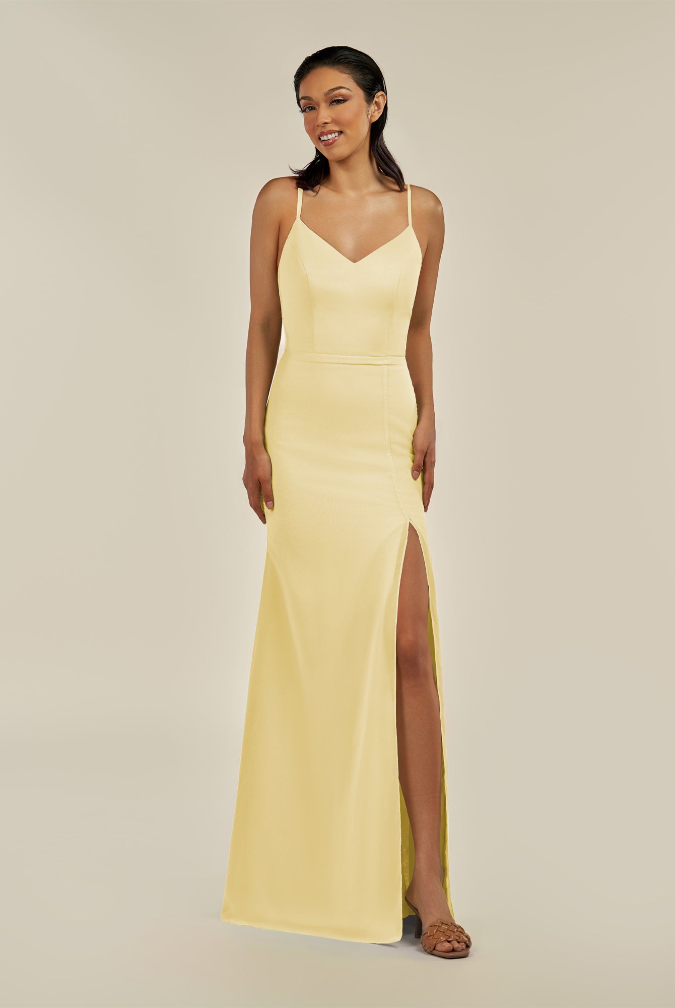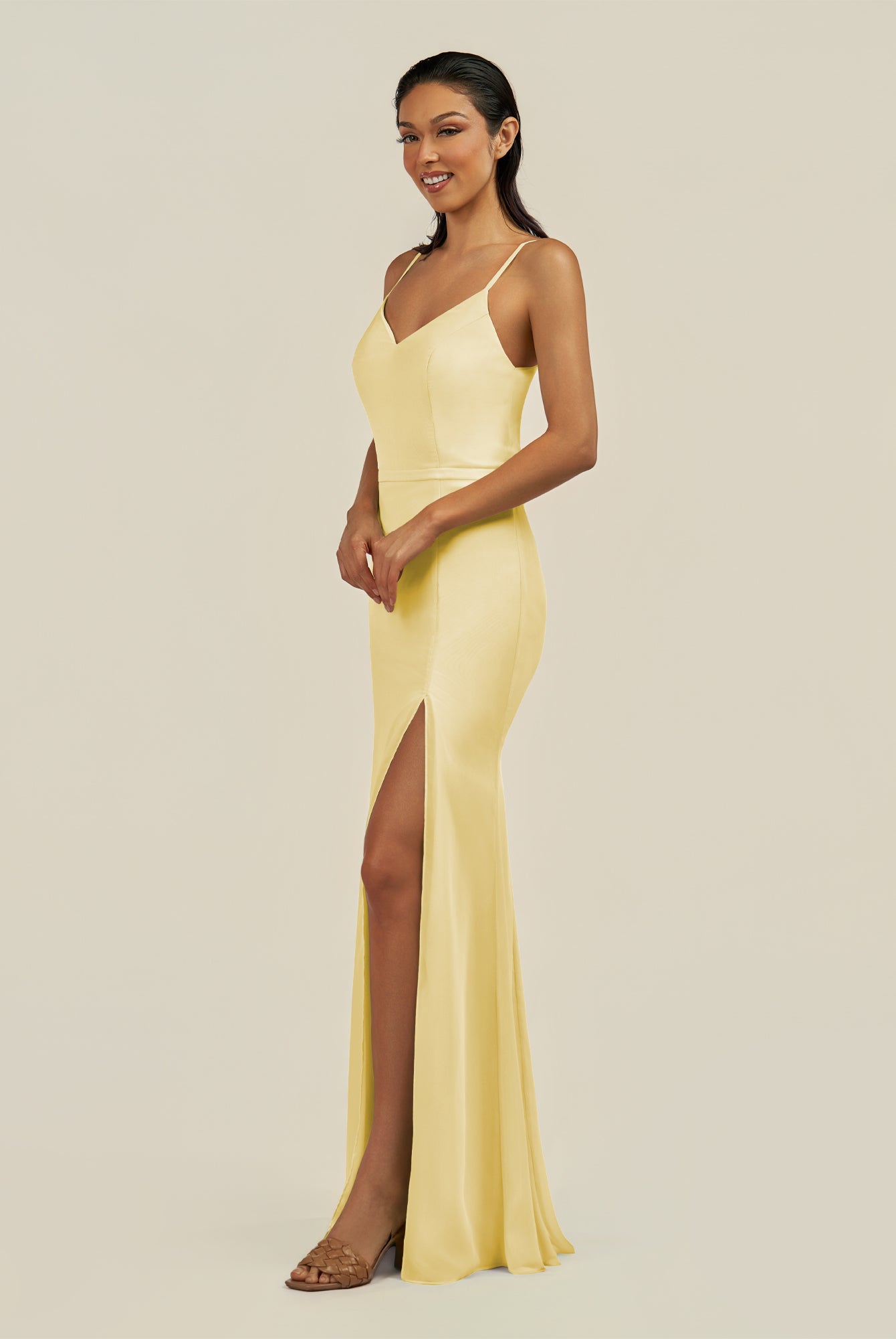 Kaelin | Pastel Yellow - Sheath Chiffon V Neck Long Bridesmaid Dress with Slit