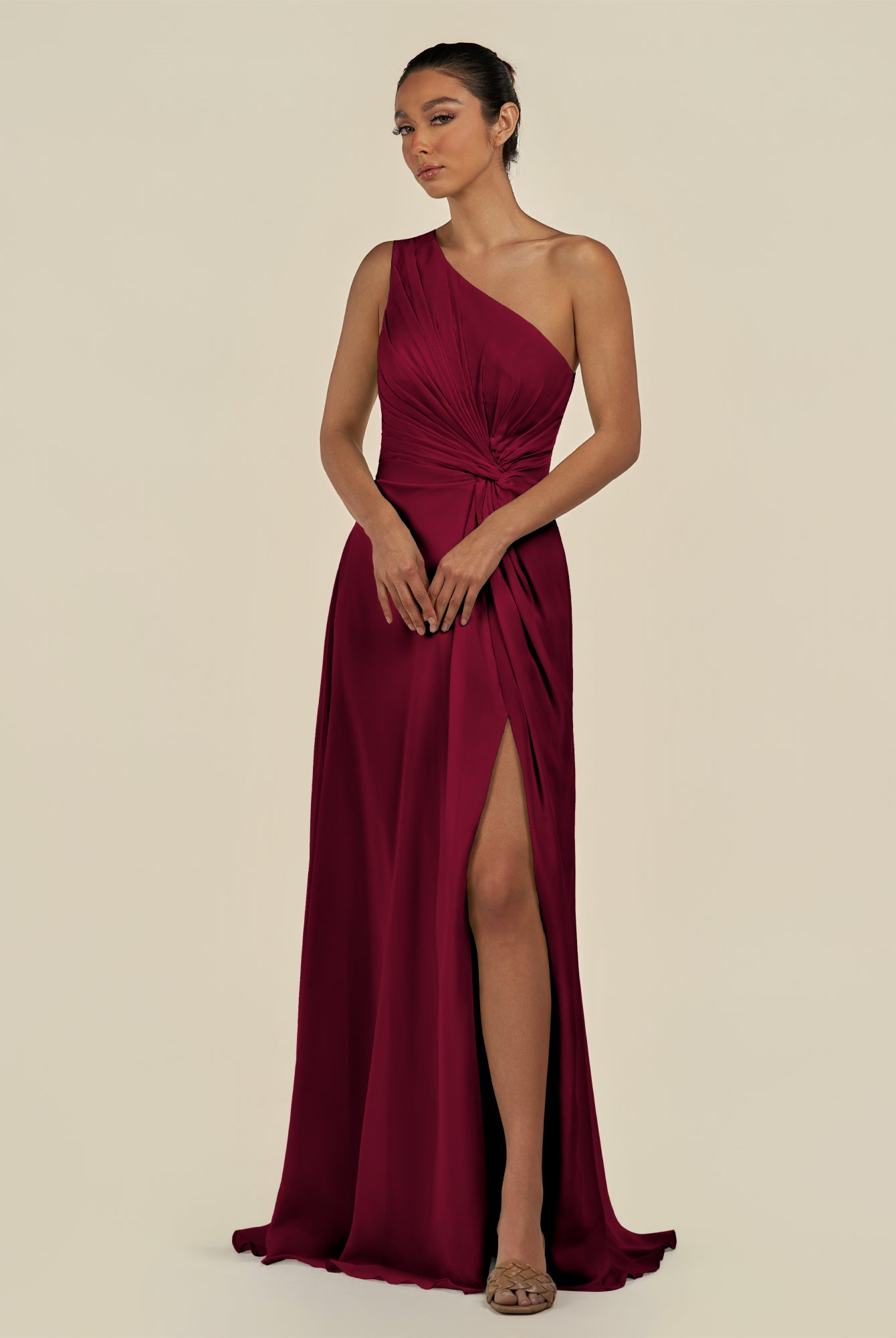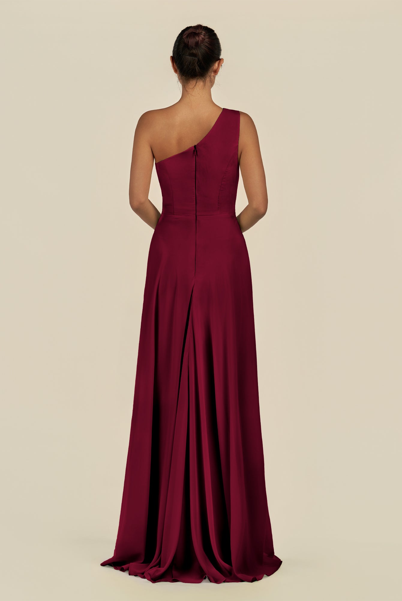 Gaela | Merlot - A Line One Shoulder Chiffon Pleated Long Bridesmaid Dress with Slit