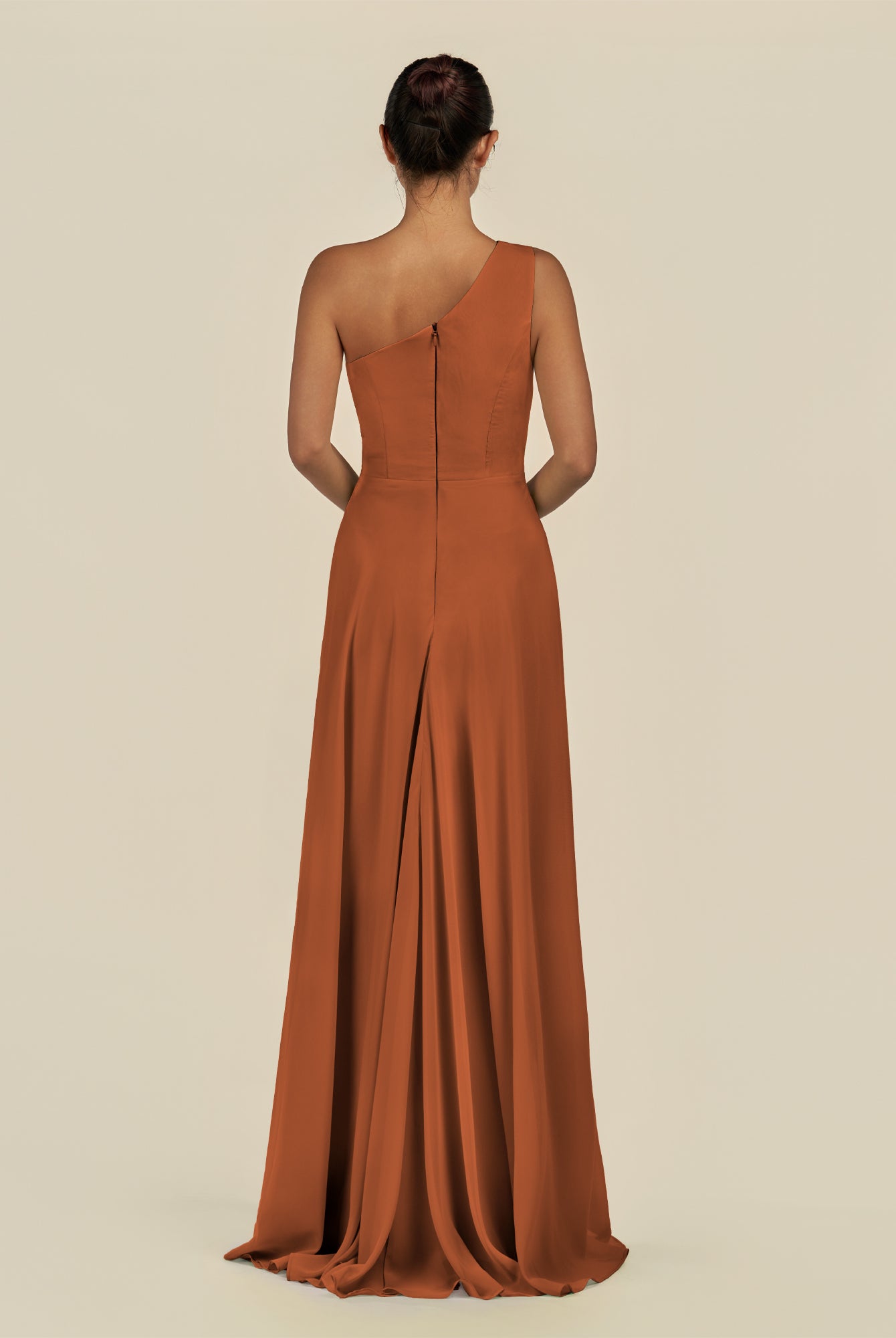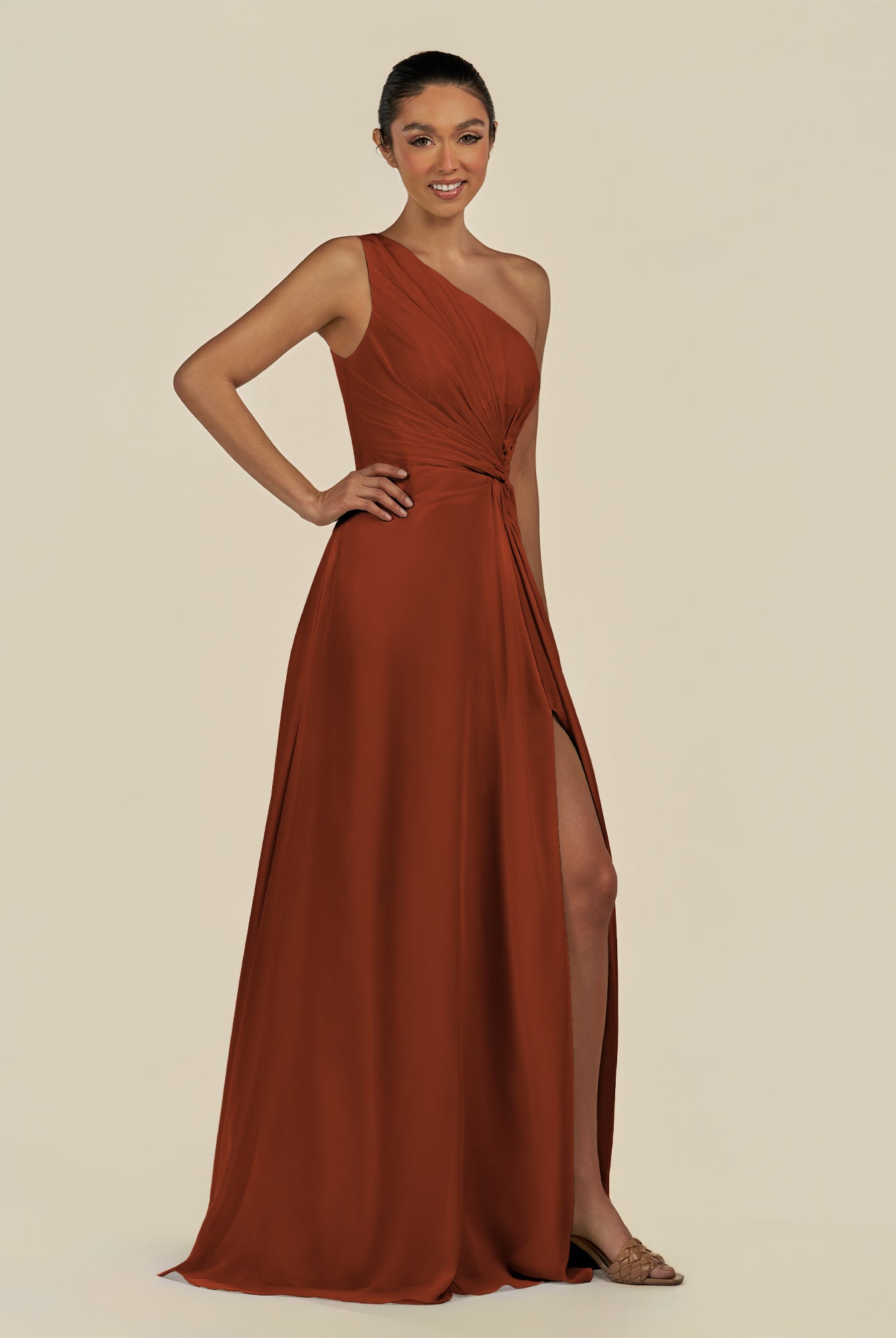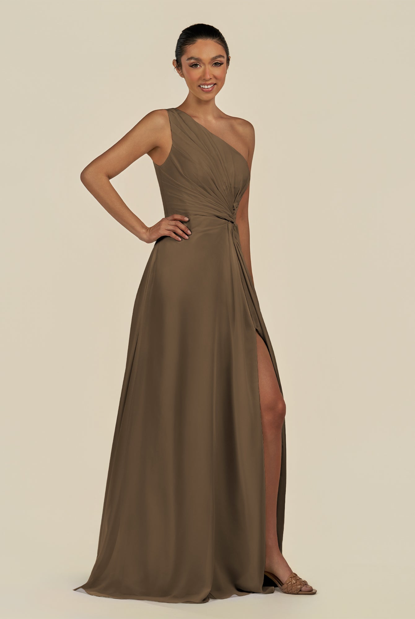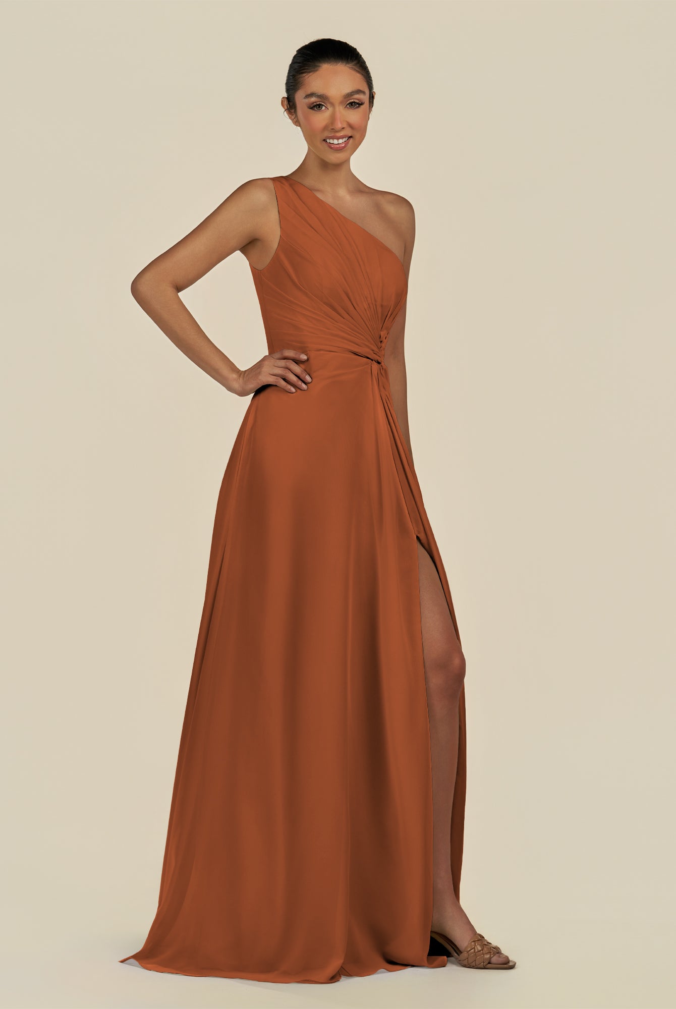 Gaela | Cinnamon - A Line One Shoulder Chiffon Pleated Long Bridesmaid Dress with Slit