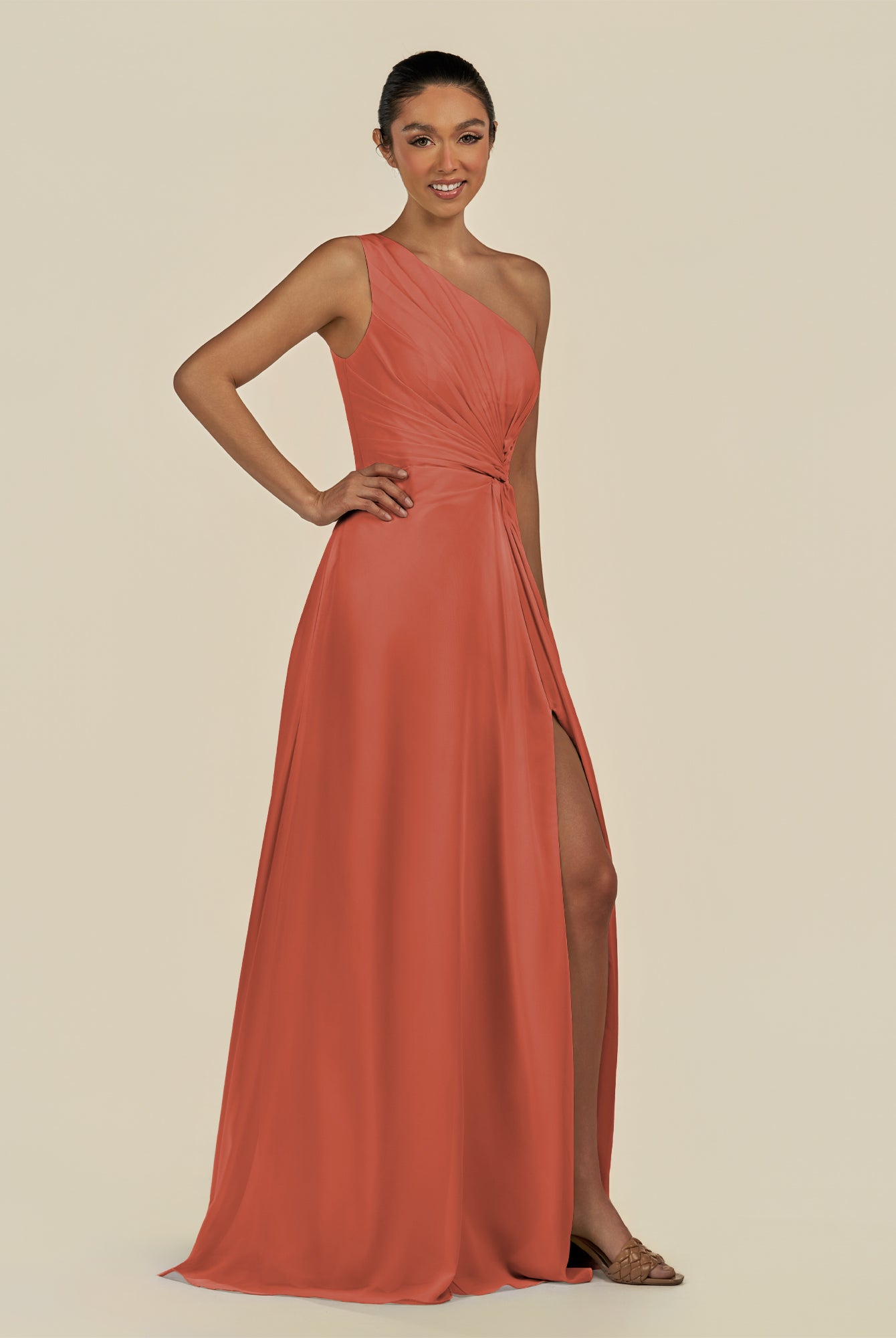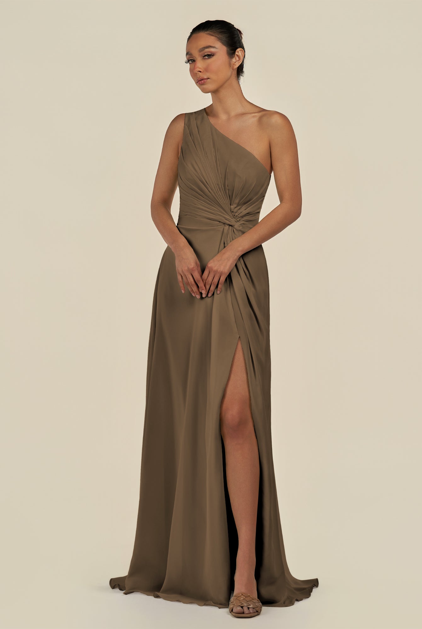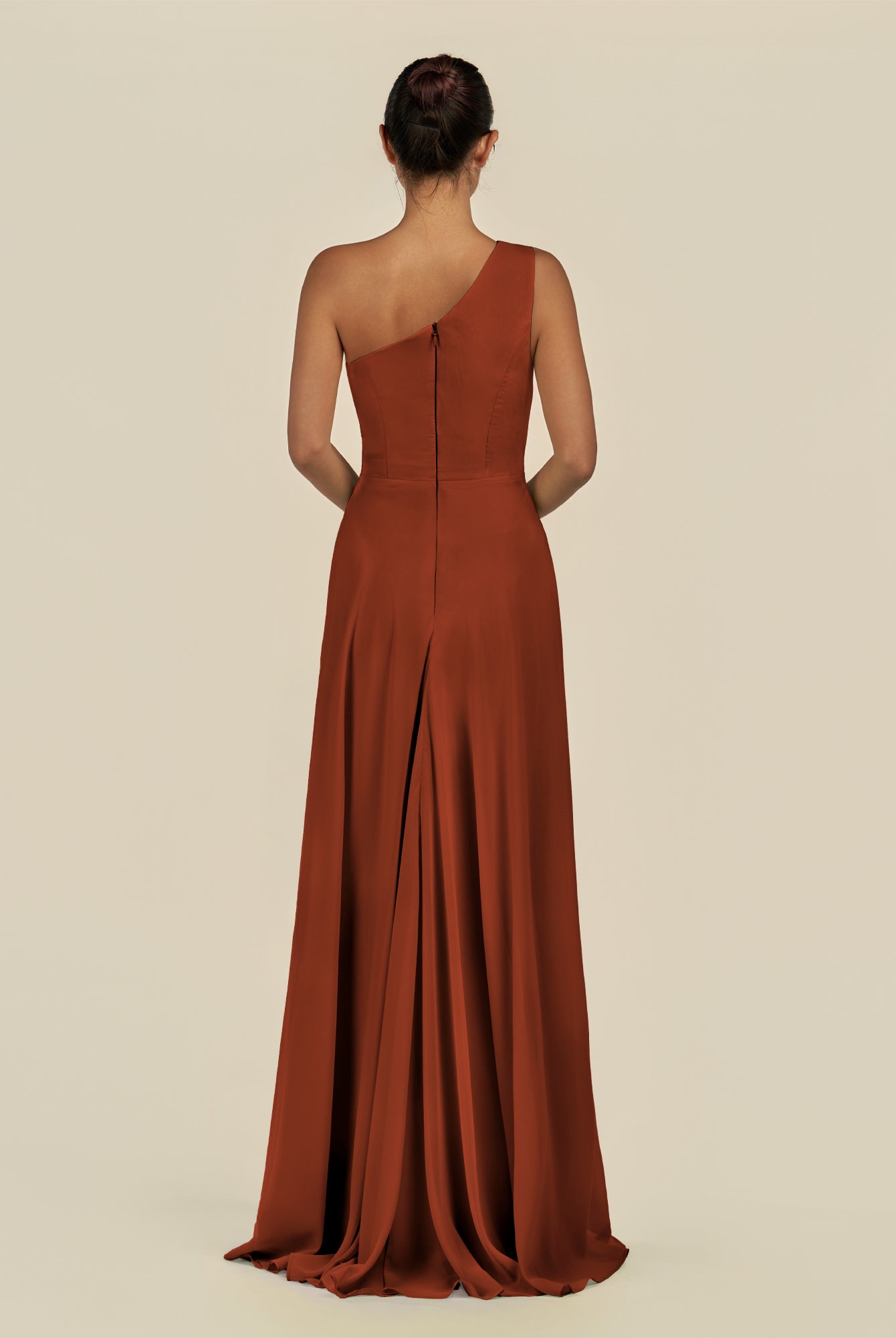 Gaela | Cinnamon - A Line One Shoulder Chiffon Pleated Long Bridesmaid Dress with Slit
