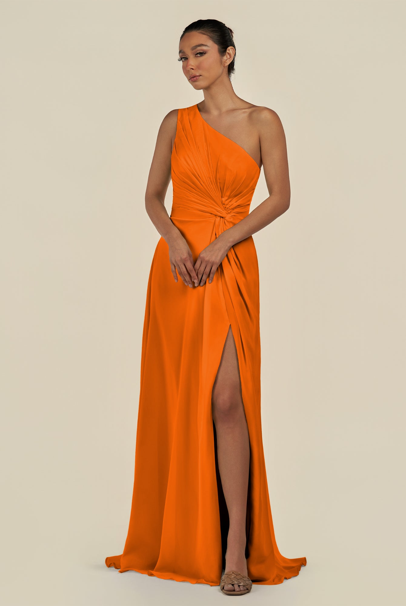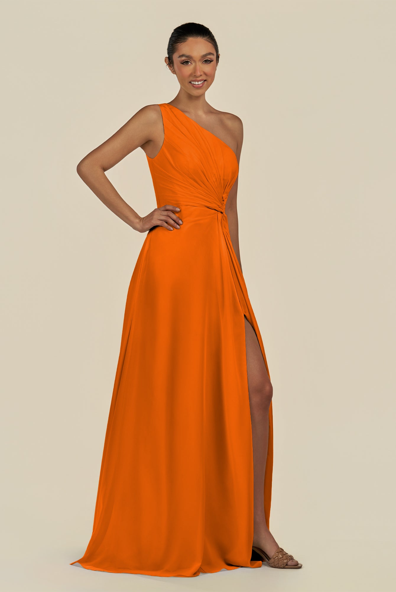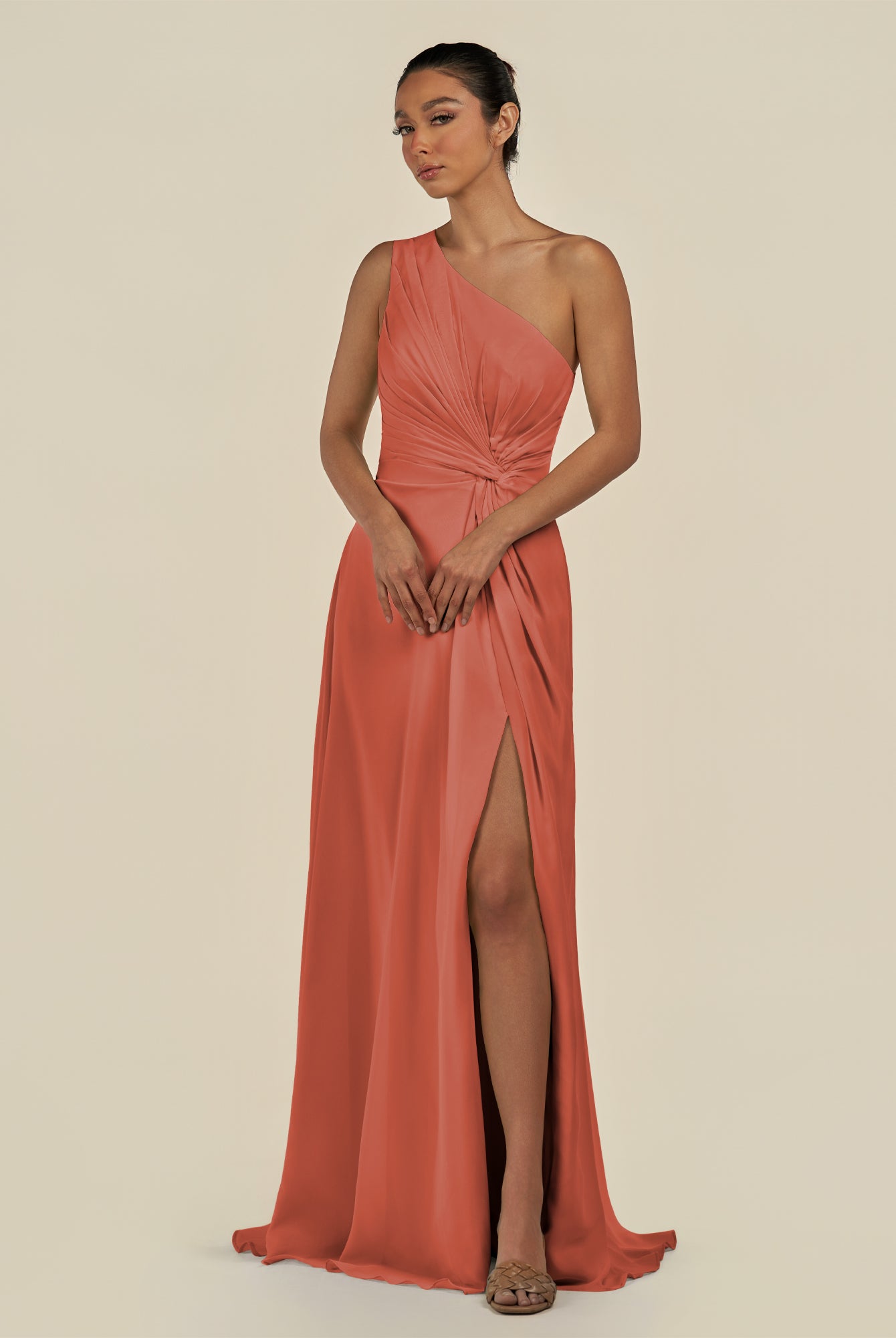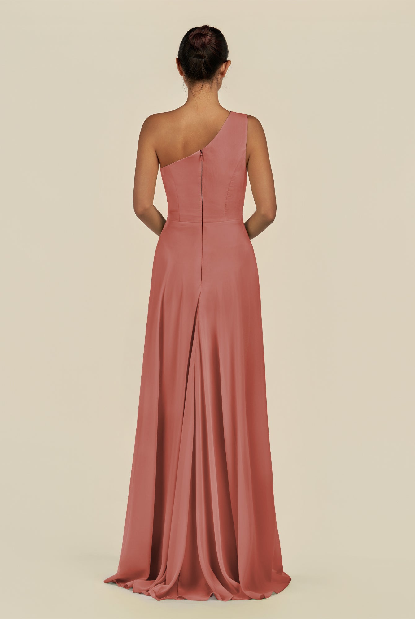 Gaela | Cinnamon - A Line One Shoulder Chiffon Pleated Long Bridesmaid Dress with Slit