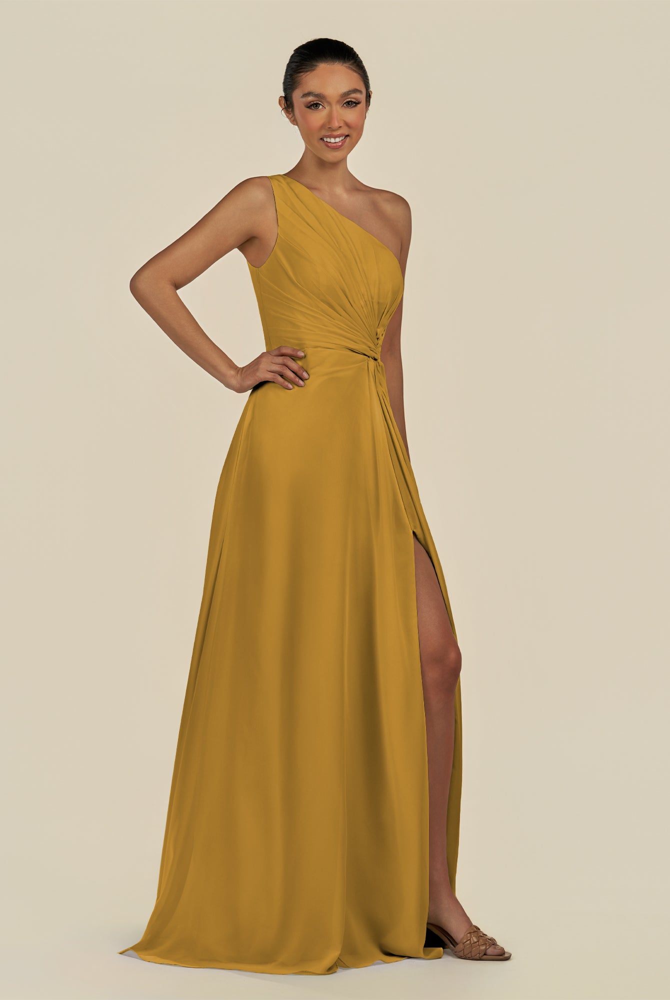 Gaela | Marigold - A Line One Shoulder Chiffon Pleated Long Bridesmaid Dress with Slit