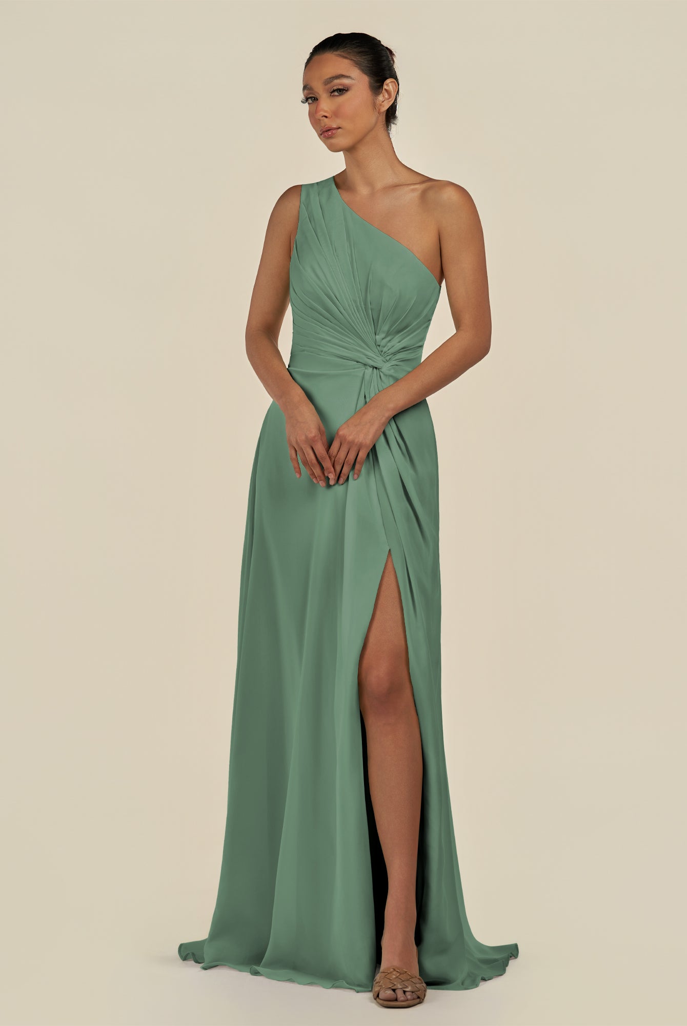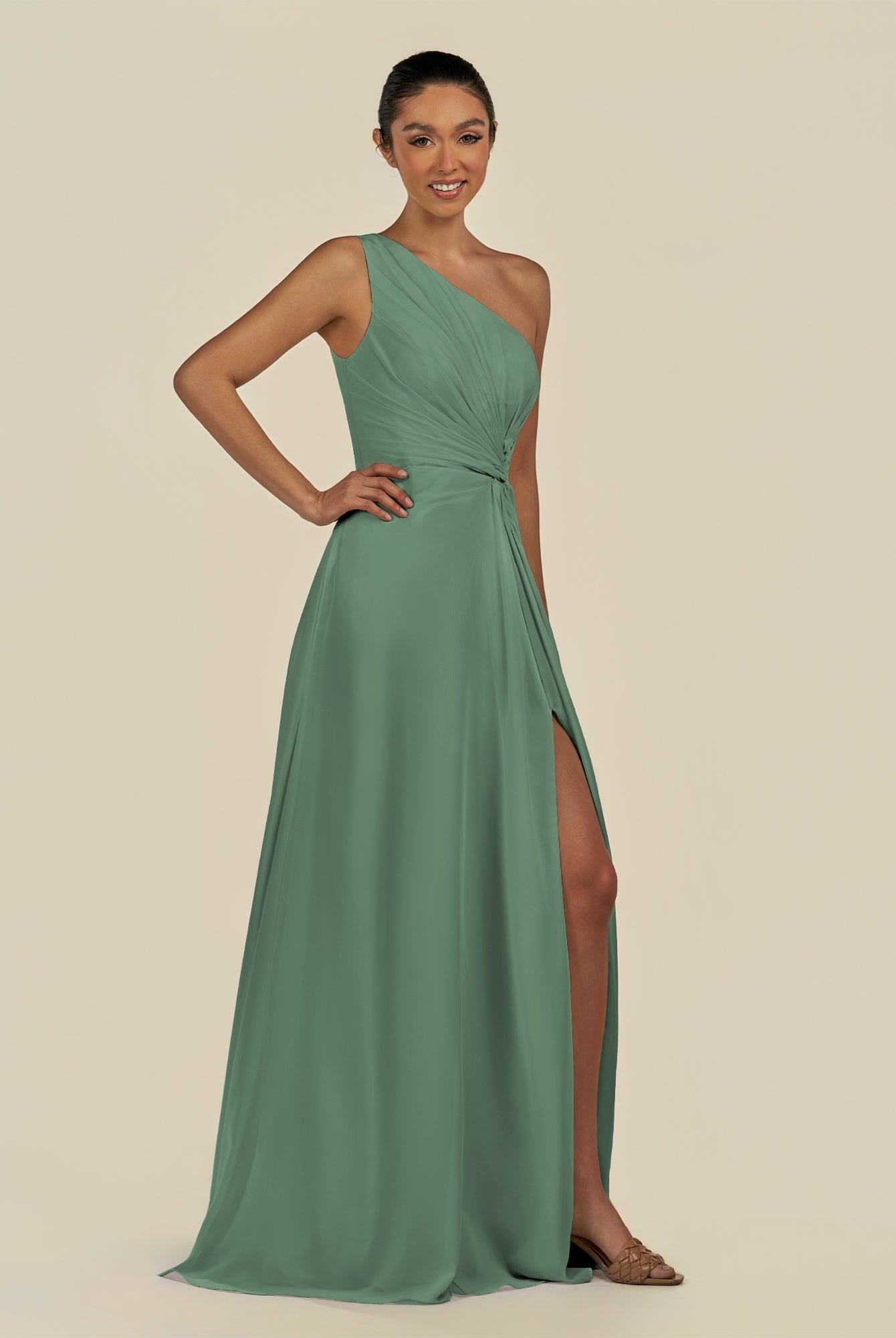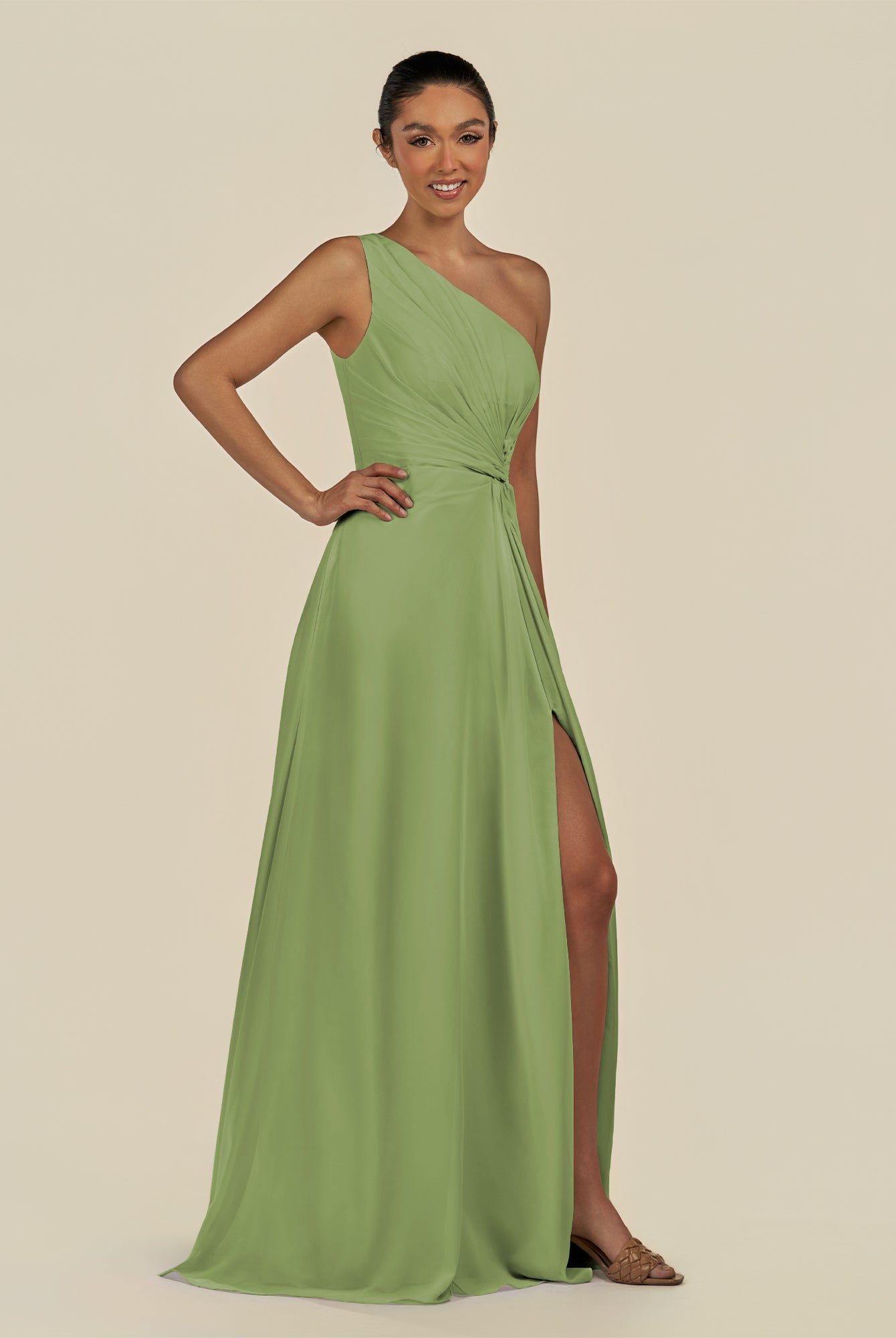 Gaela | Matcha - A Line One Shoulder Chiffon Pleated Long Bridesmaid Dress with Slit
