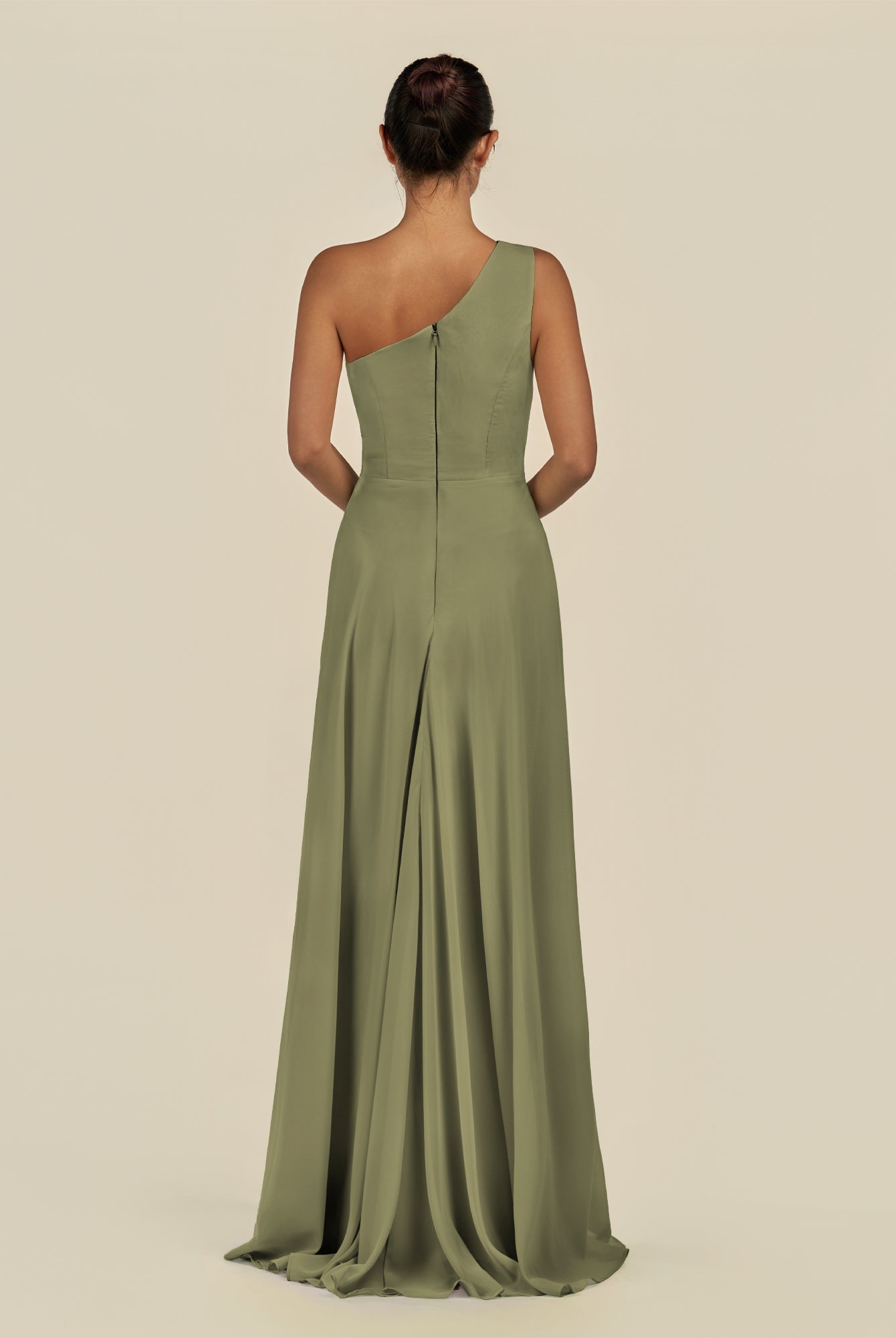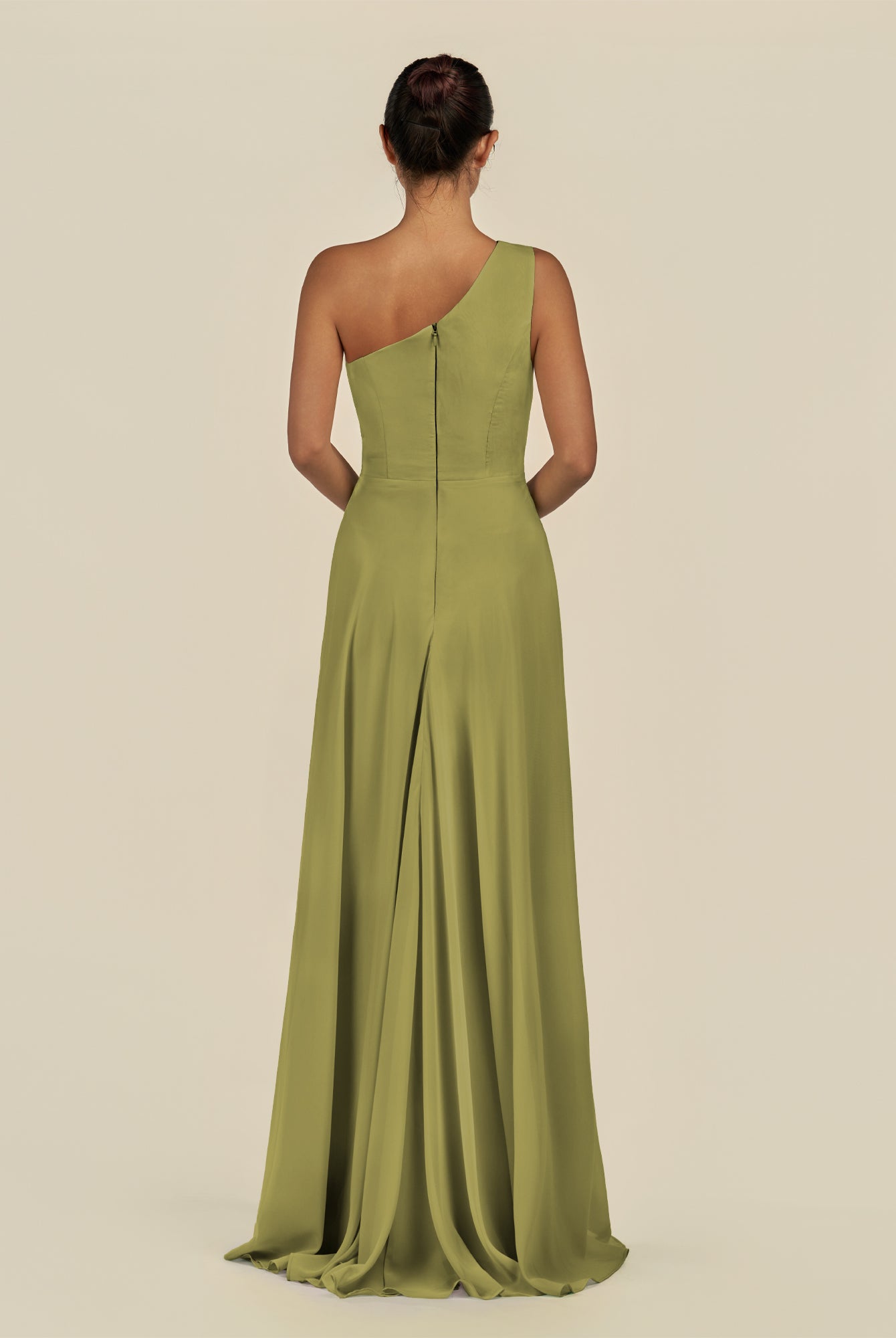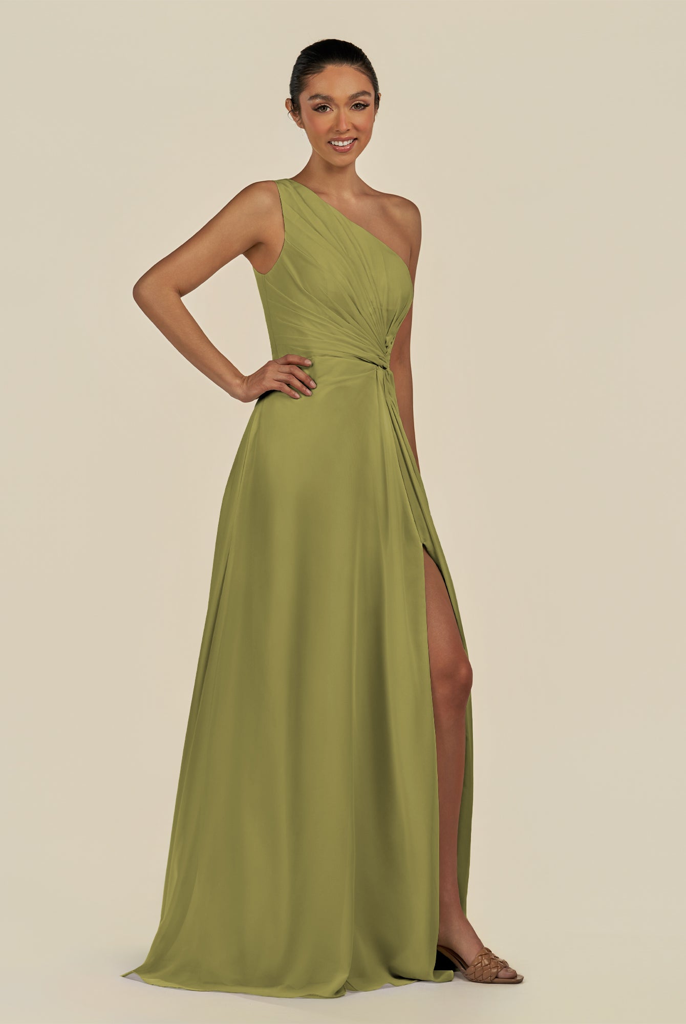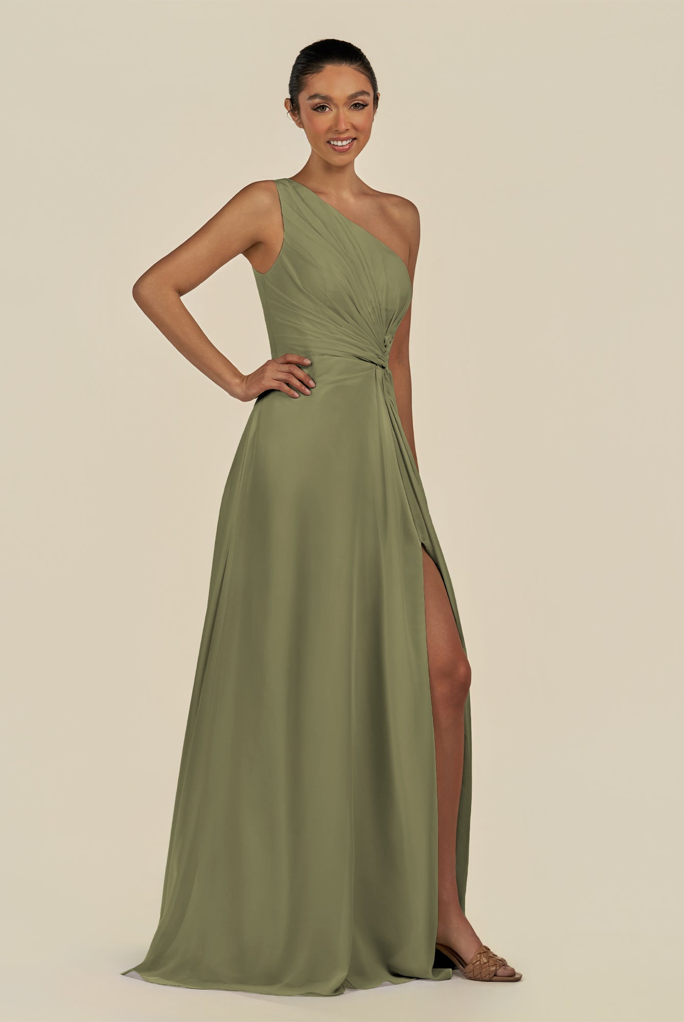 Gaela | Olive - A Line One Shoulder Chiffon Pleated Long Bridesmaid Dress with Slit