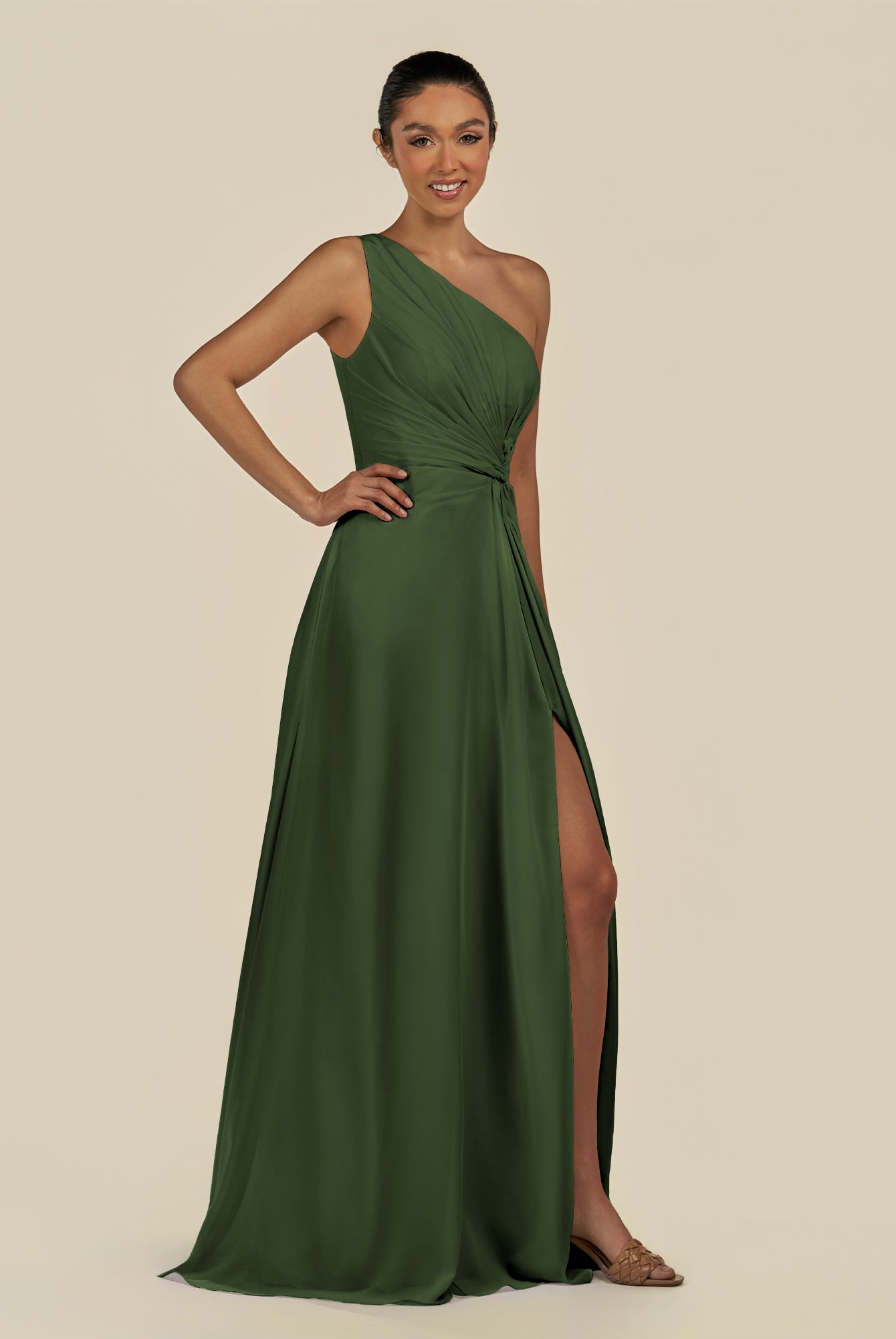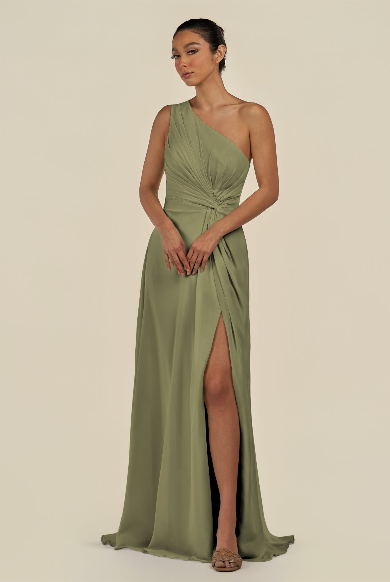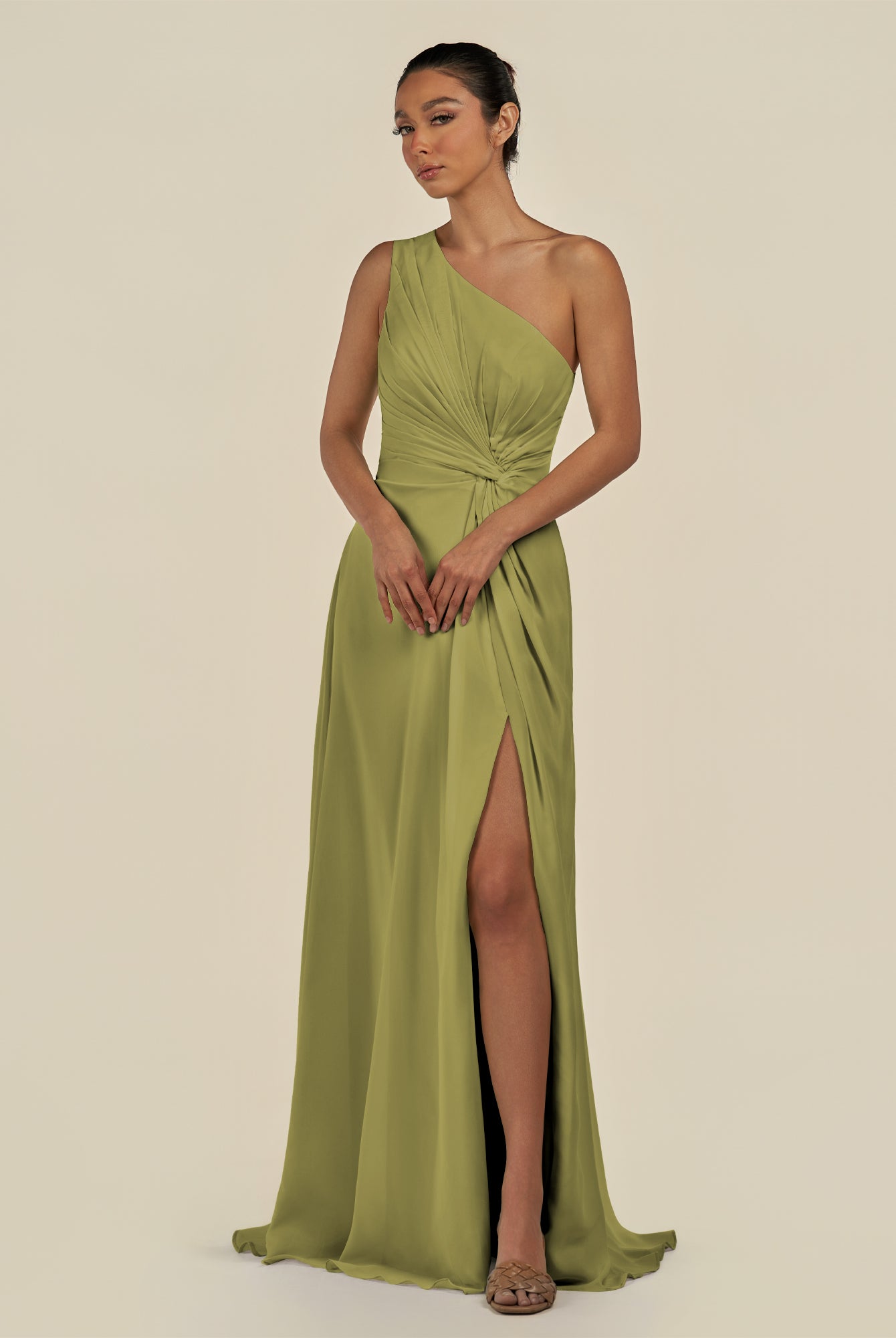 Gaela | Olive - A Line One Shoulder Chiffon Pleated Long Bridesmaid Dress with Slit