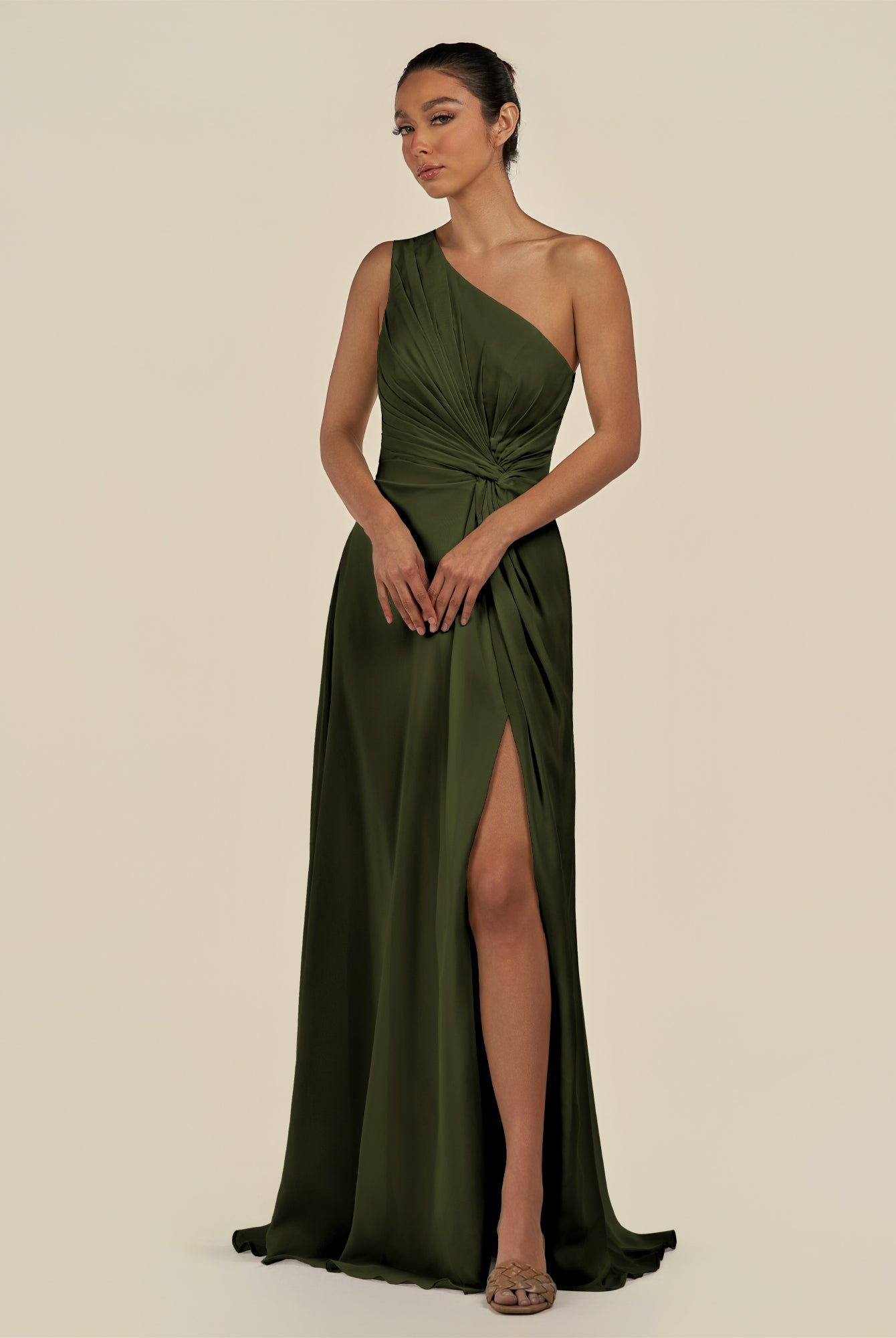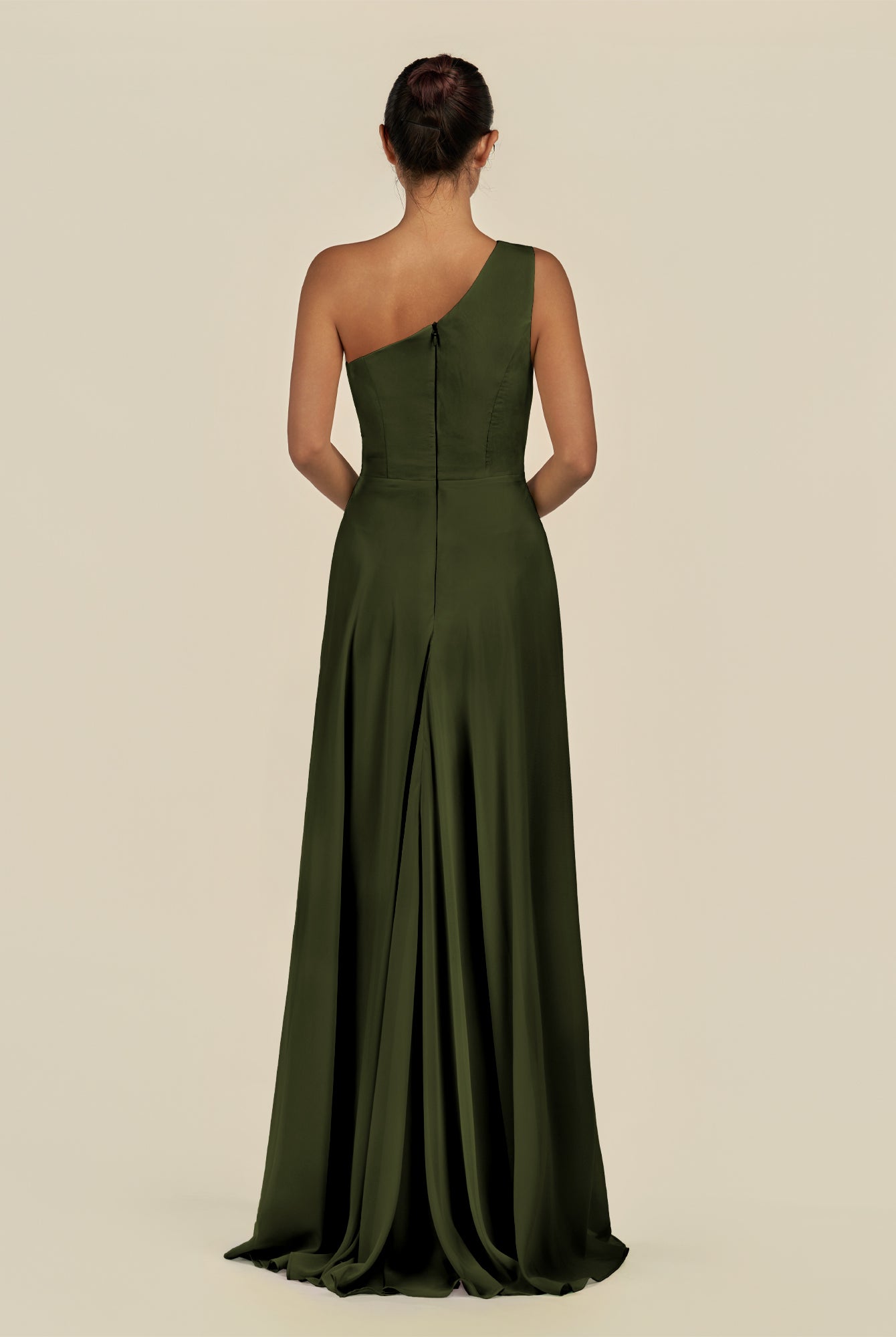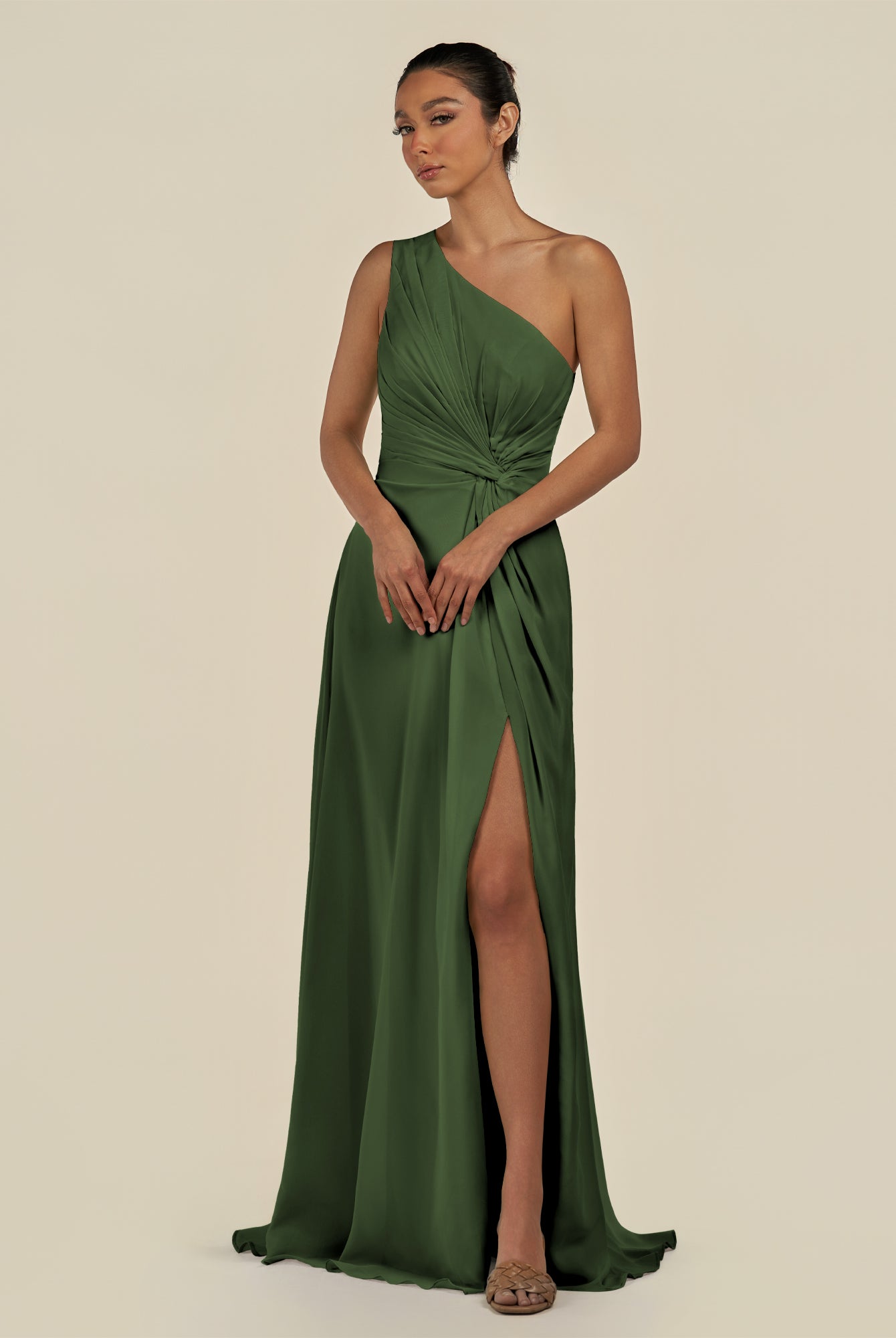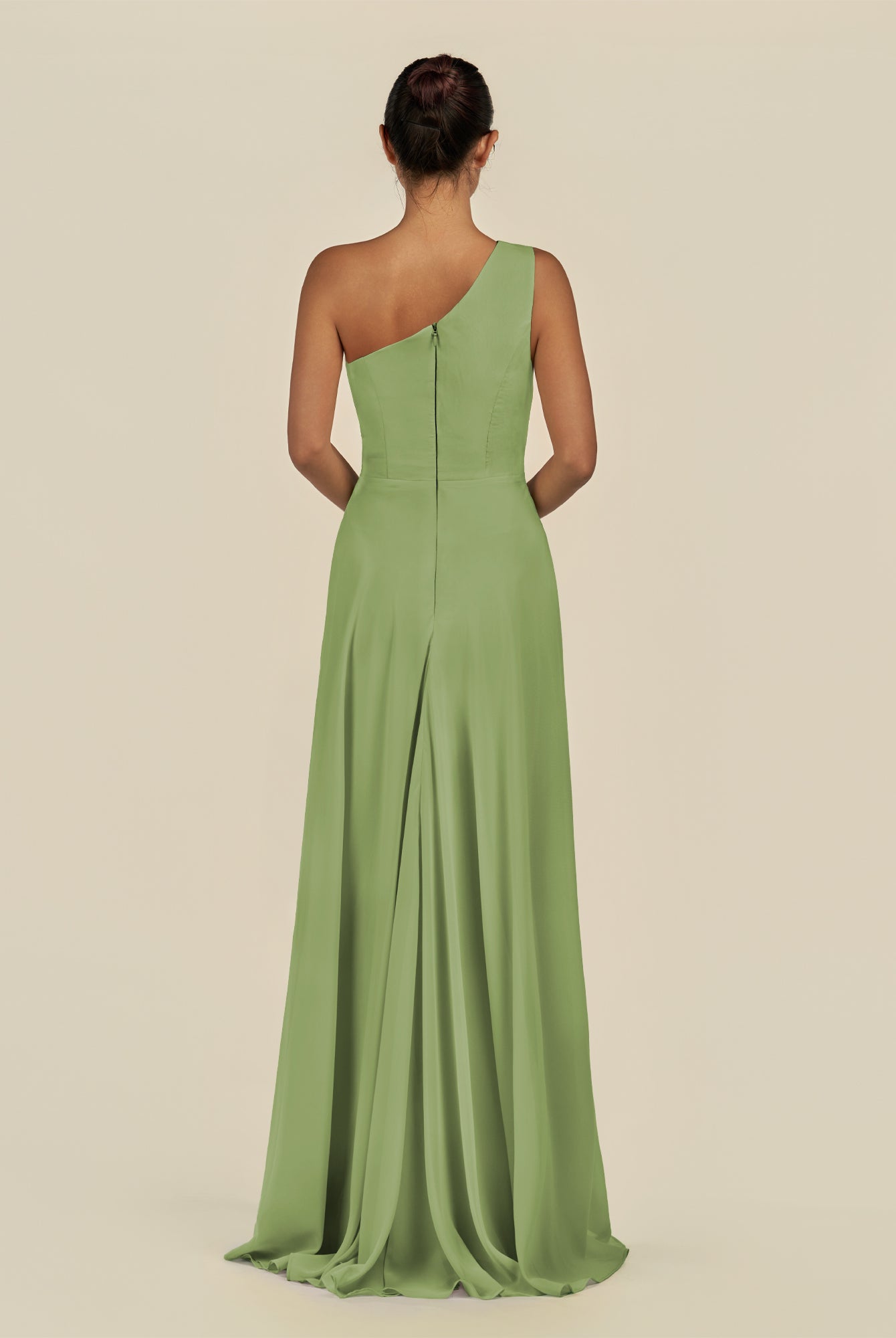 Gaela | Olive - A Line One Shoulder Chiffon Pleated Long Bridesmaid Dress with Slit