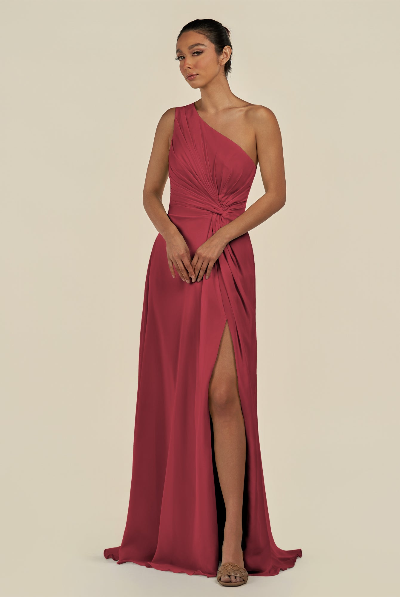 Gaela | Wild Rose - A Line One Shoulder Chiffon Pleated Long Bridesmaid Dress with Slit