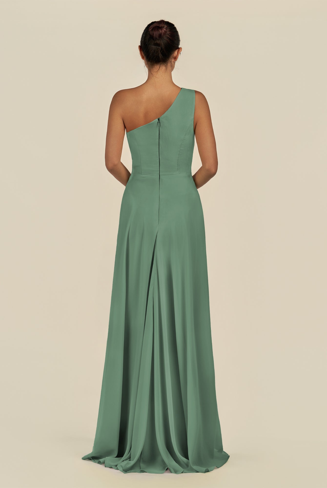 Gaela | Willow Green - A Line One Shoulder Chiffon Pleated Long Bridesmaid Dress with Slit
