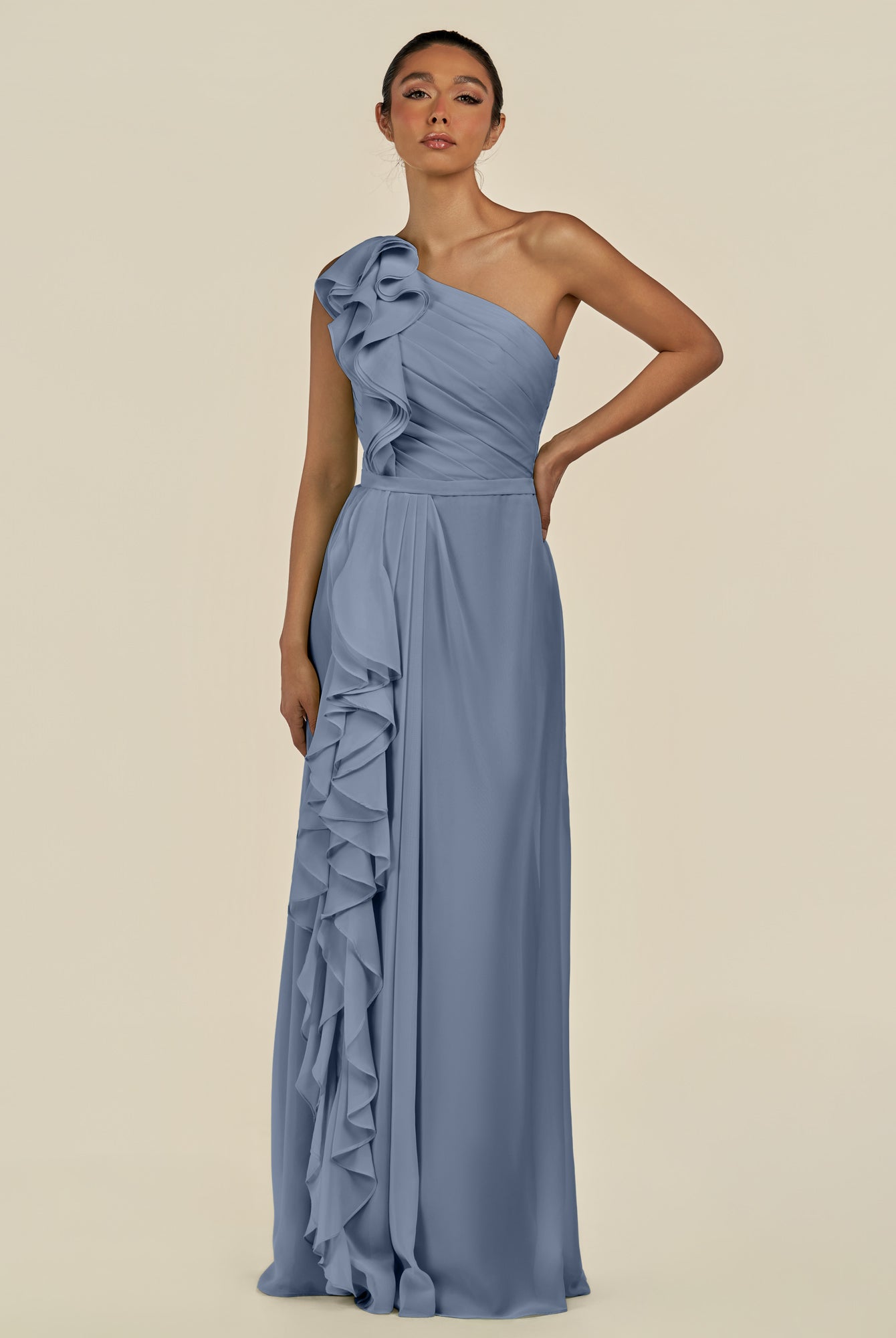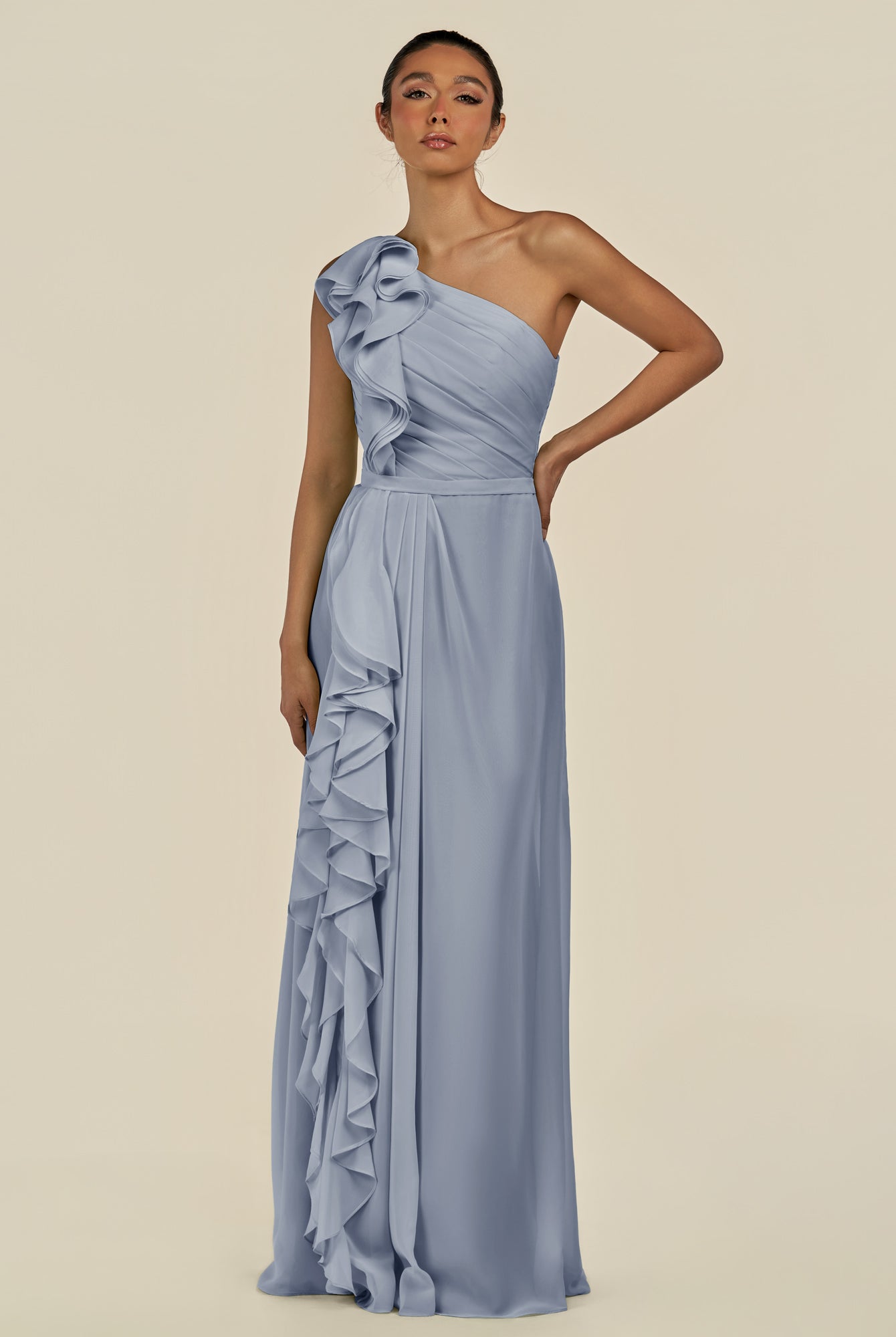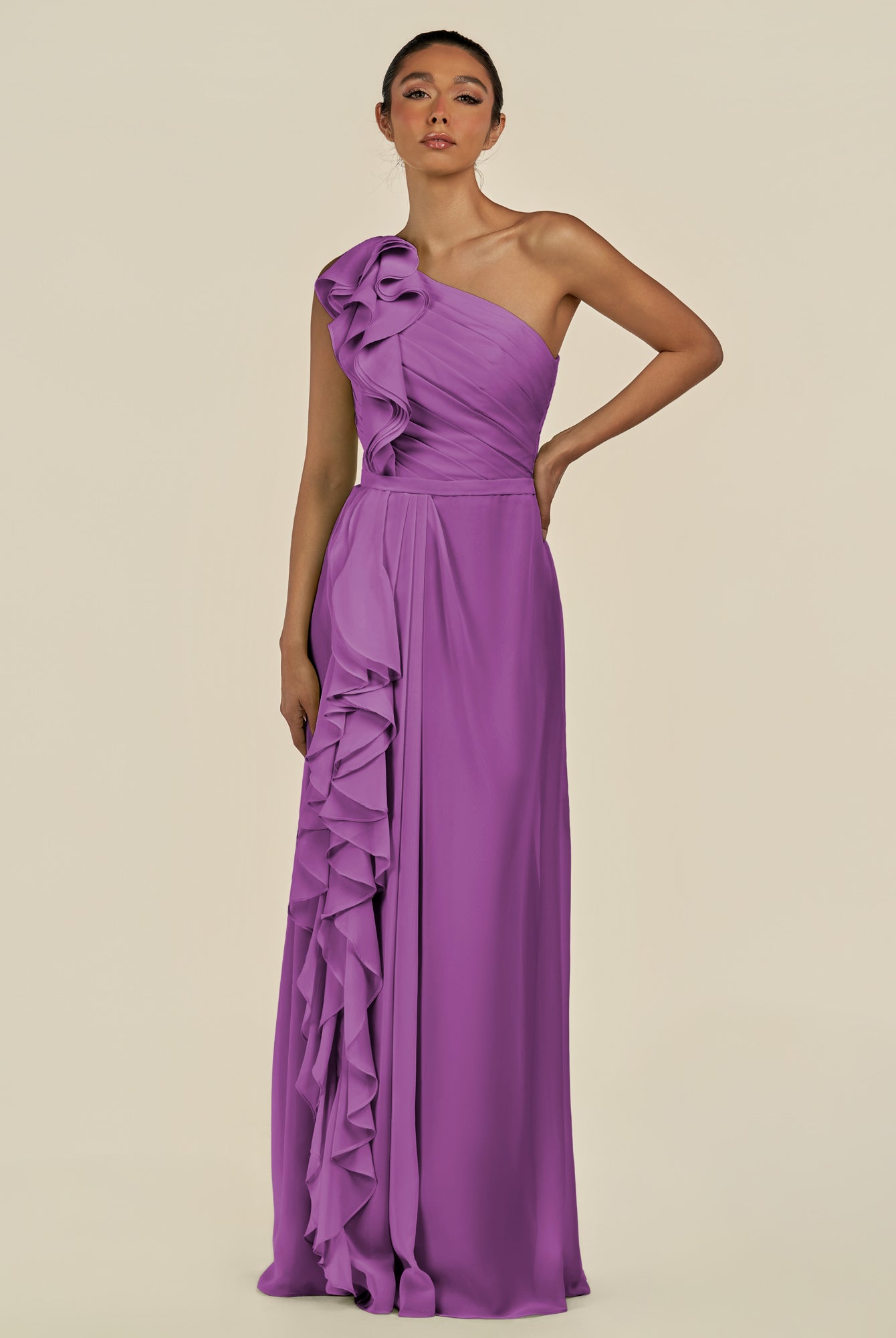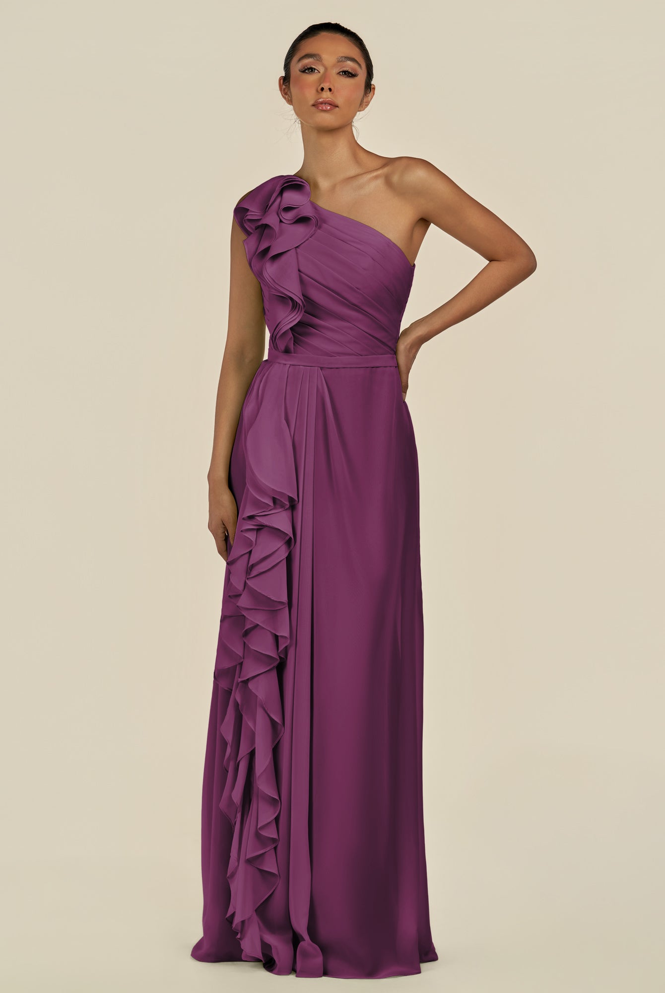 Assou | Fig - A Line One Shoulder Chiffon Pleated Ruffles Long Bridesmaid Dress with Slit
