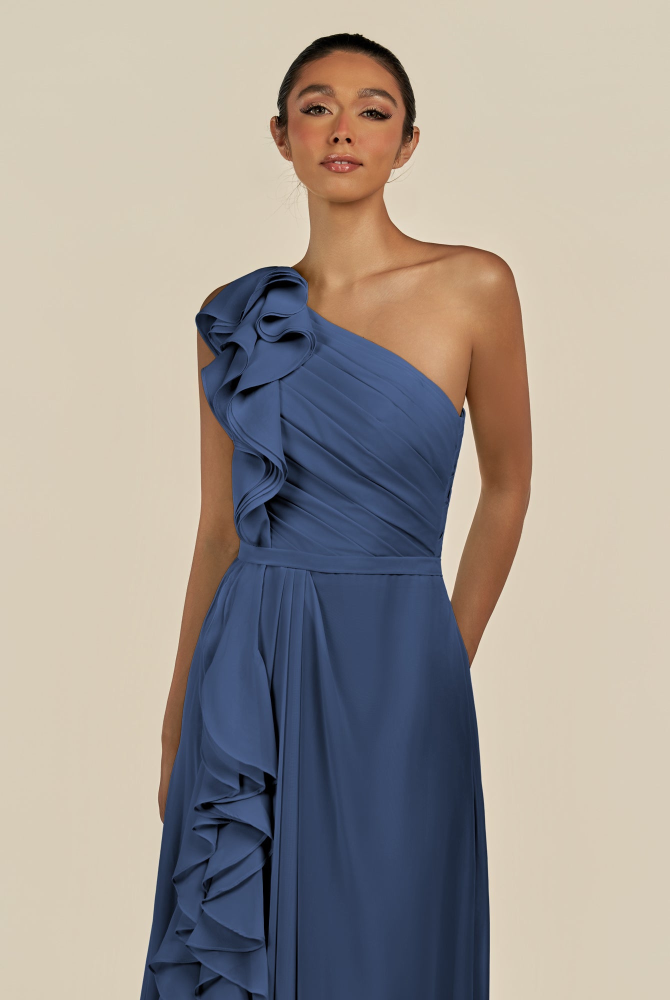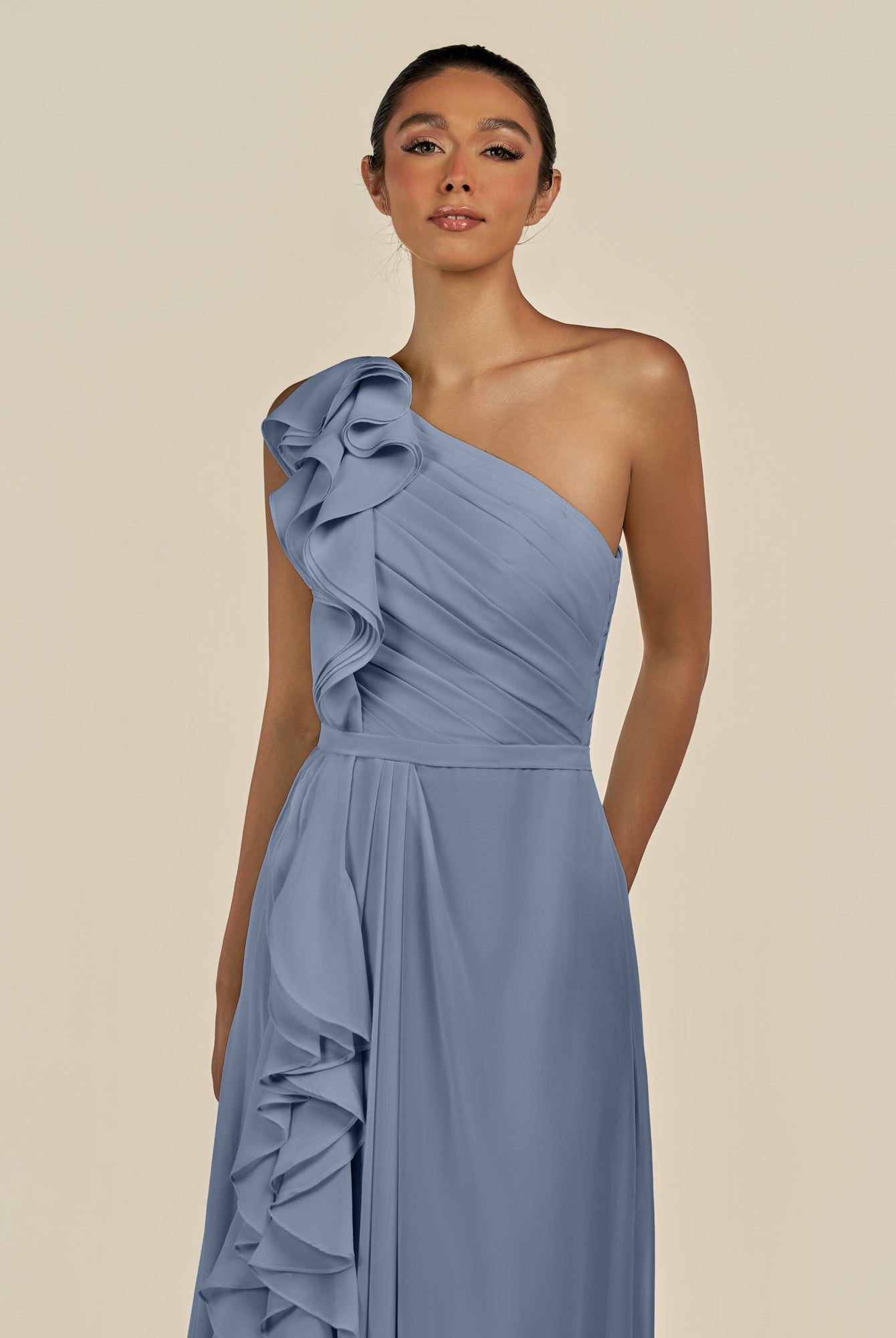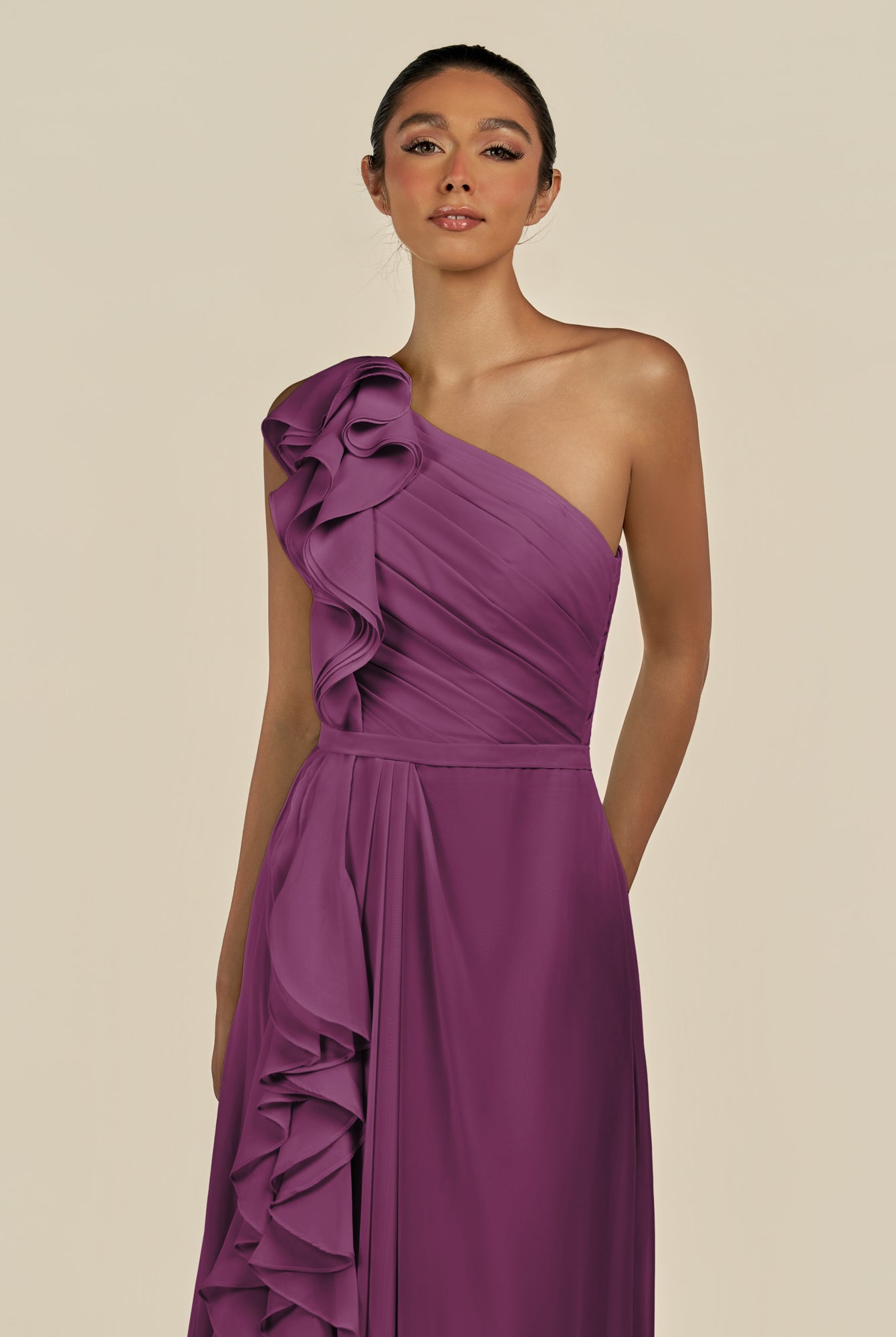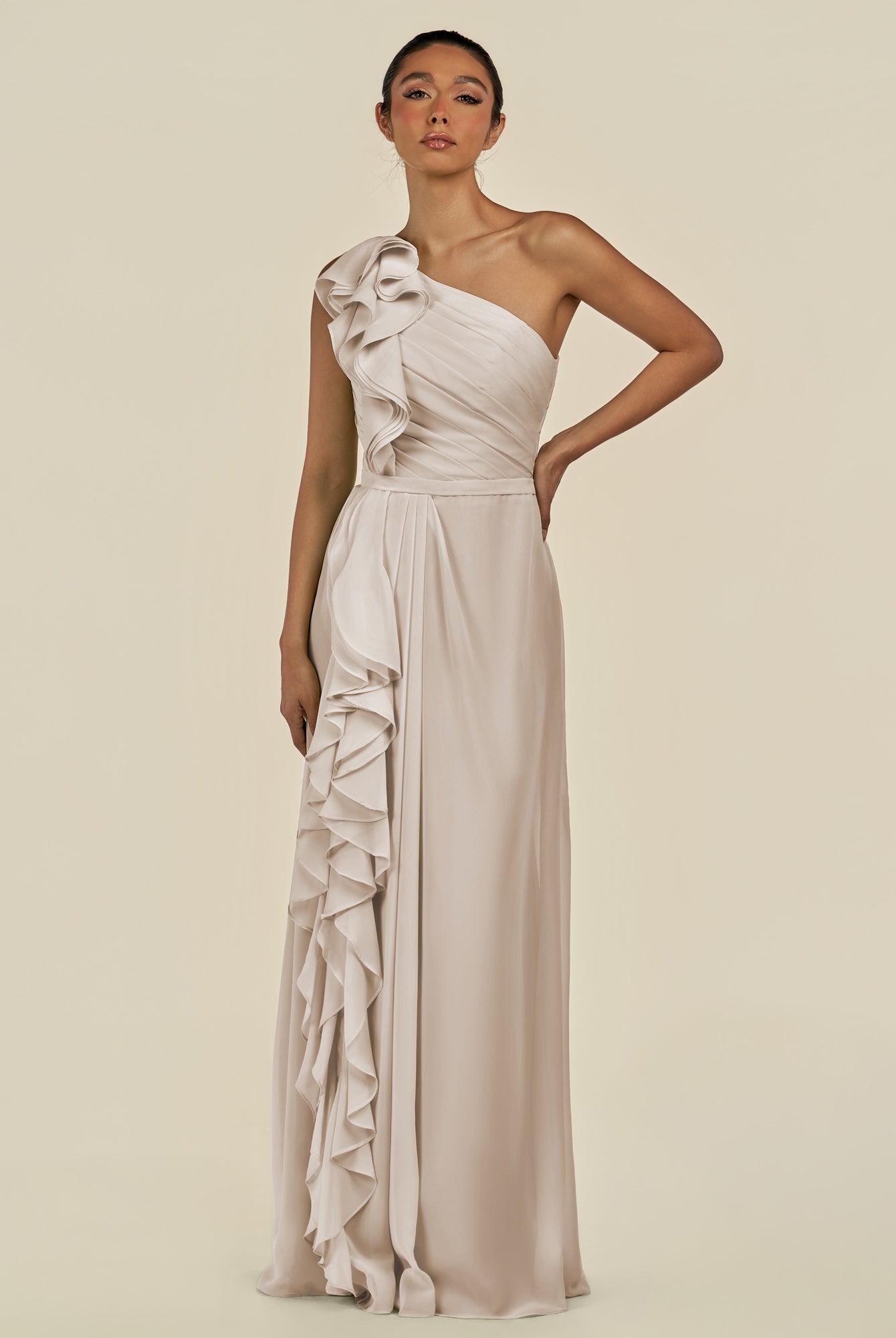 Assou | Fig - A Line One Shoulder Chiffon Pleated Ruffles Long Bridesmaid Dress with Slit
