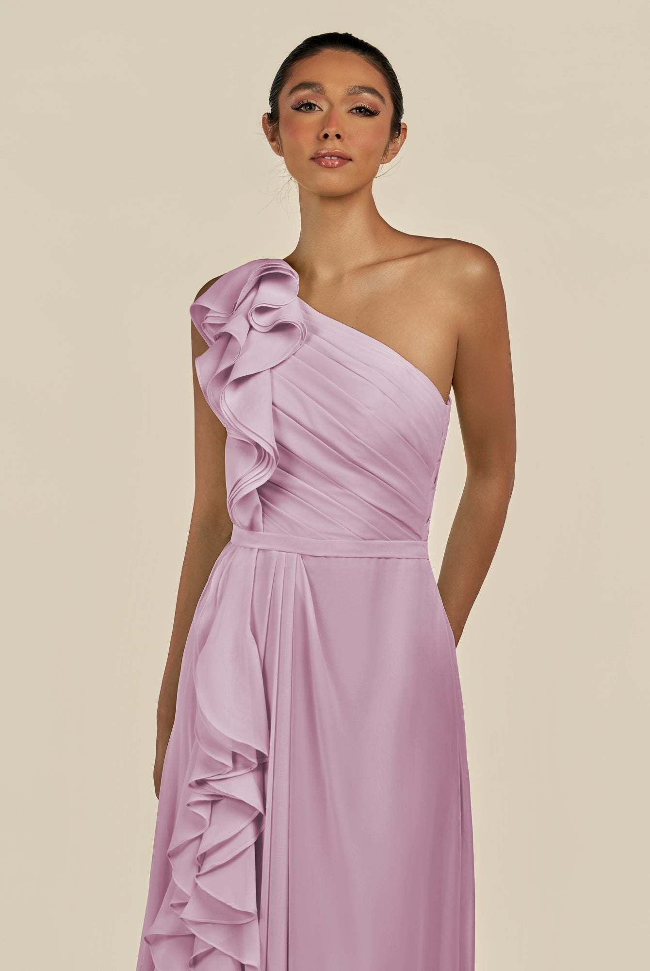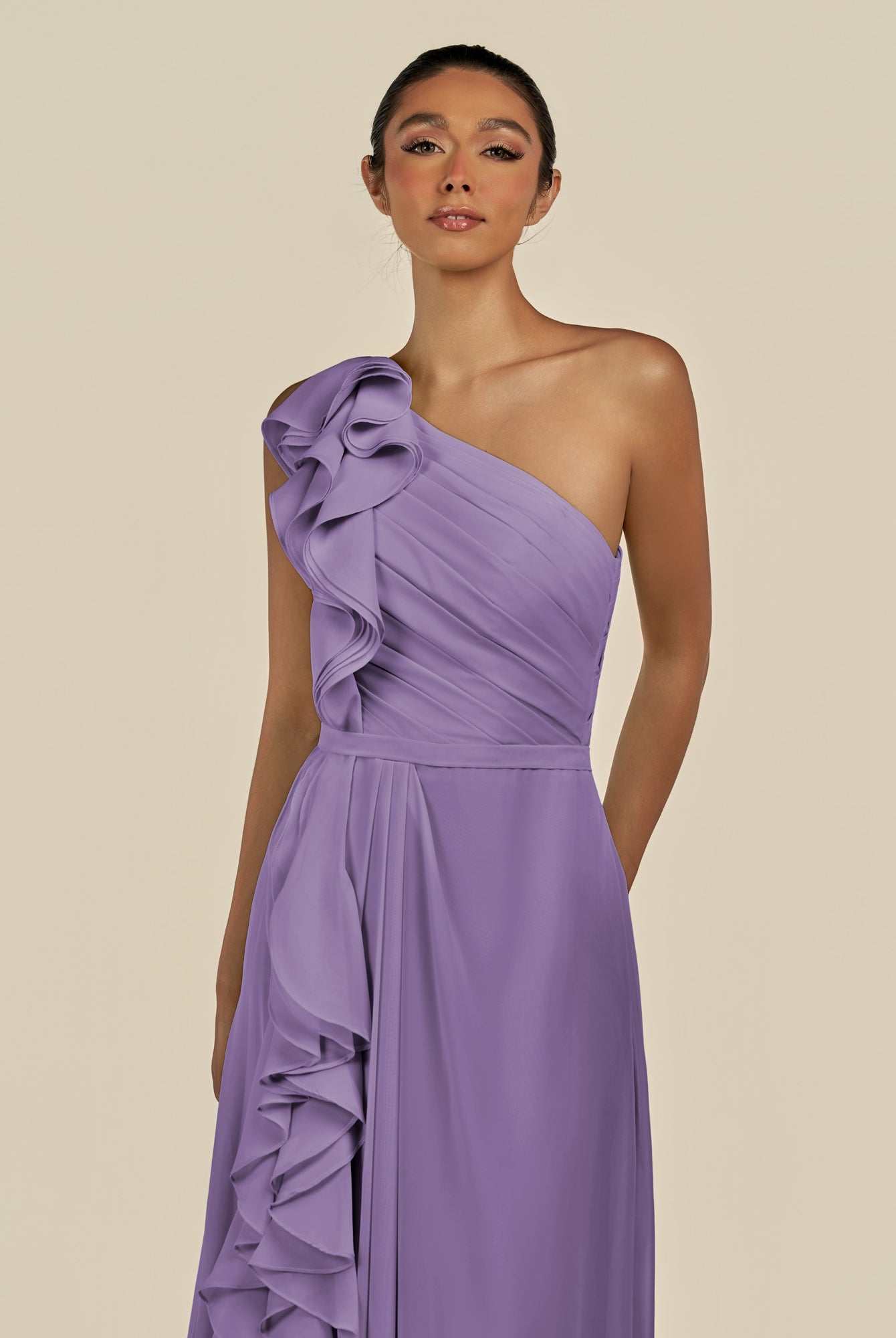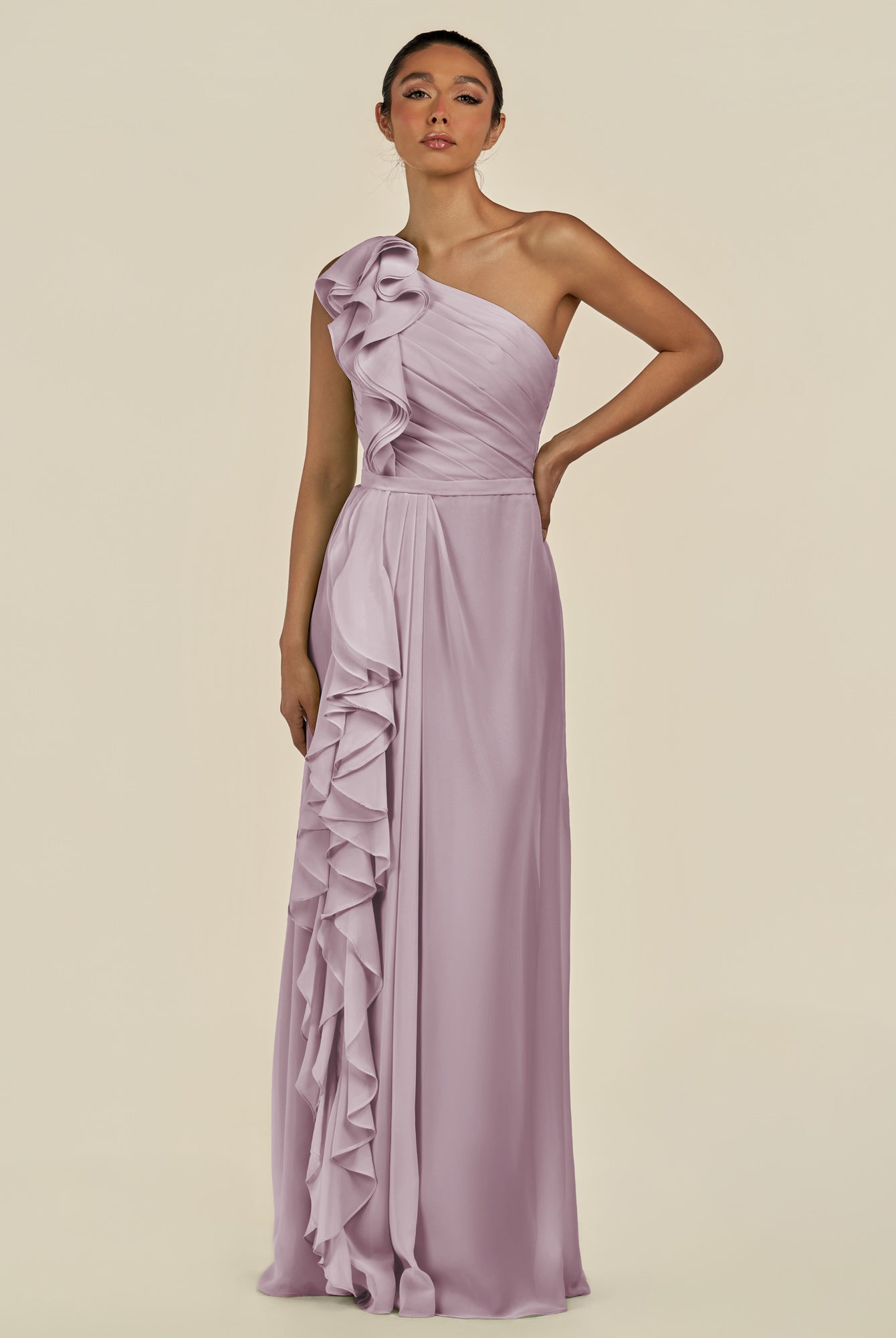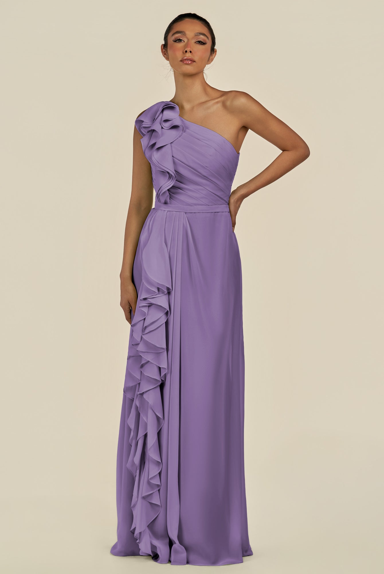 Assou | Wisteria - A Line One Shoulder Chiffon Pleated Ruffles Long Bridesmaid Dress with Slit