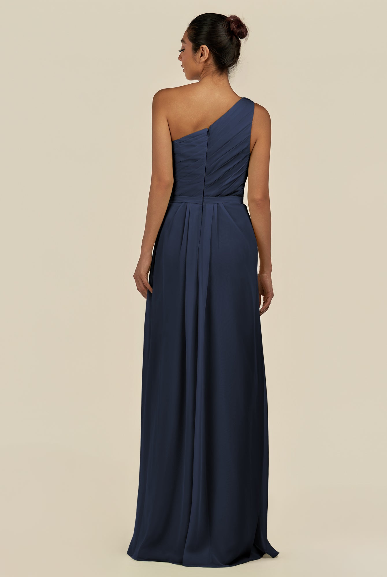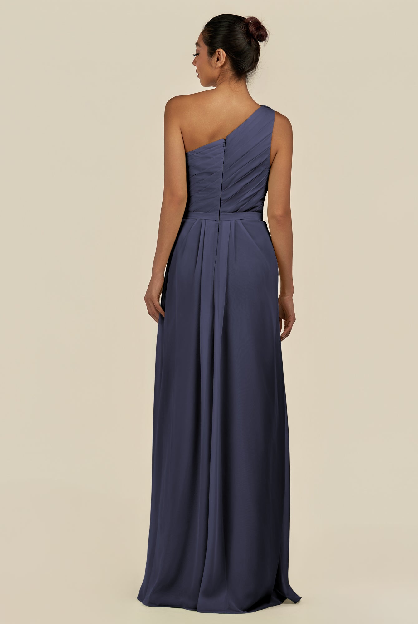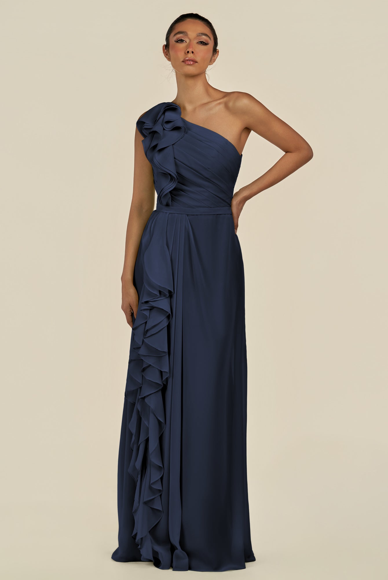 Assou | Navy - A Line One Shoulder Chiffon Pleated Ruffles Long Bridesmaid Dress with Slit