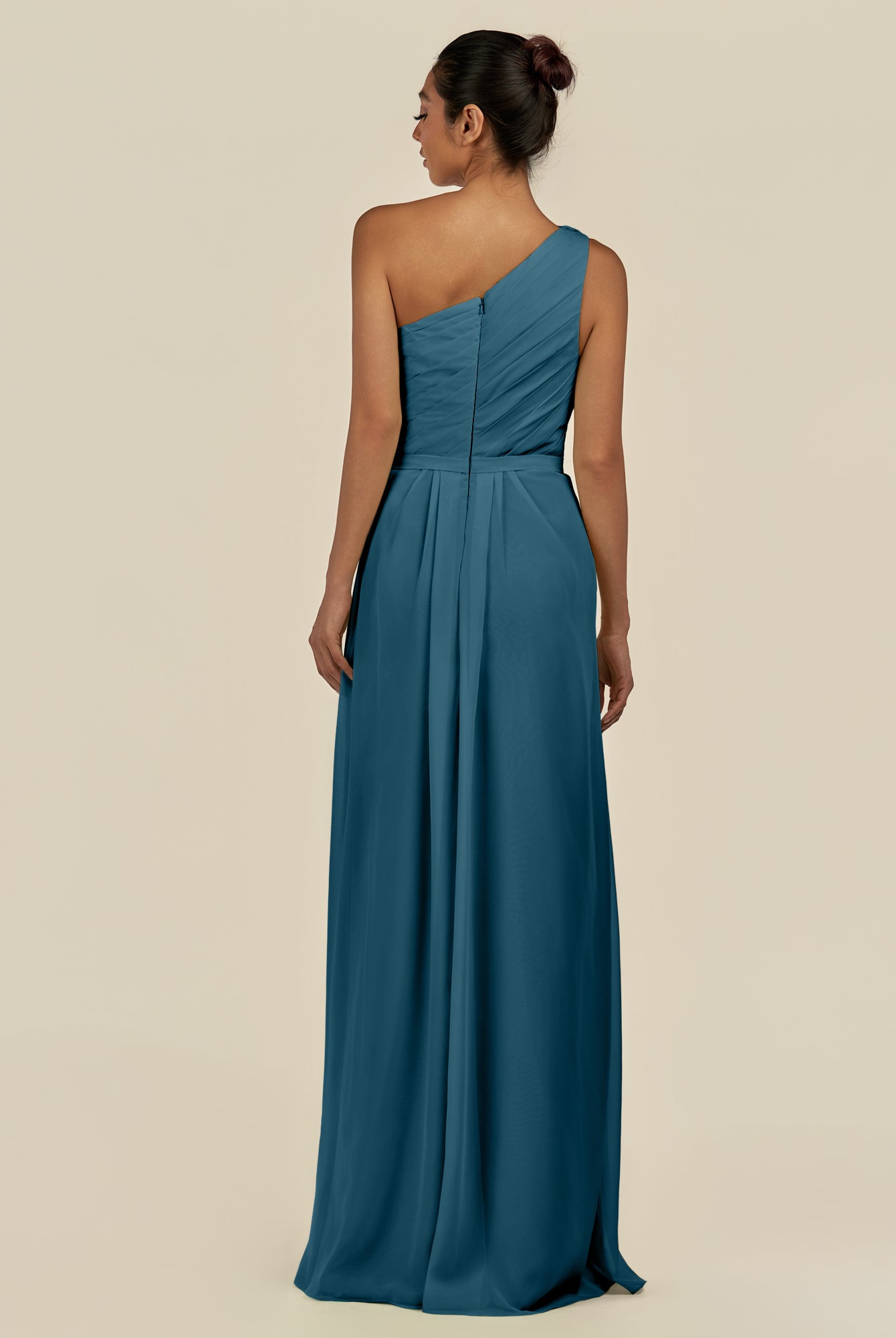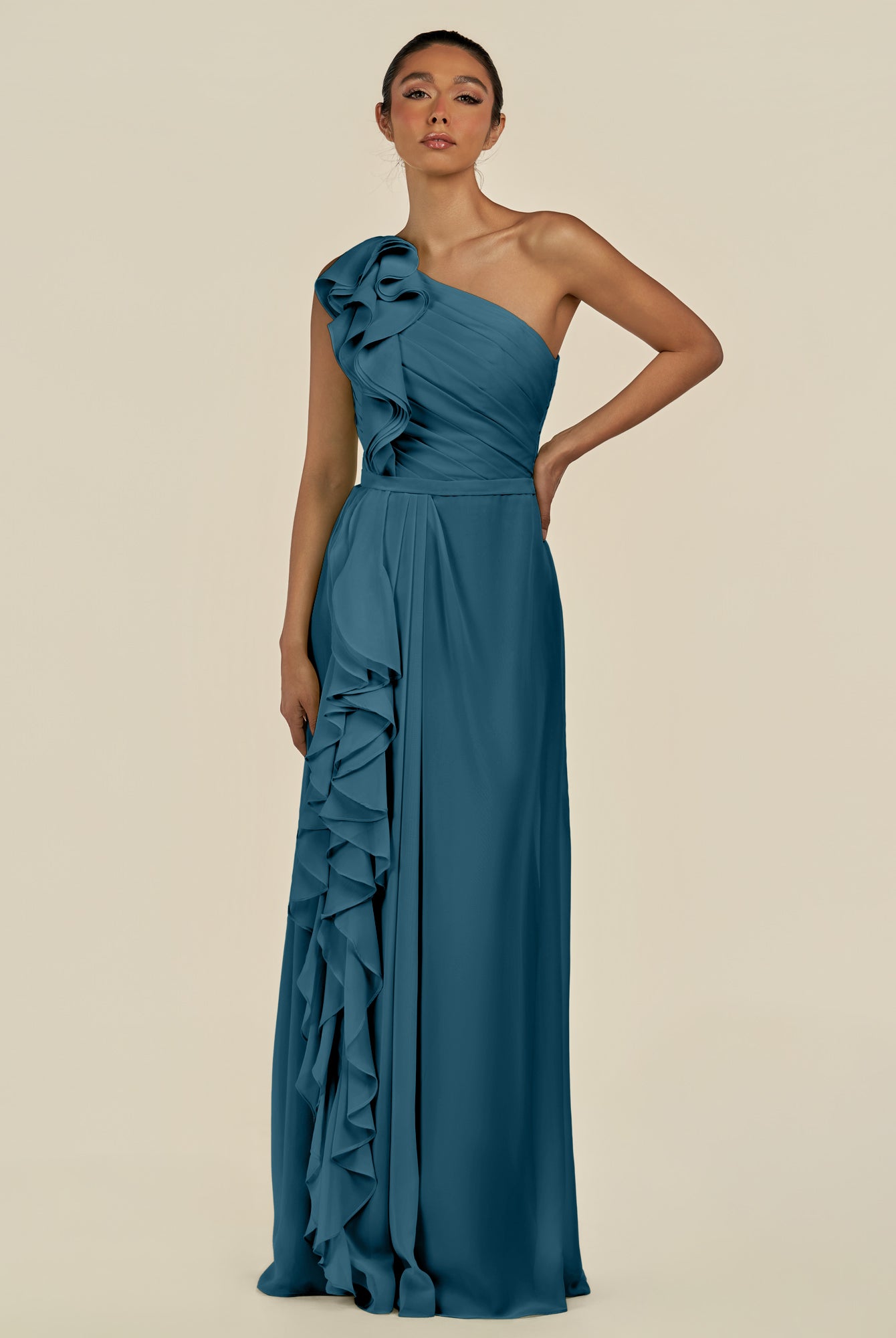 Assou | Dark Teal - A Line One Shoulder Chiffon Pleated Ruffles Long Bridesmaid Dress with Slit