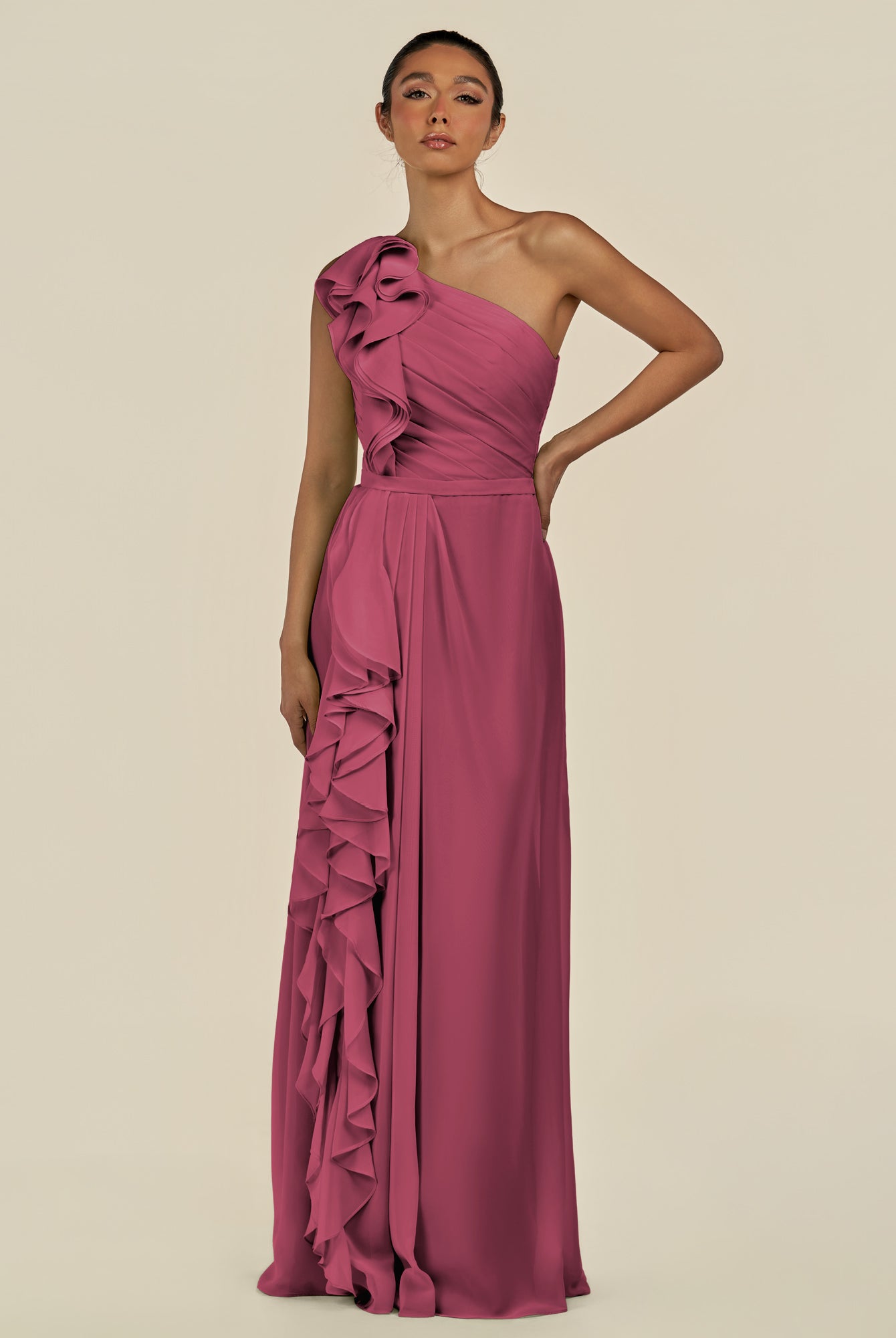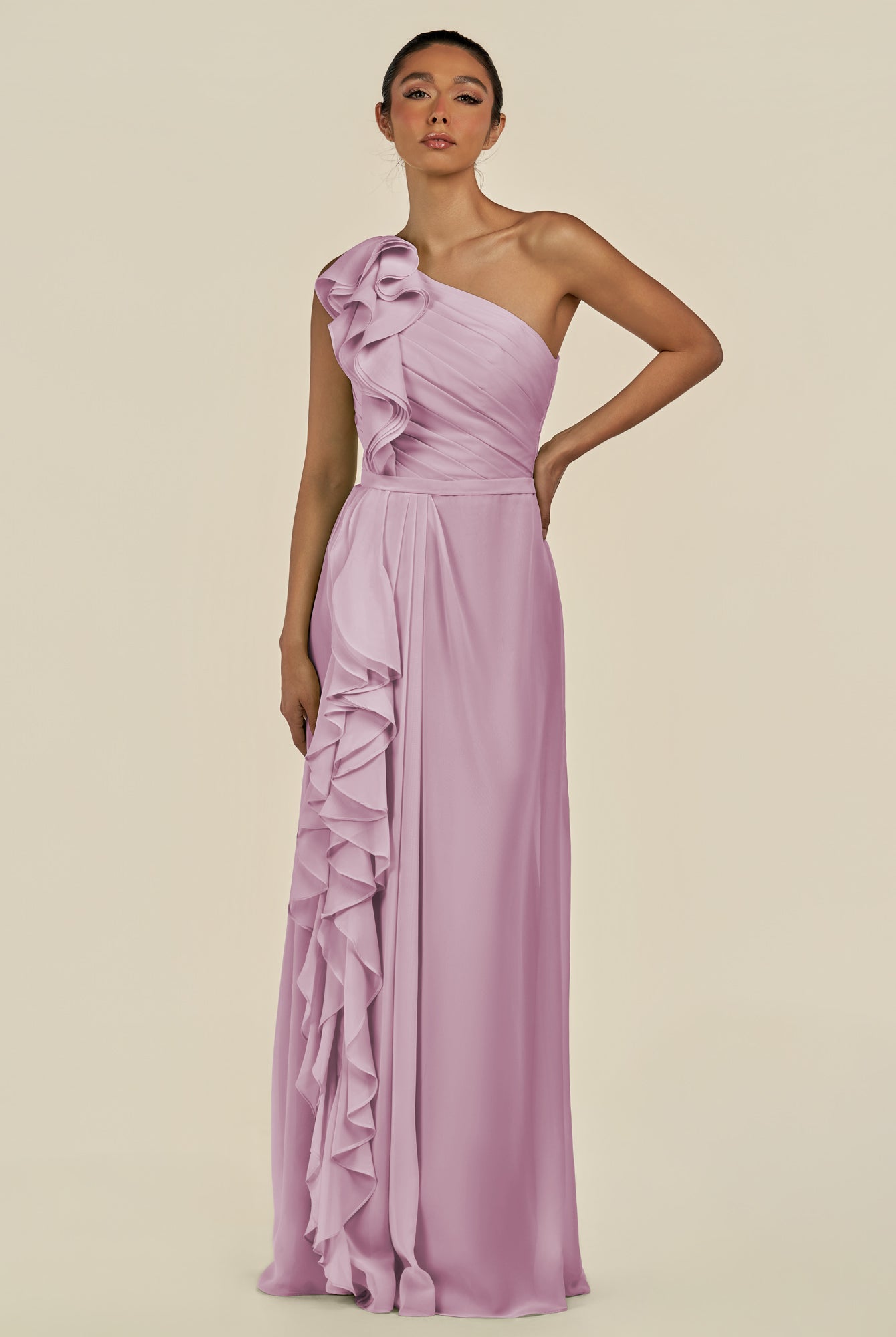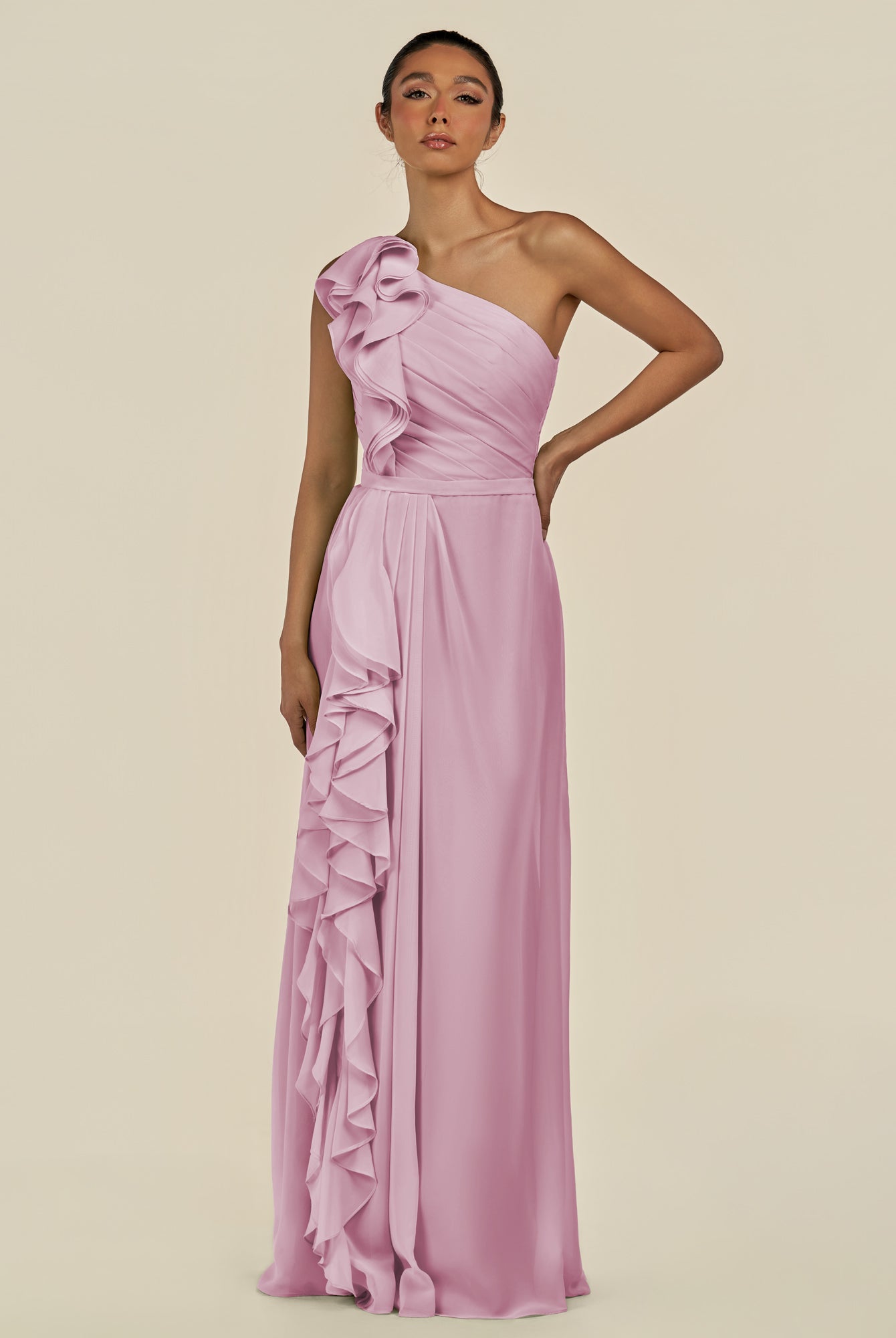 Assou | Desert Rose - A Line One Shoulder Chiffon Pleated Ruffles Long Bridesmaid Dress with Slit