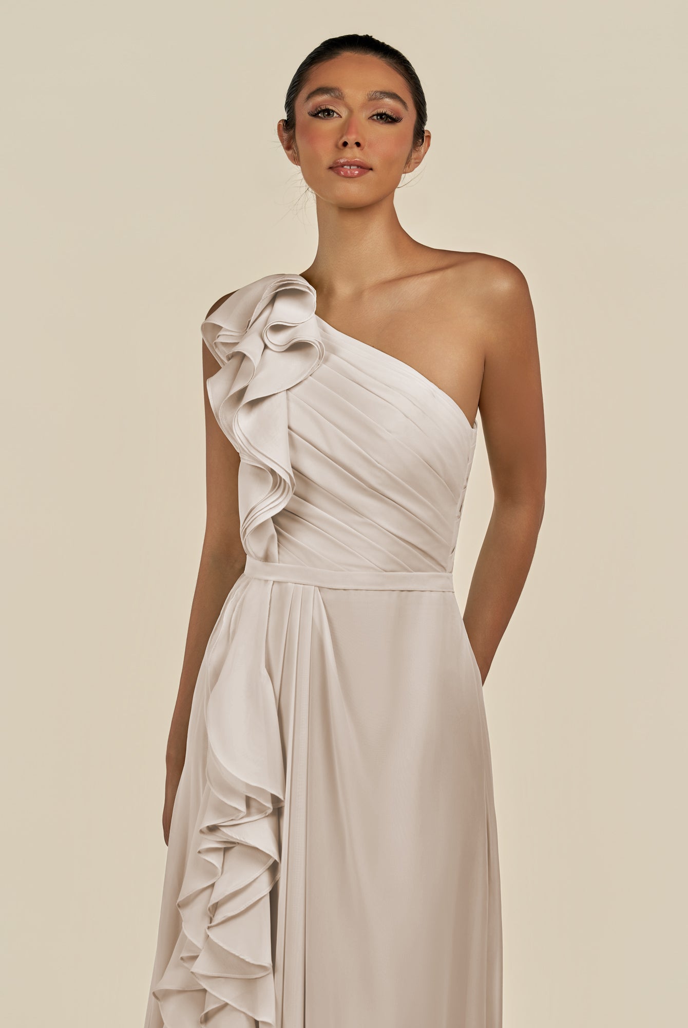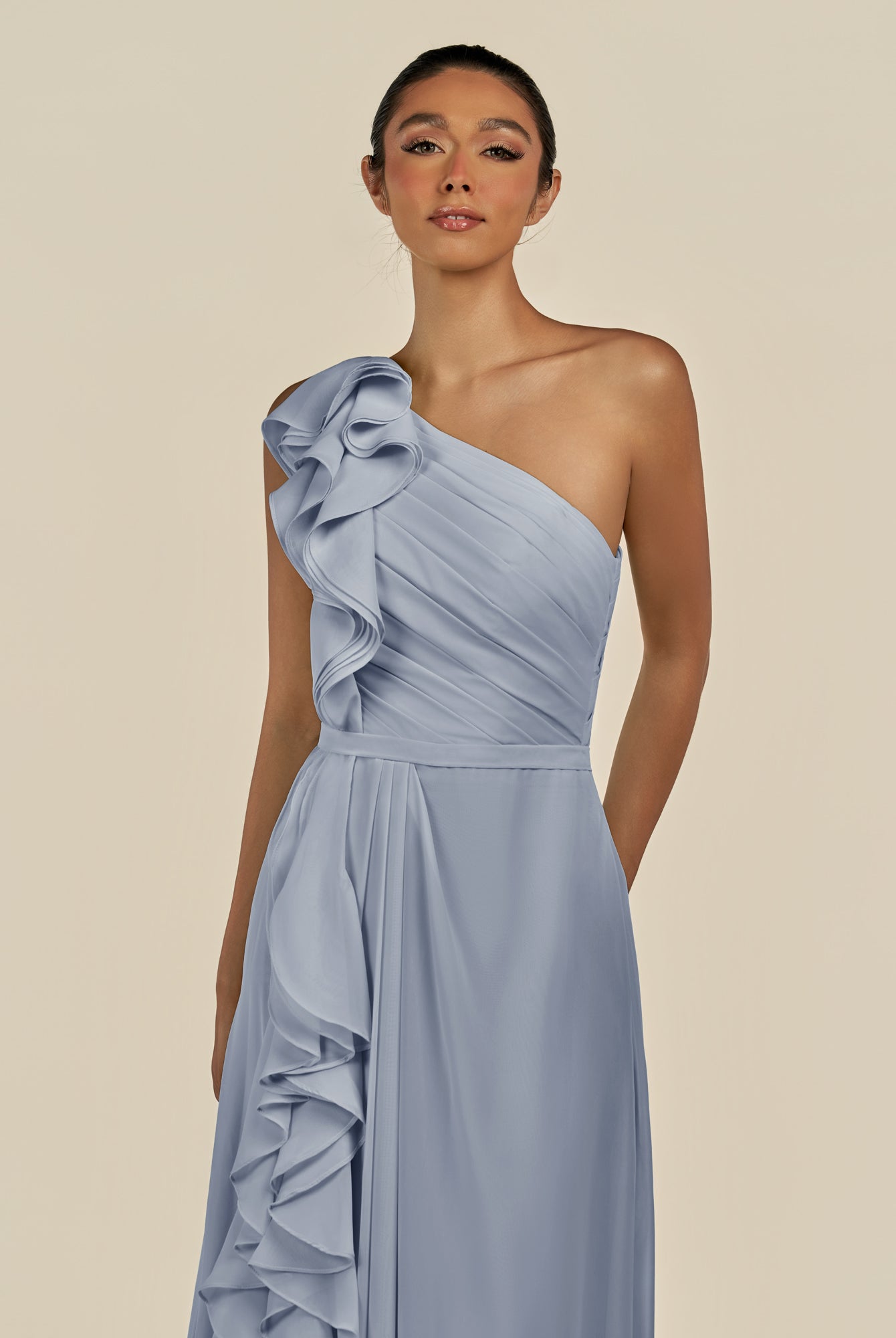 Assou | Tahiti - A Line One Shoulder Chiffon Pleated Ruffles Long Bridesmaid Dress with Slit