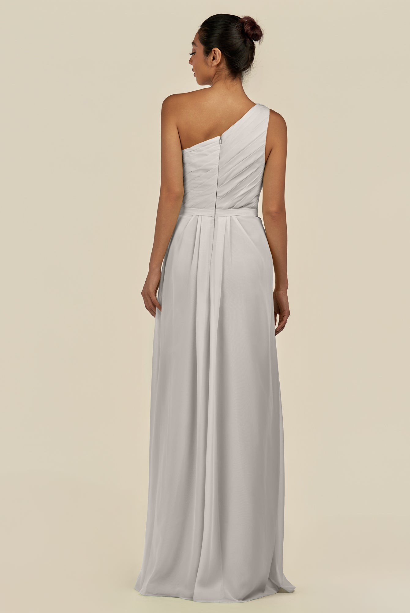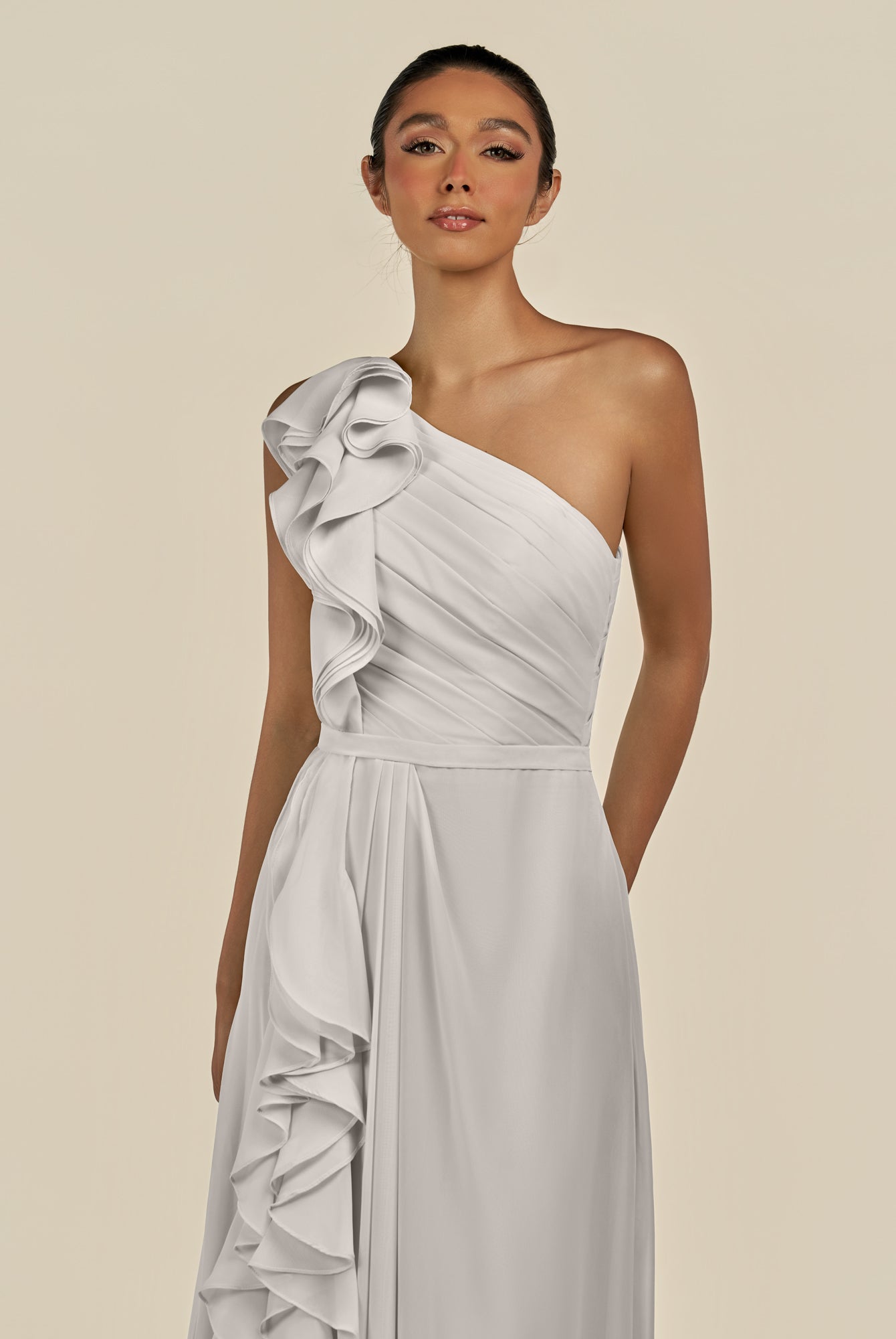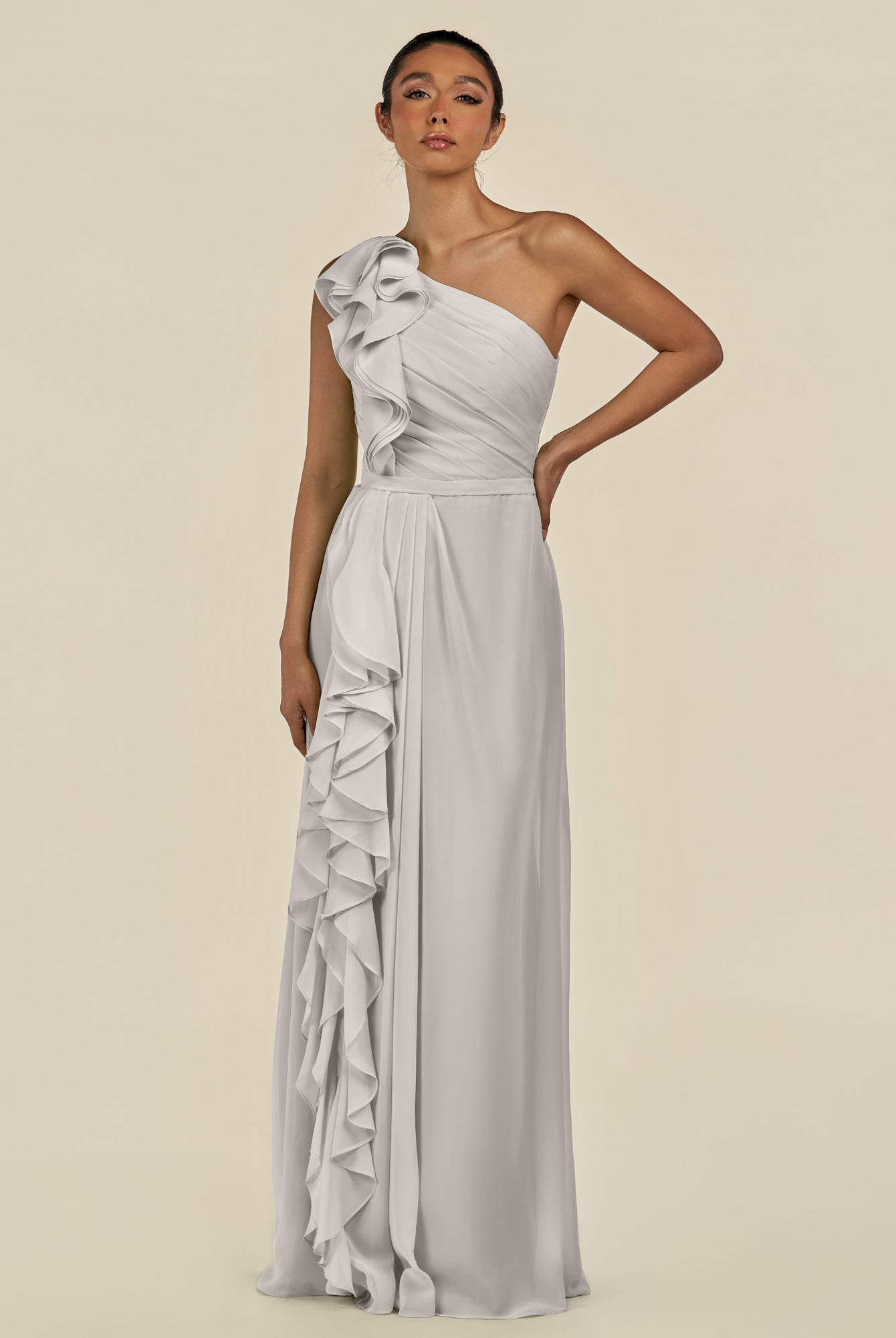 Assou | Silver - A Line One Shoulder Chiffon Pleated Ruffles Long Bridesmaid Dress with Slit