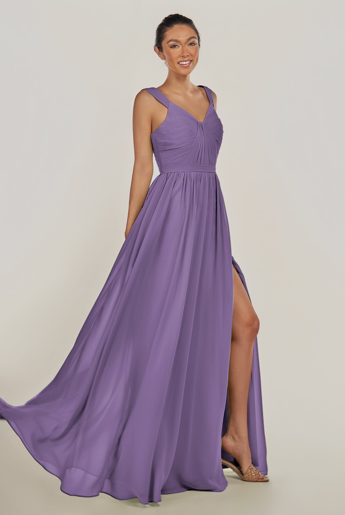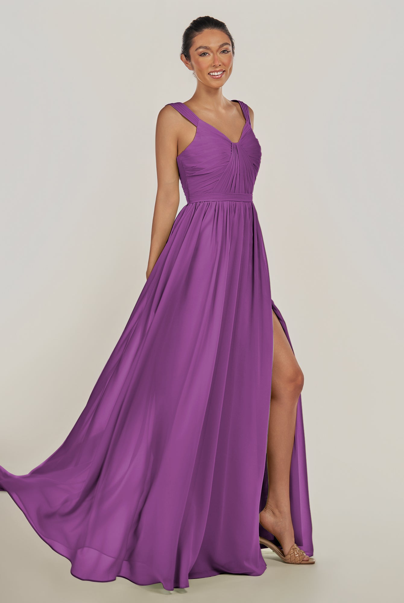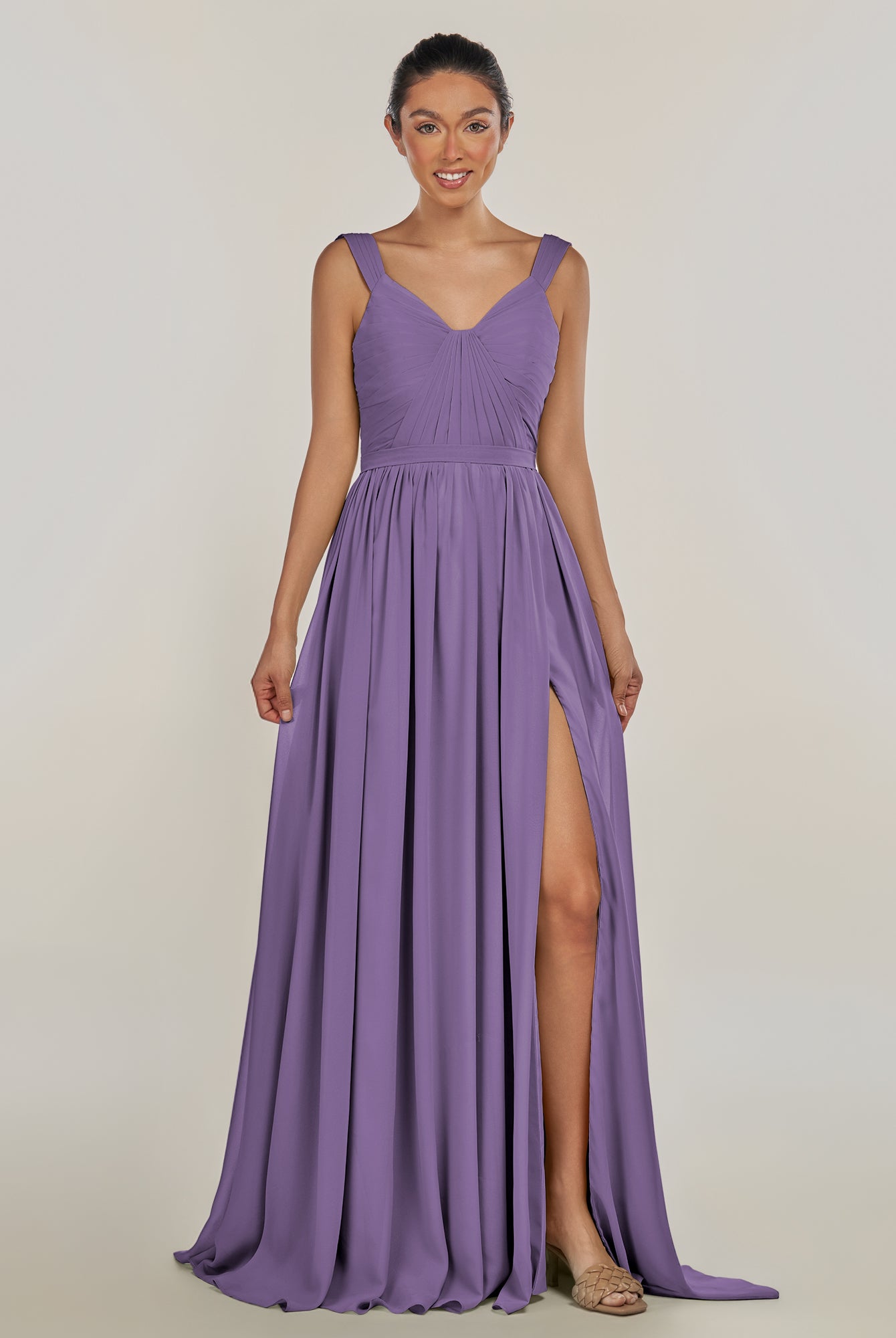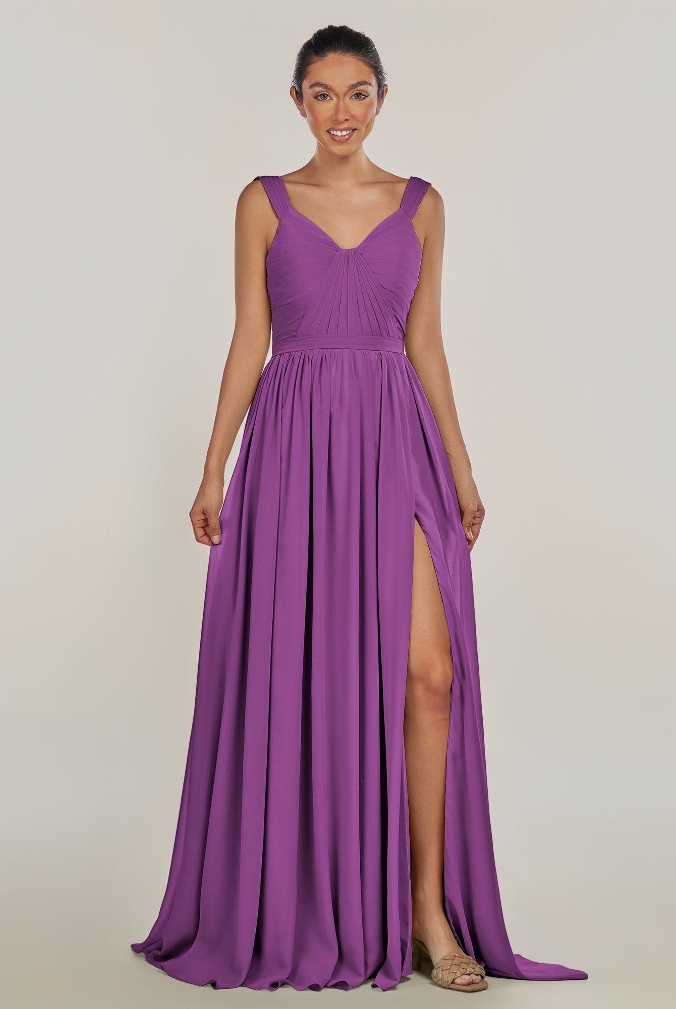Fira | Amethyst - A Line Chiffon V Neck Pleated Long Bridesmaid Dress with Slit
