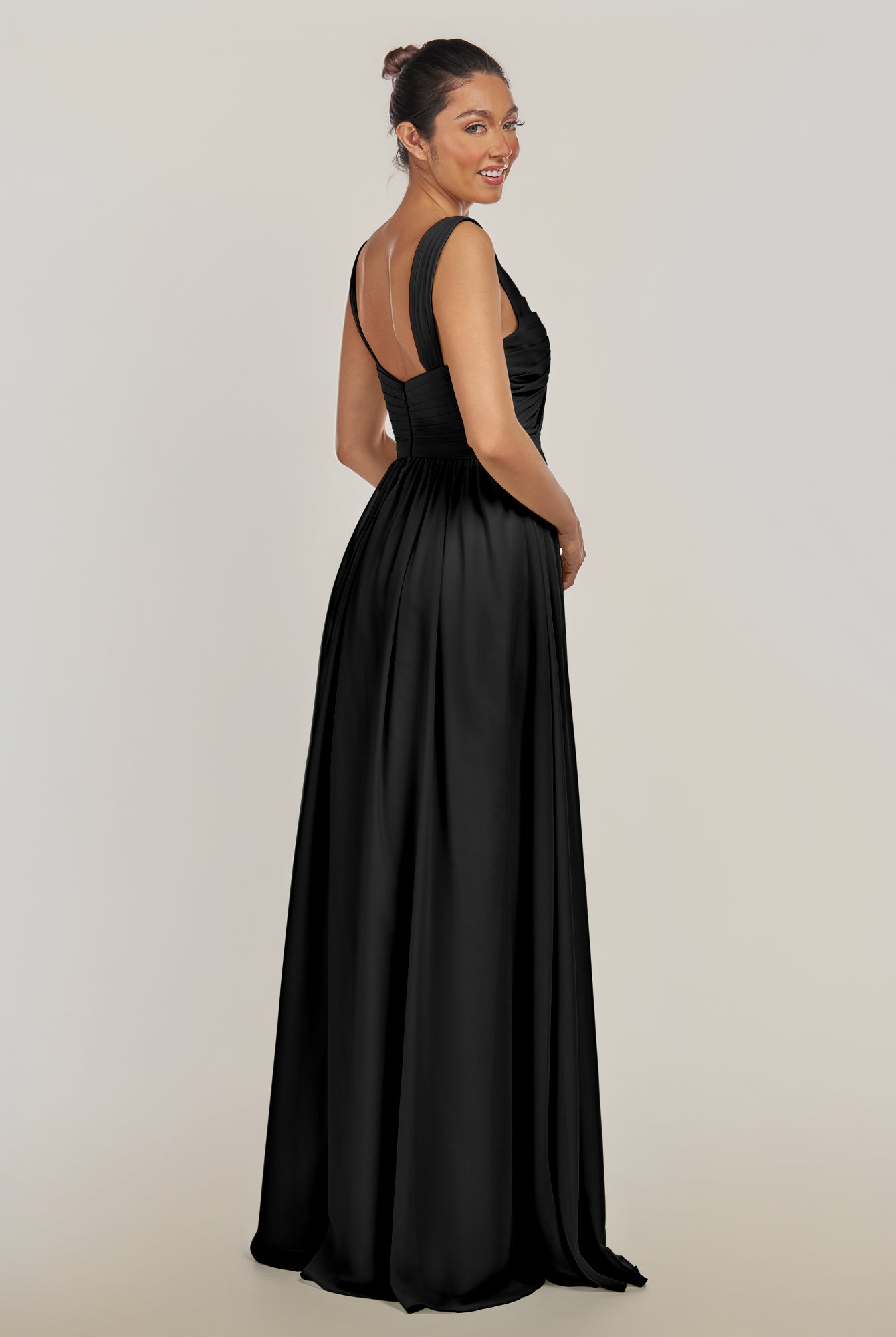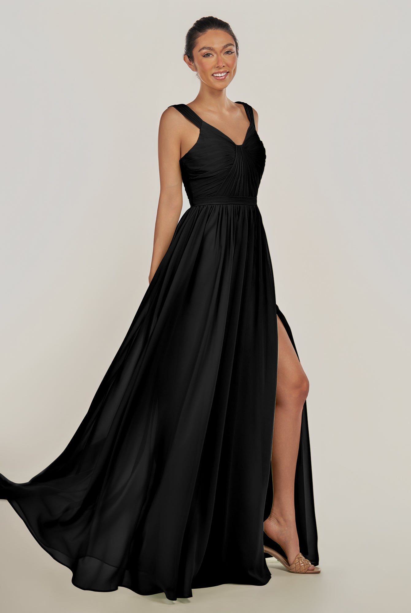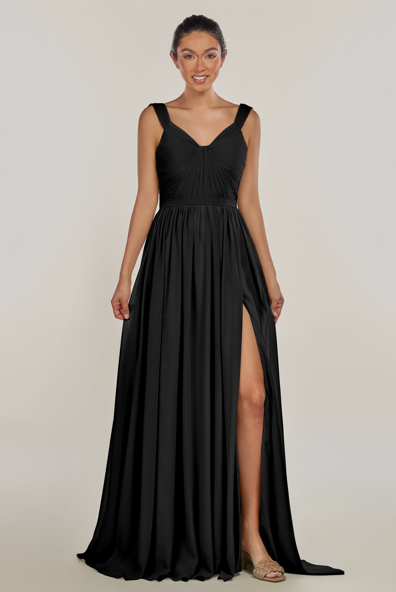 Fira | Black - A Line Chiffon V Neck Pleated Long Bridesmaid Dress with Slit