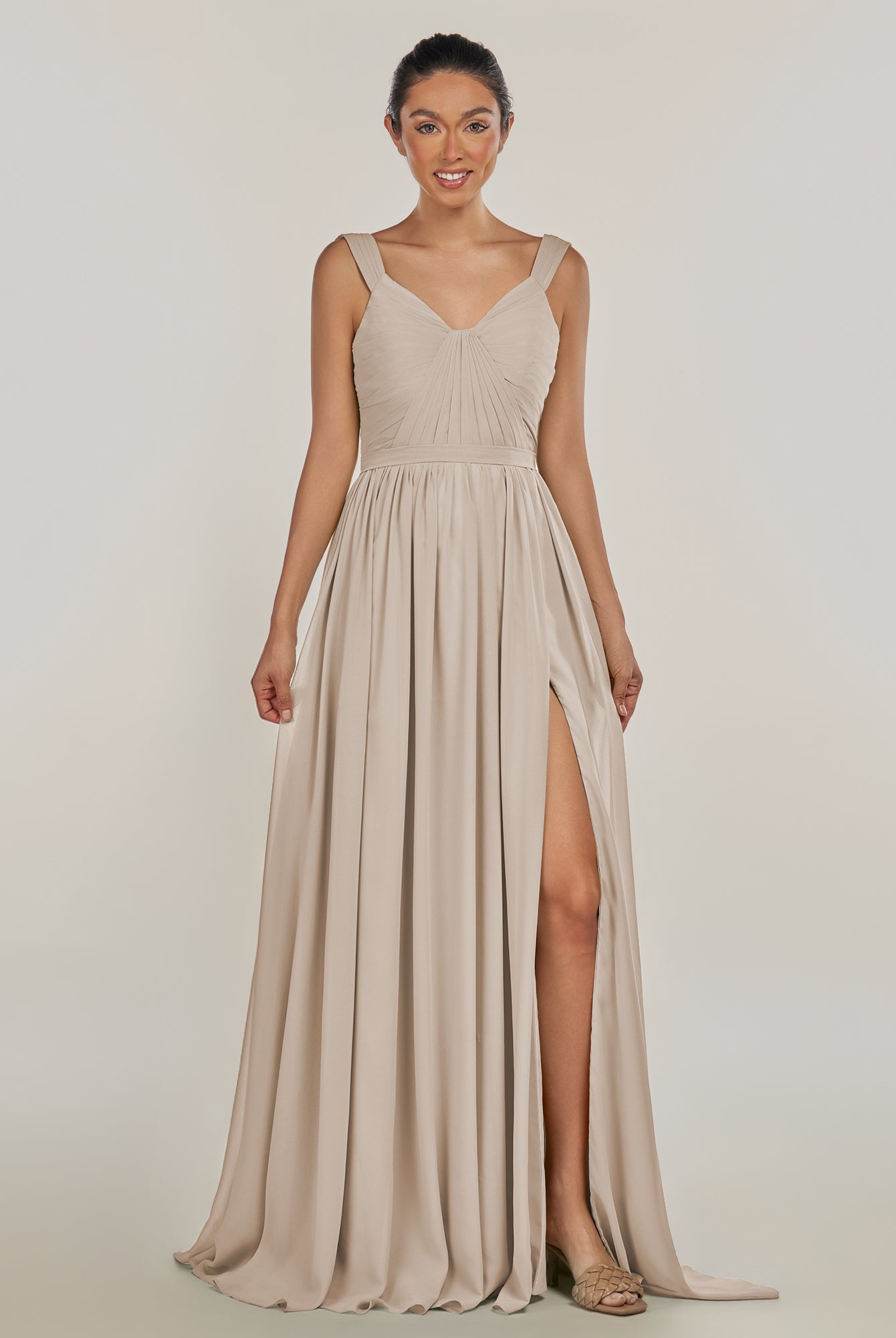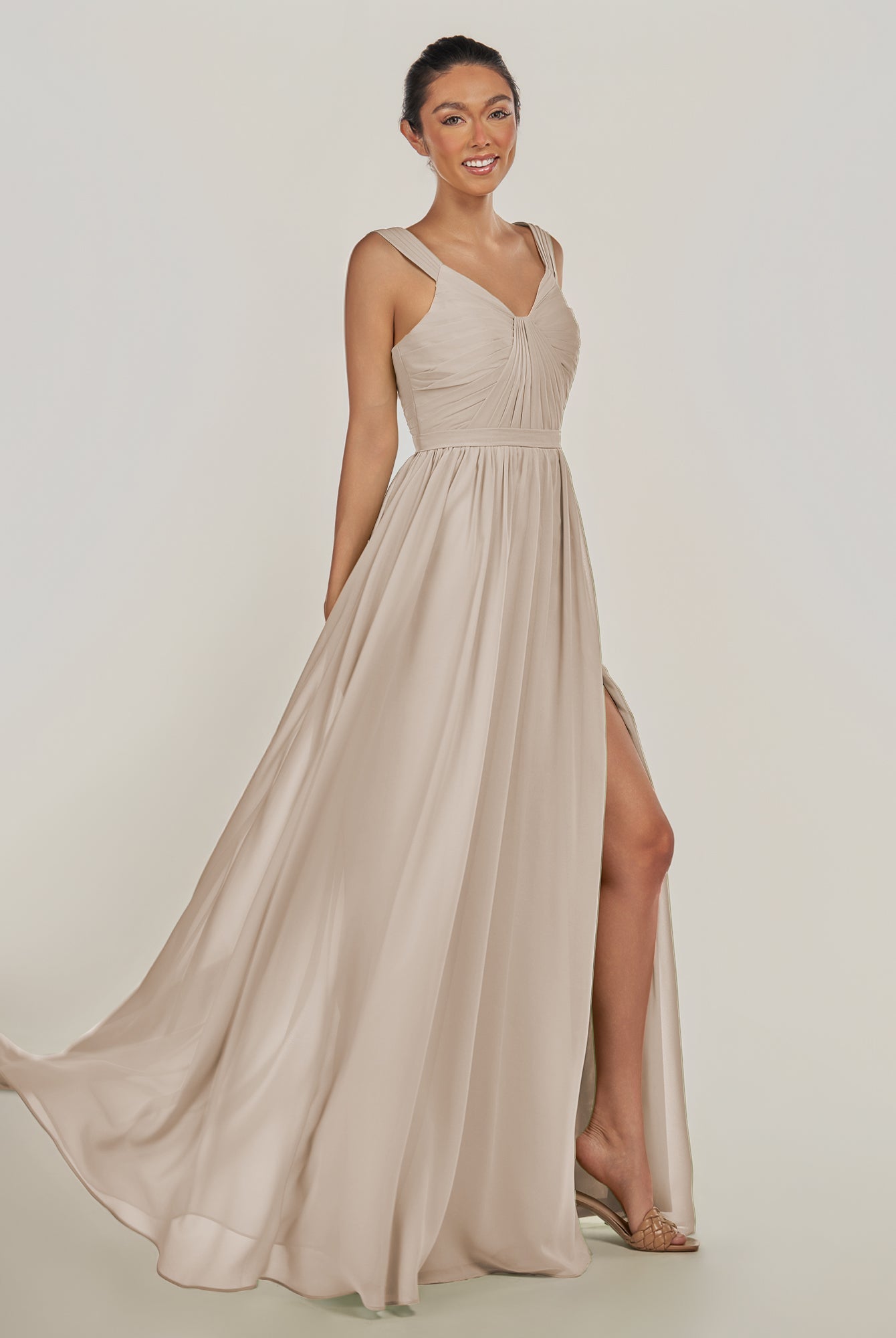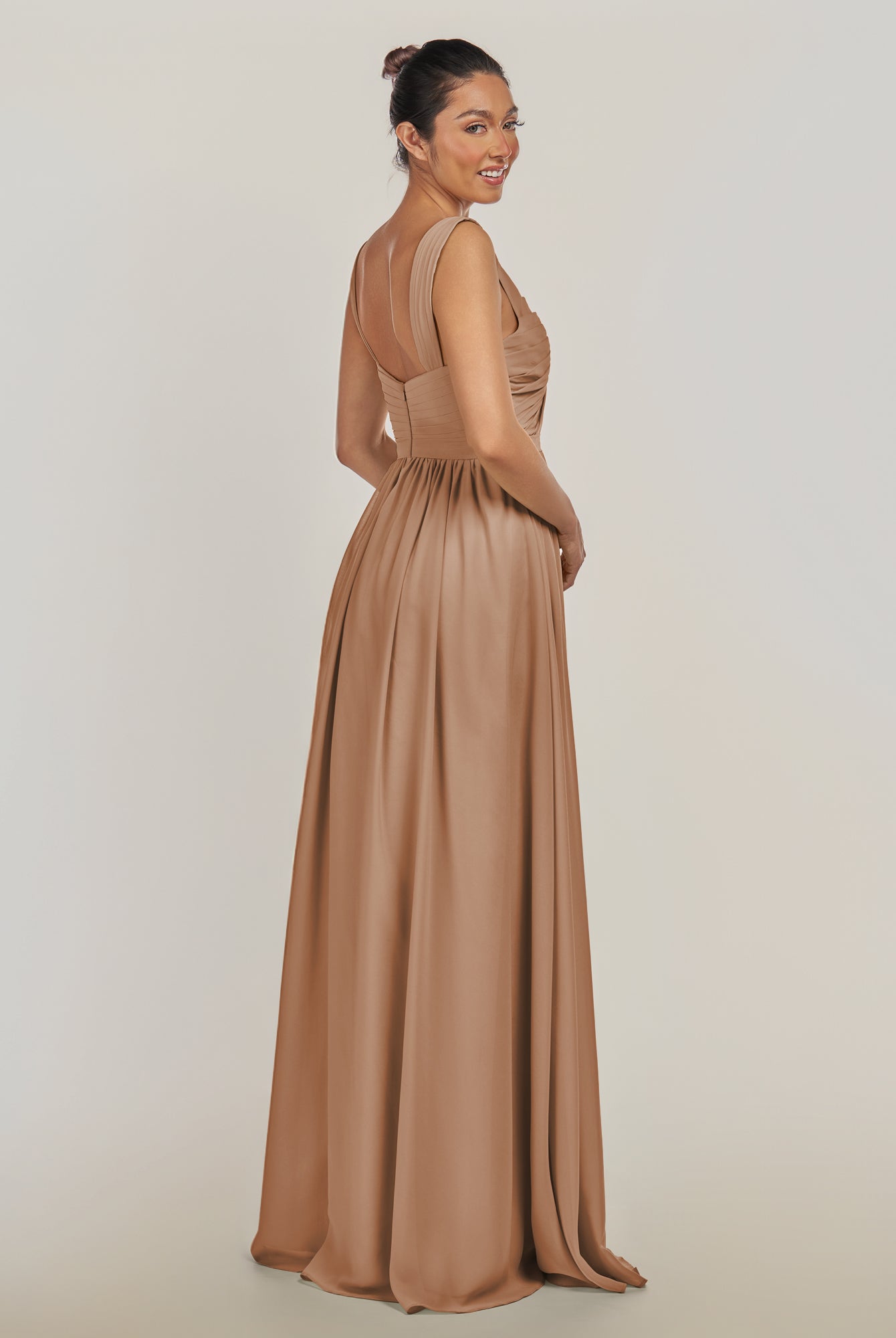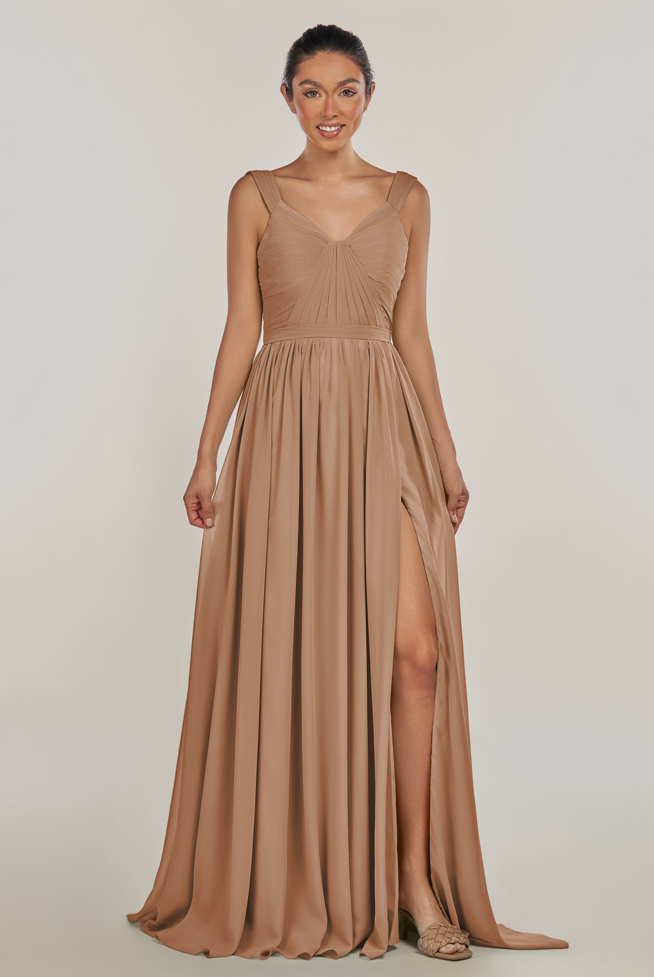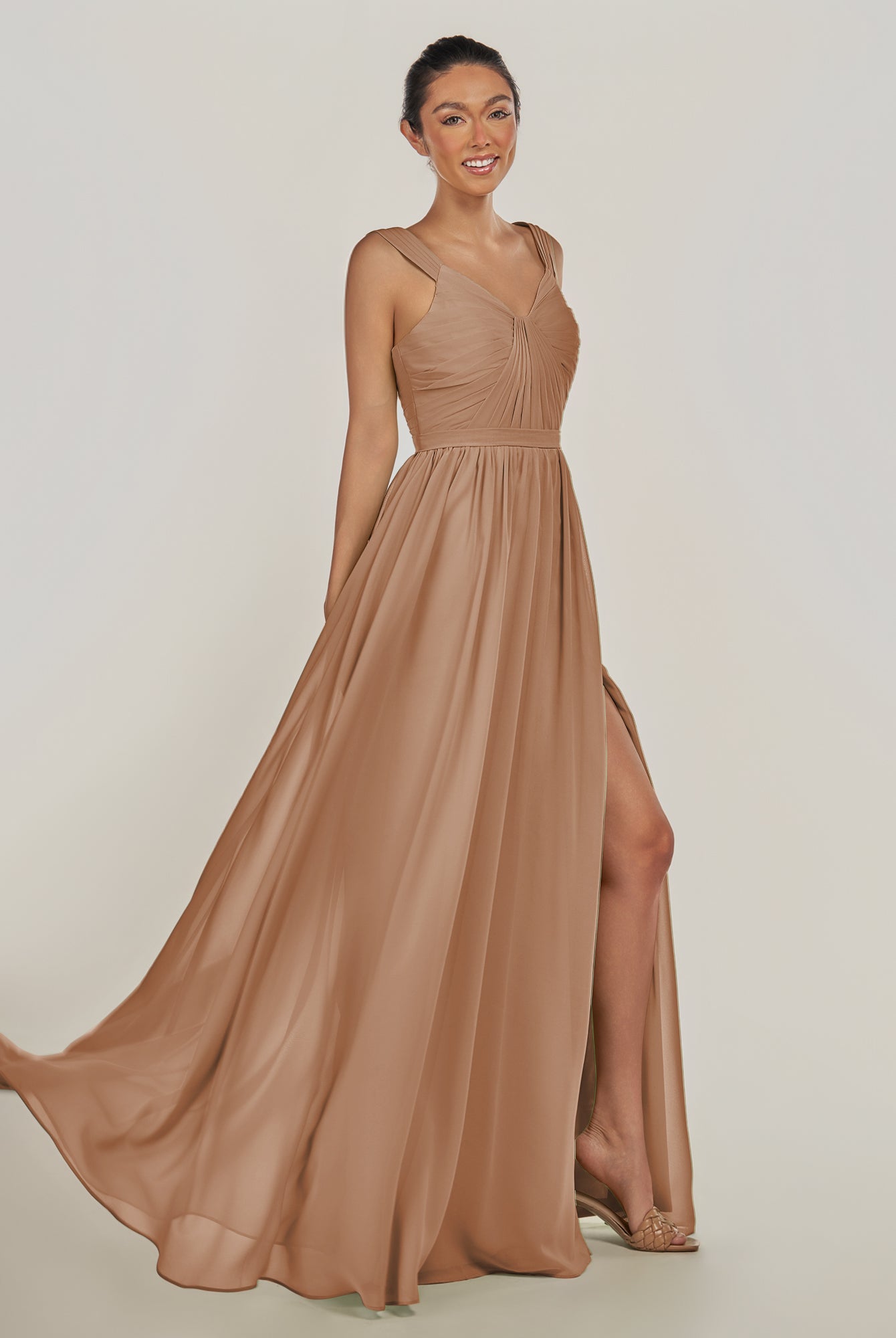 Fira | Toffee - A Line Chiffon V Neck Pleated Long Bridesmaid Dress with Slit