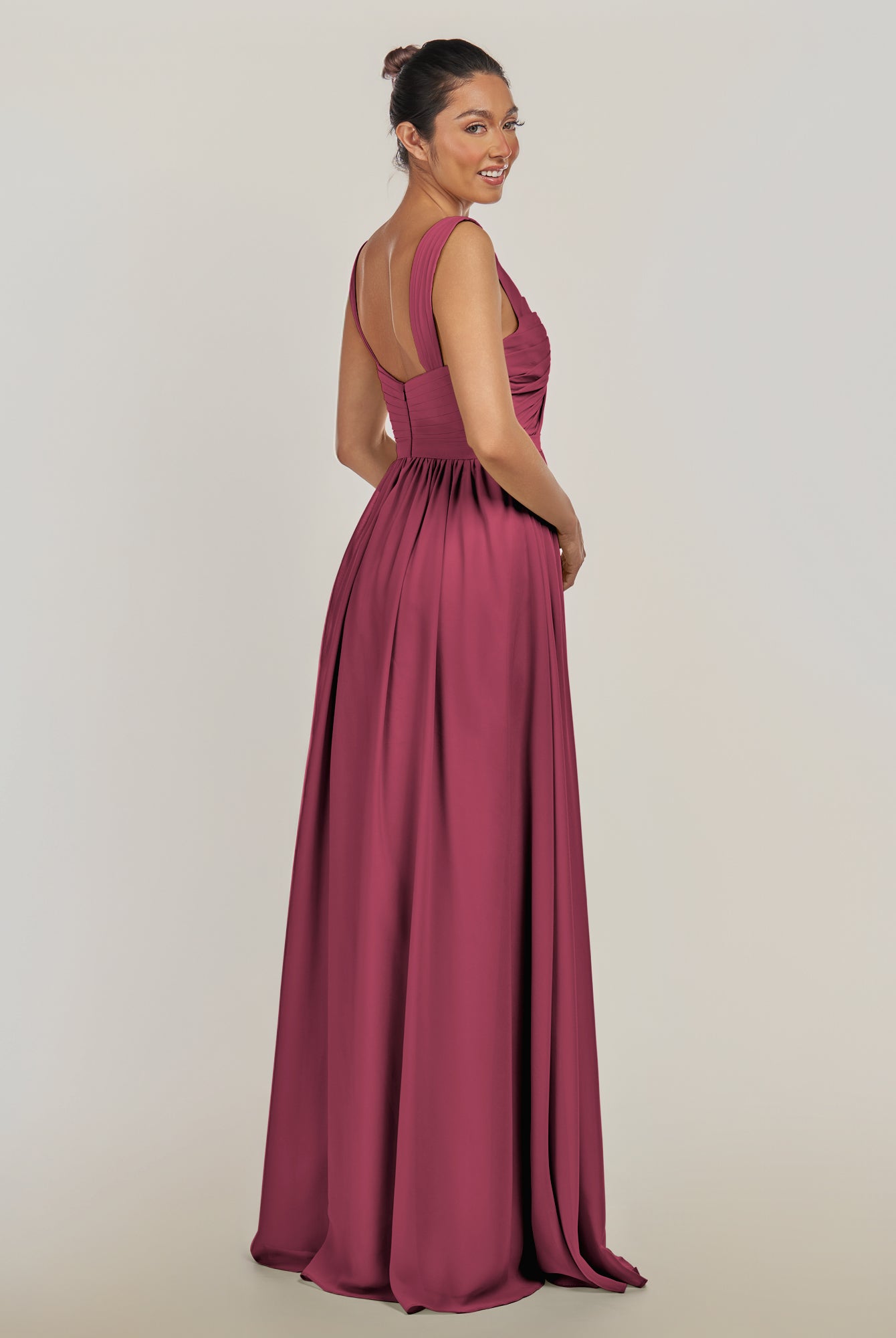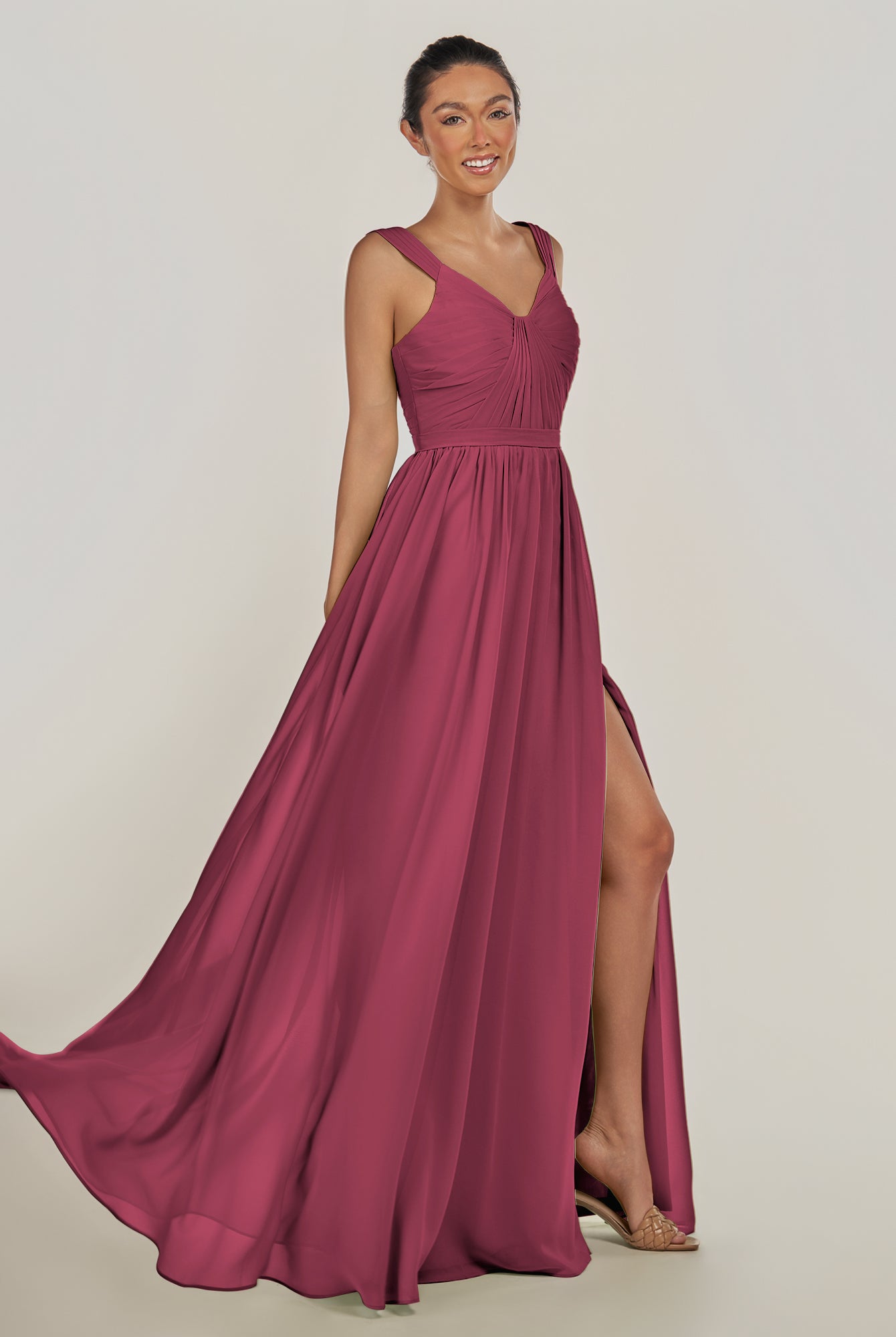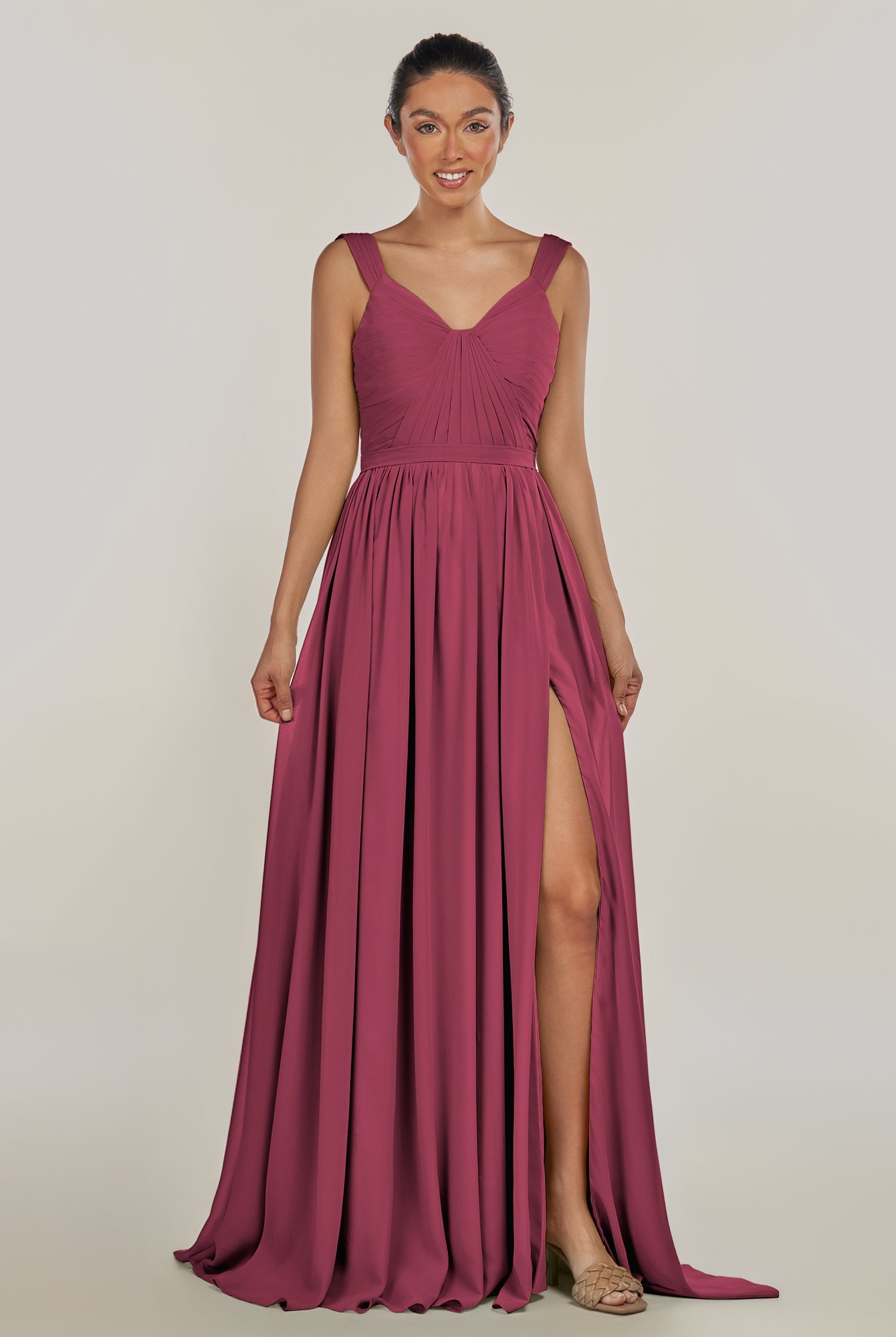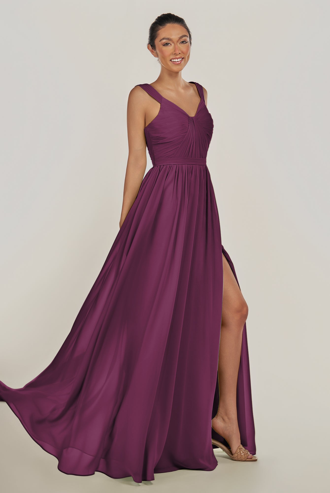 Fira | Fig - A Line Chiffon V Neck Pleated Long Bridesmaid Dress with Slit