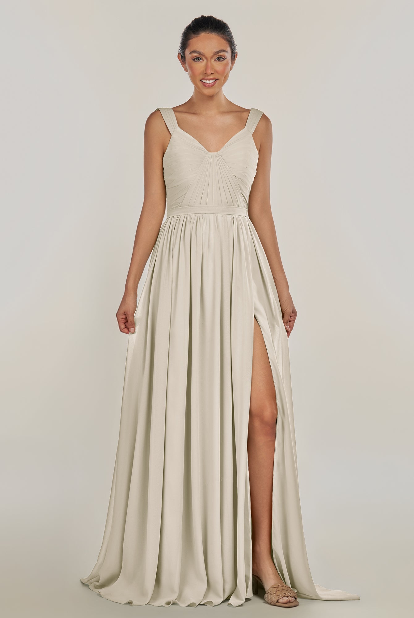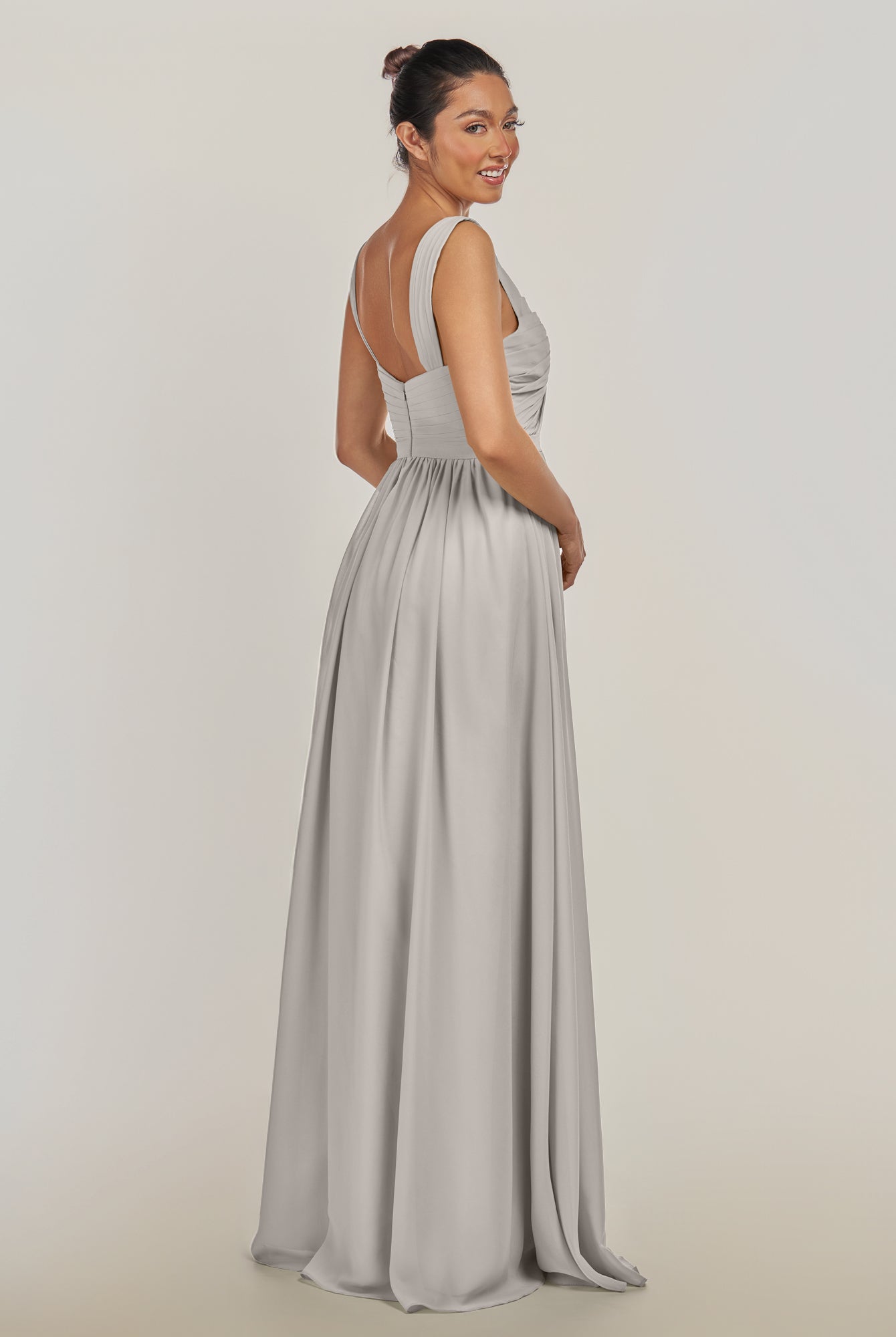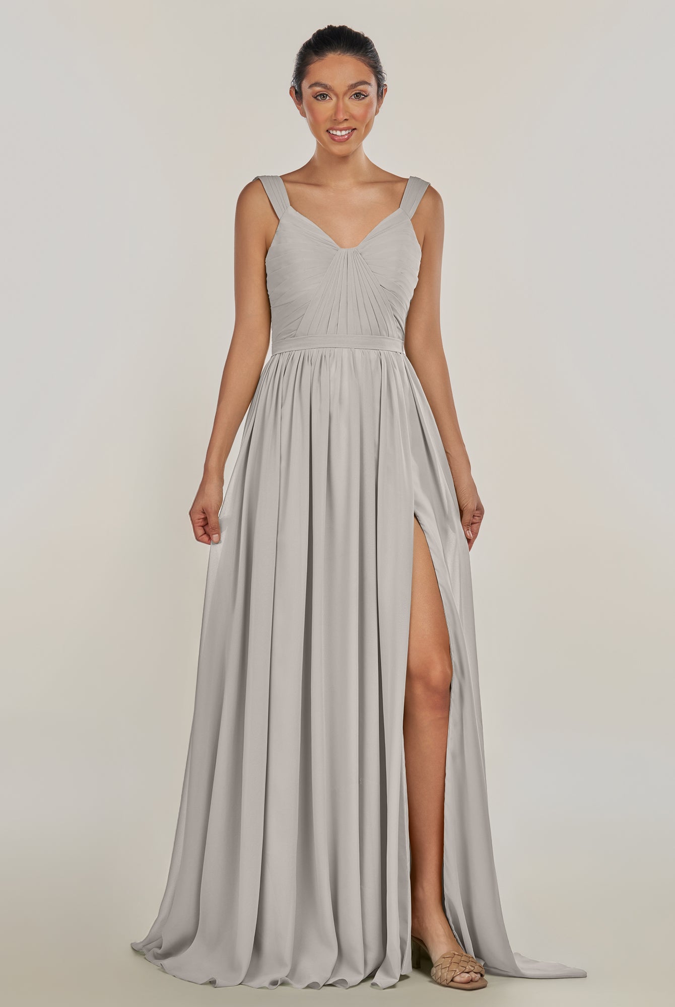 Fira | Silver - A Line Chiffon V Neck Pleated Long Bridesmaid Dress with Slit