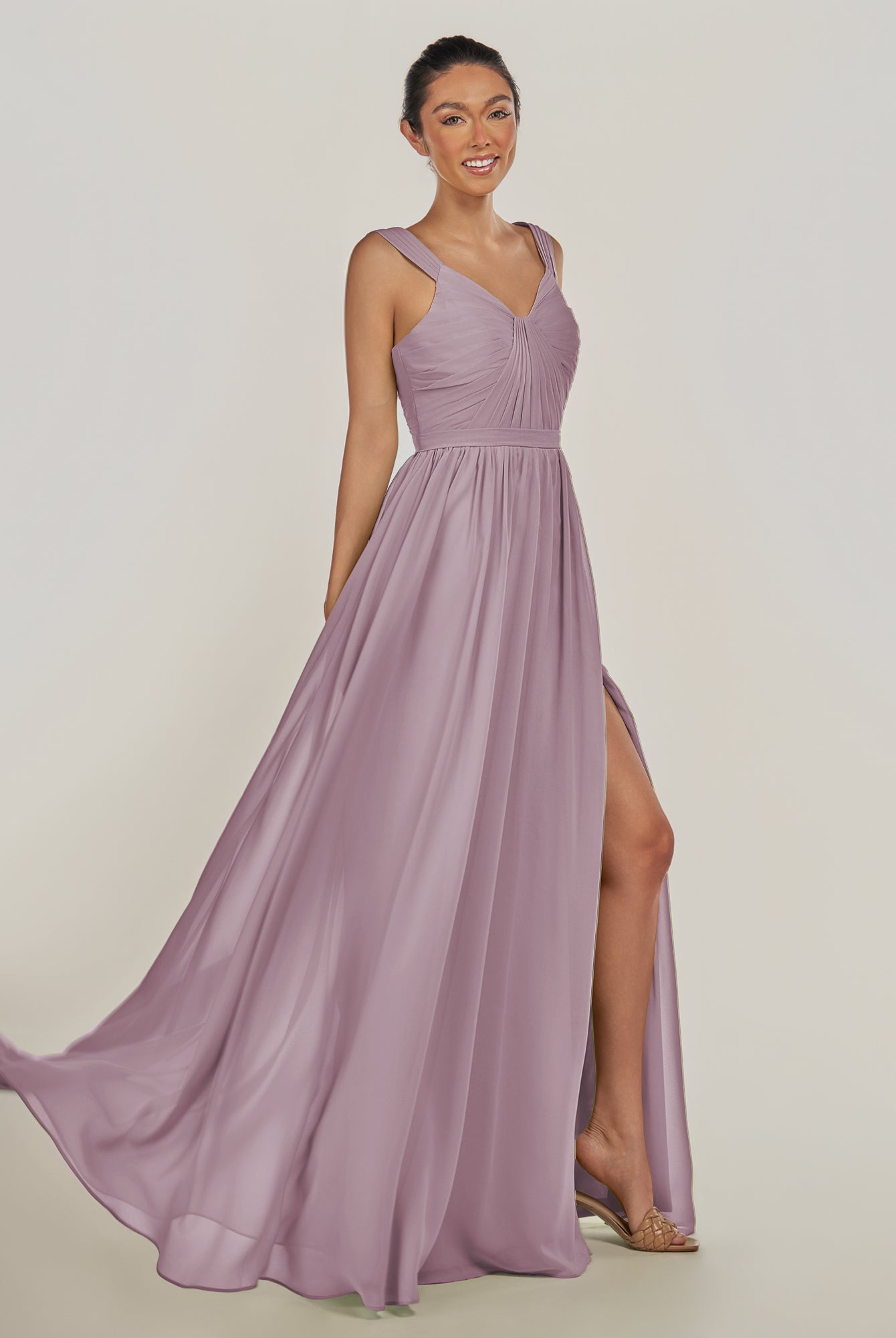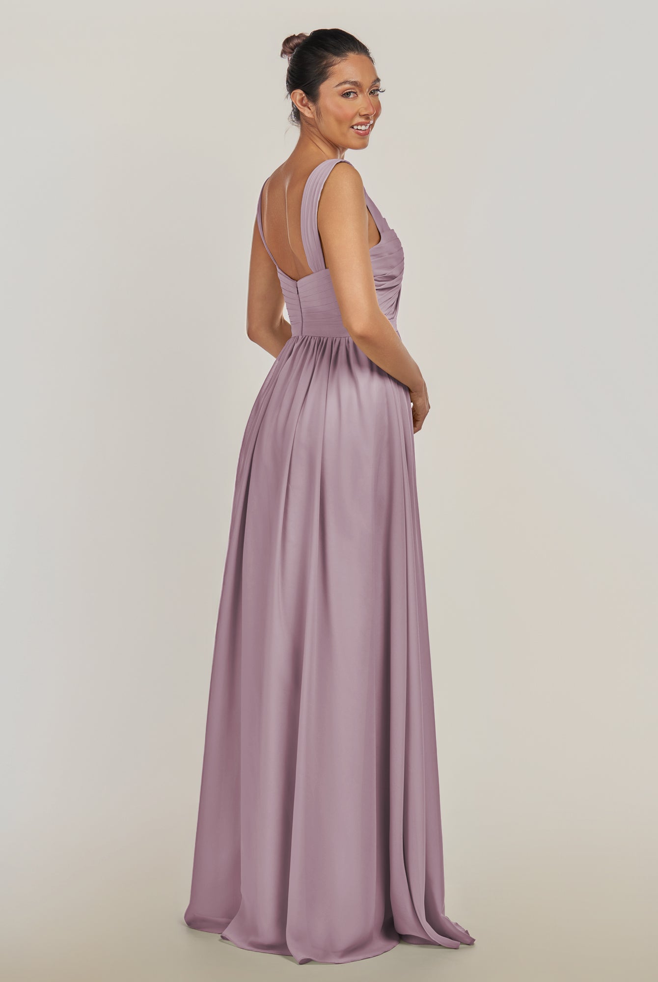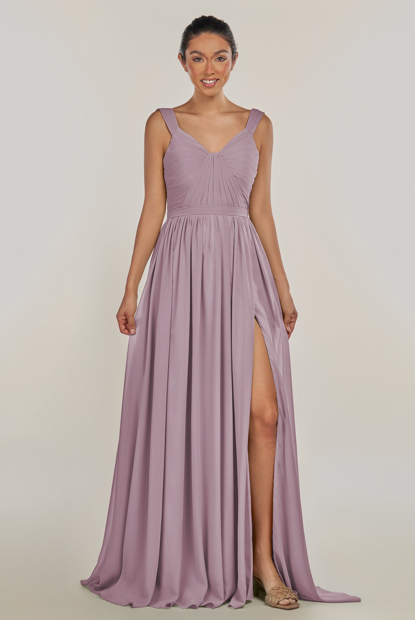 Fira | Vintage Mauve - A Line Chiffon V Neck Pleated Long Bridesmaid Dress with Slit