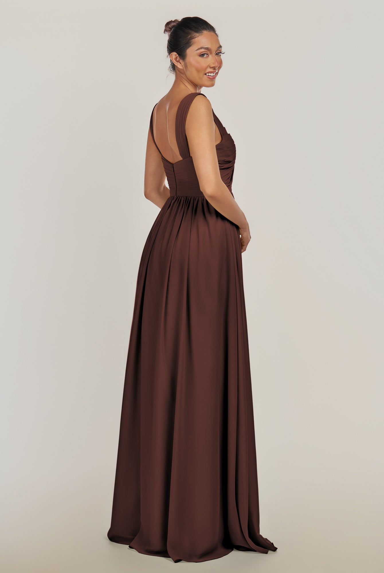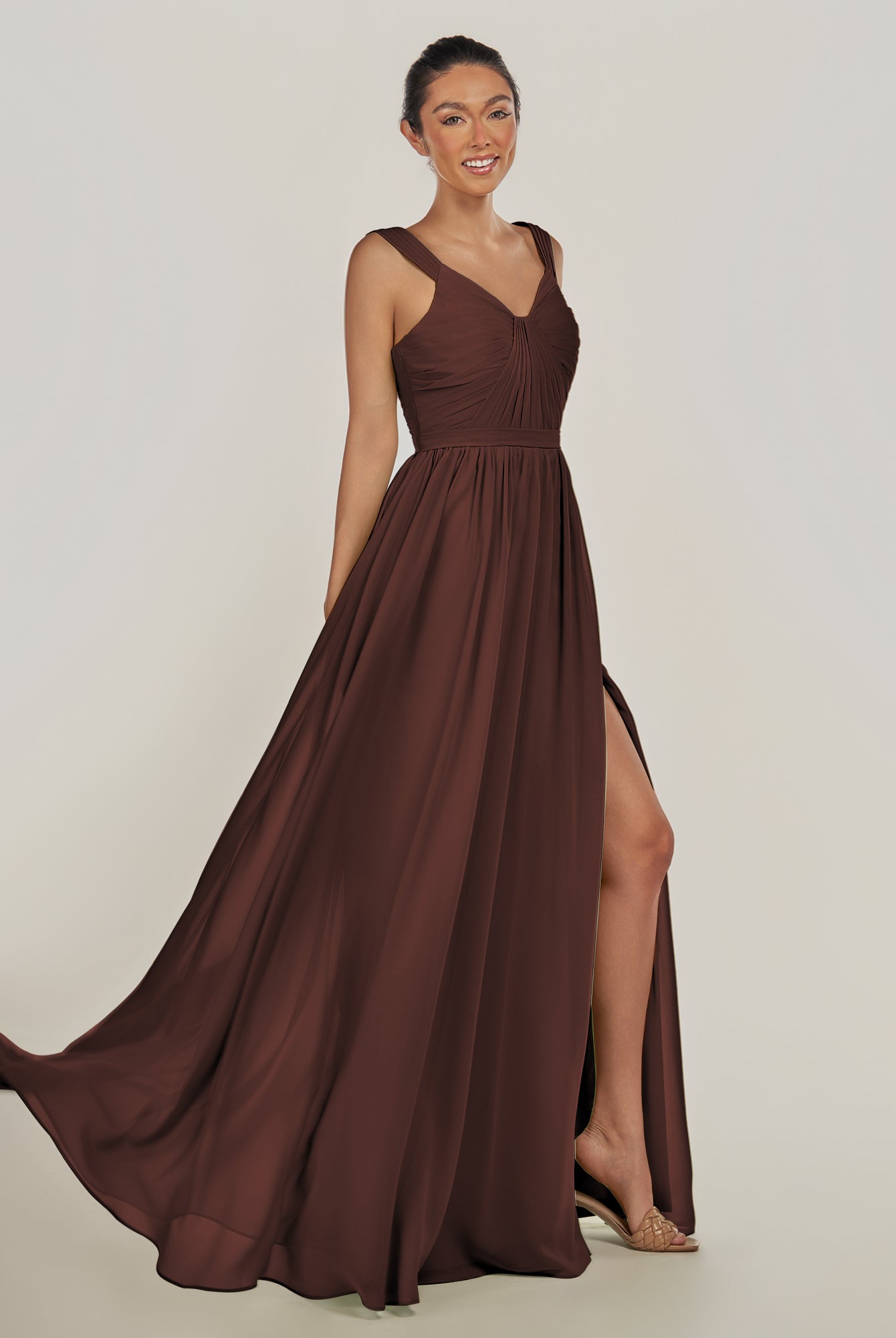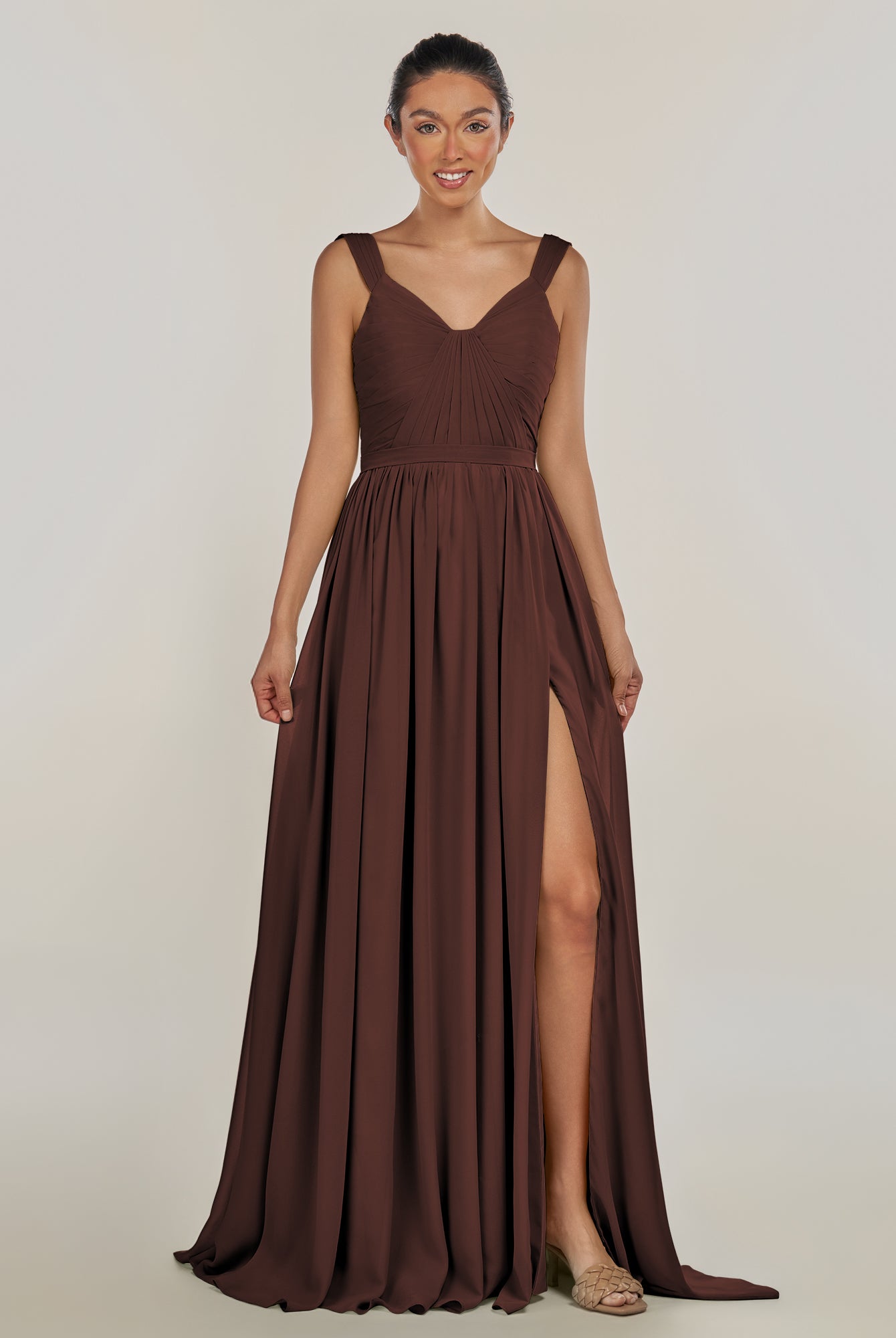 Fira | Espresso - A Line Chiffon V Neck Pleated Long Bridesmaid Dress with Slit