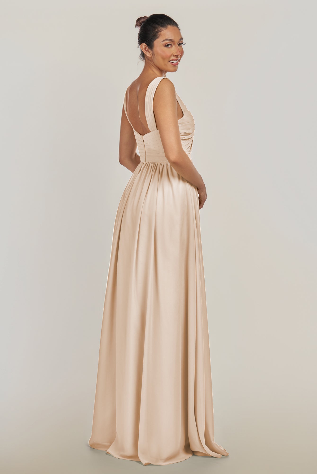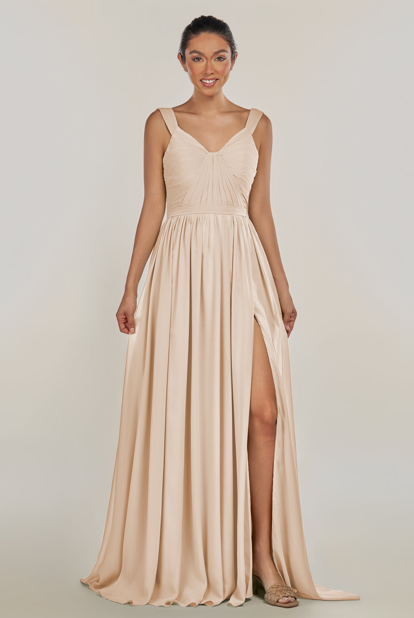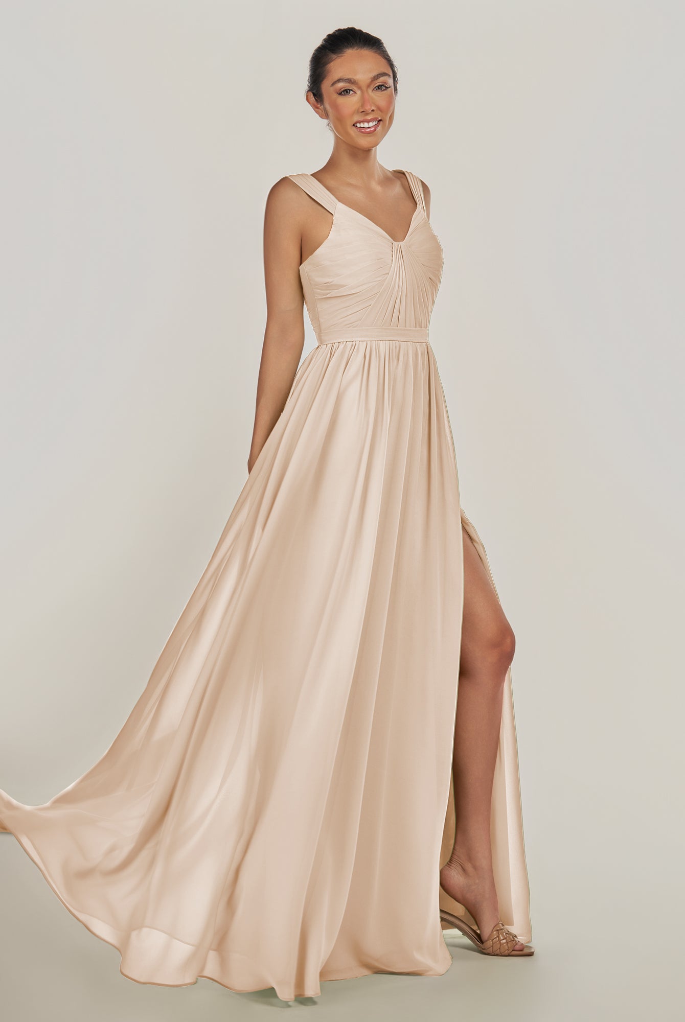 Fira | Pale Blush - A Line Chiffon V Neck Pleated Long Bridesmaid Dress with Slit