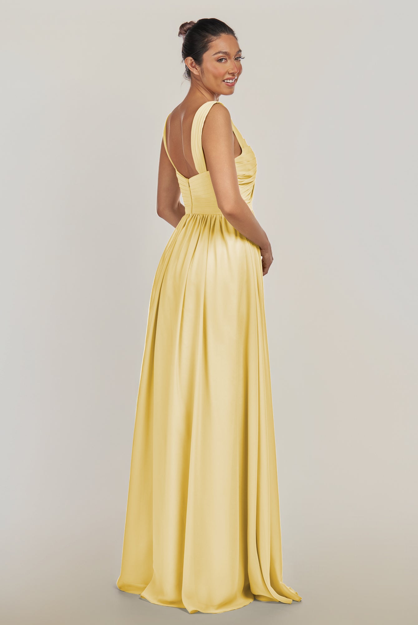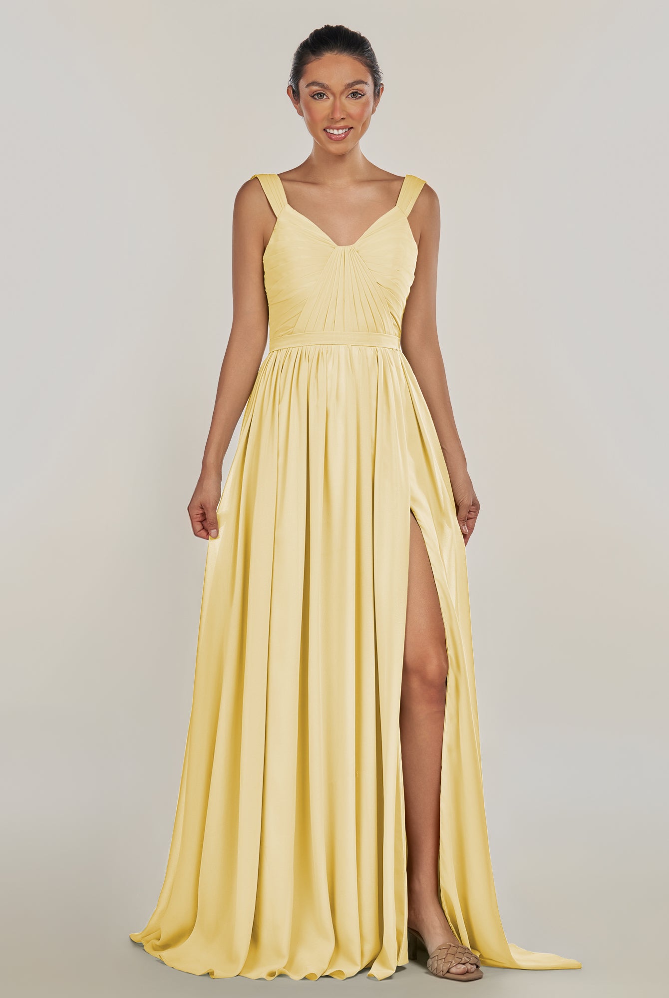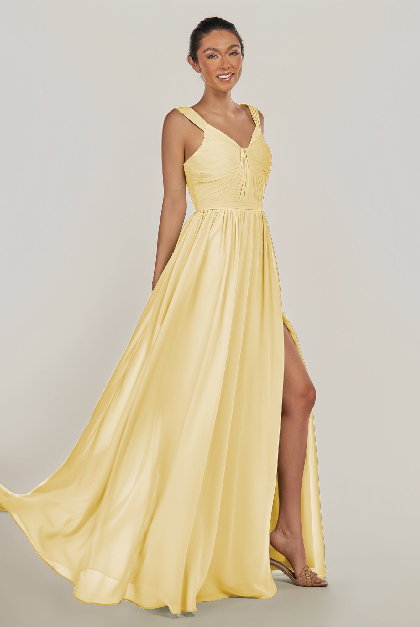 Fira | Pastel Yellow - A Line Chiffon V Neck Pleated Long Bridesmaid Dress with Slit