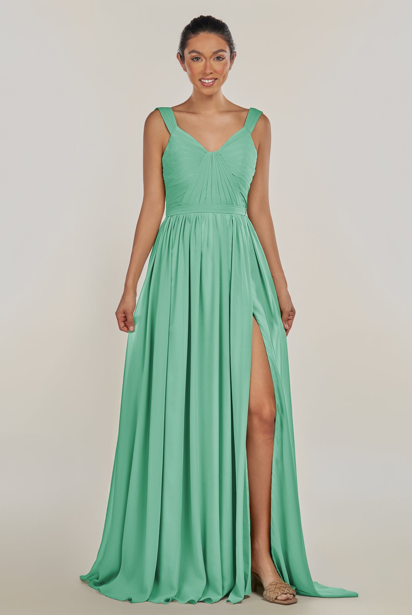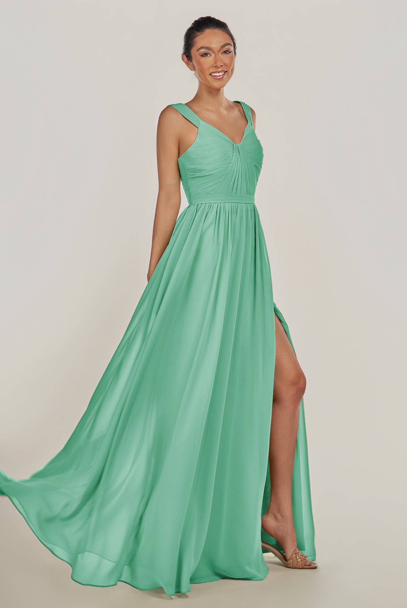 Fira | Tahiti - A Line Chiffon V Neck Pleated Long Bridesmaid Dress with Slit