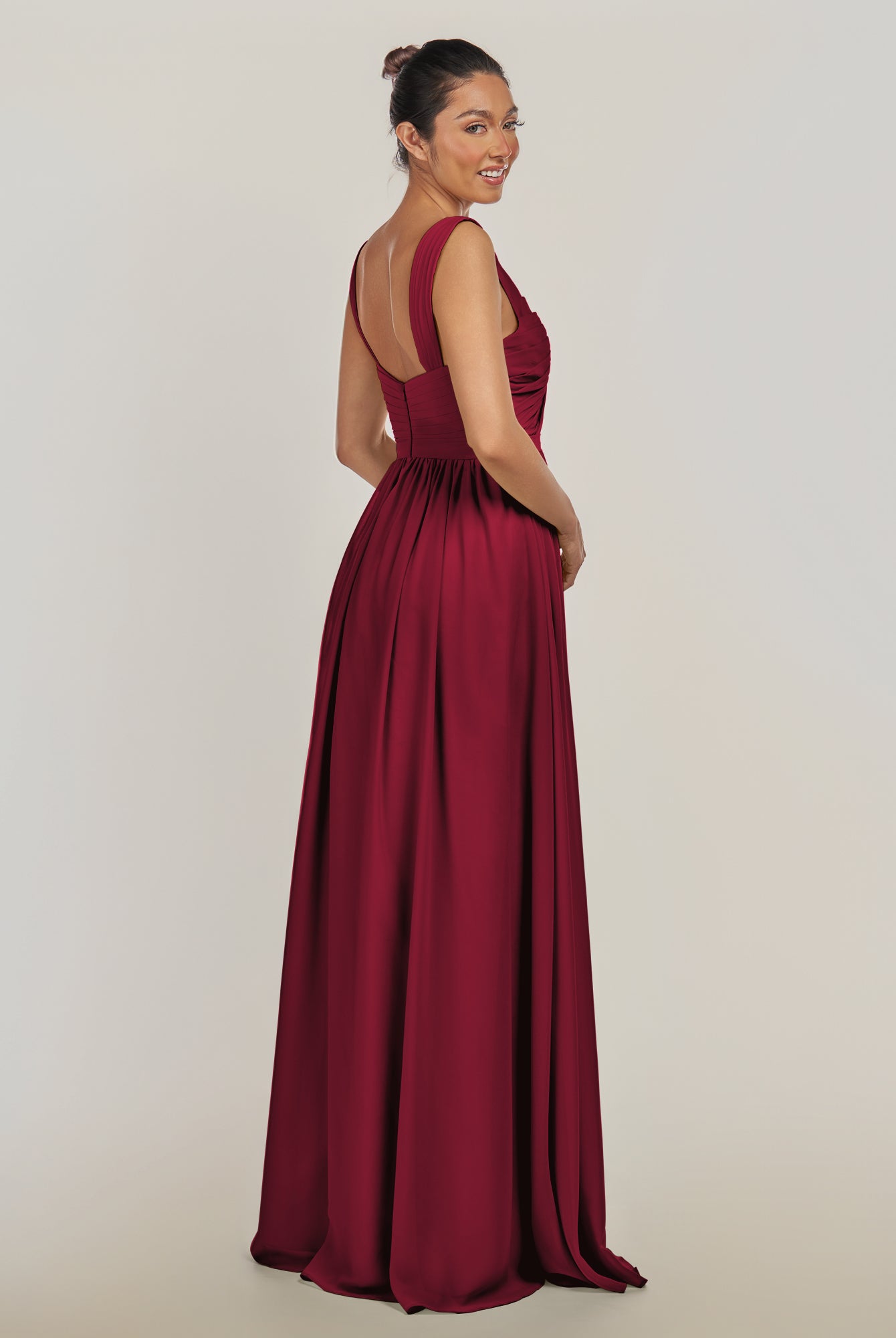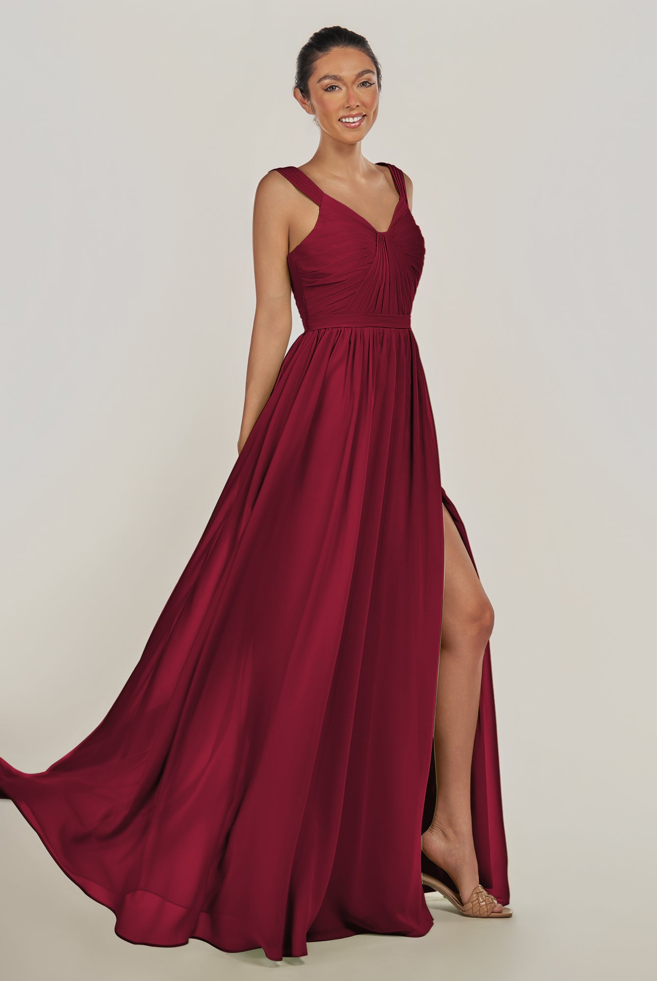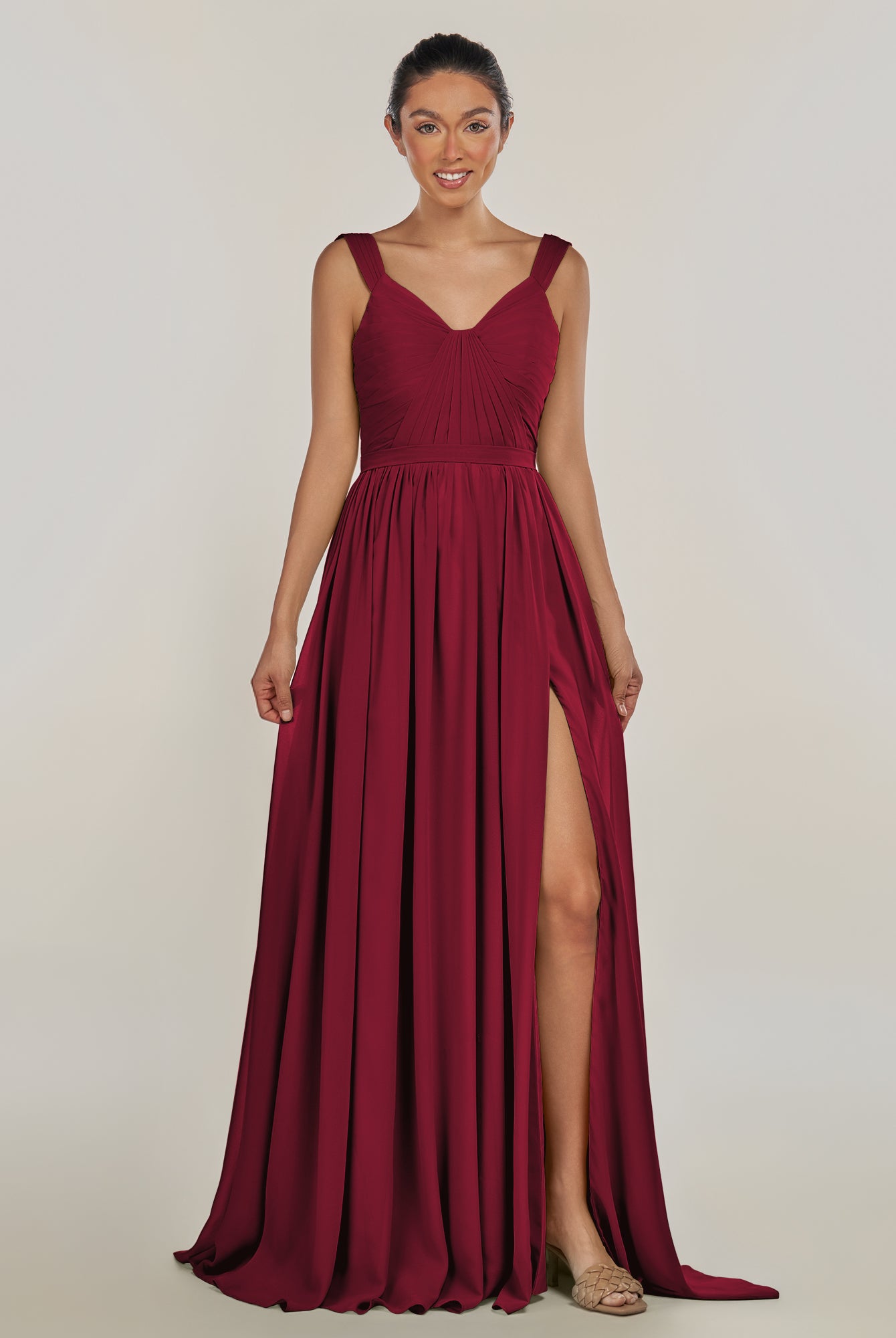 Fira | Merlot - A Line Chiffon V Neck Pleated Long Bridesmaid Dress with Slit