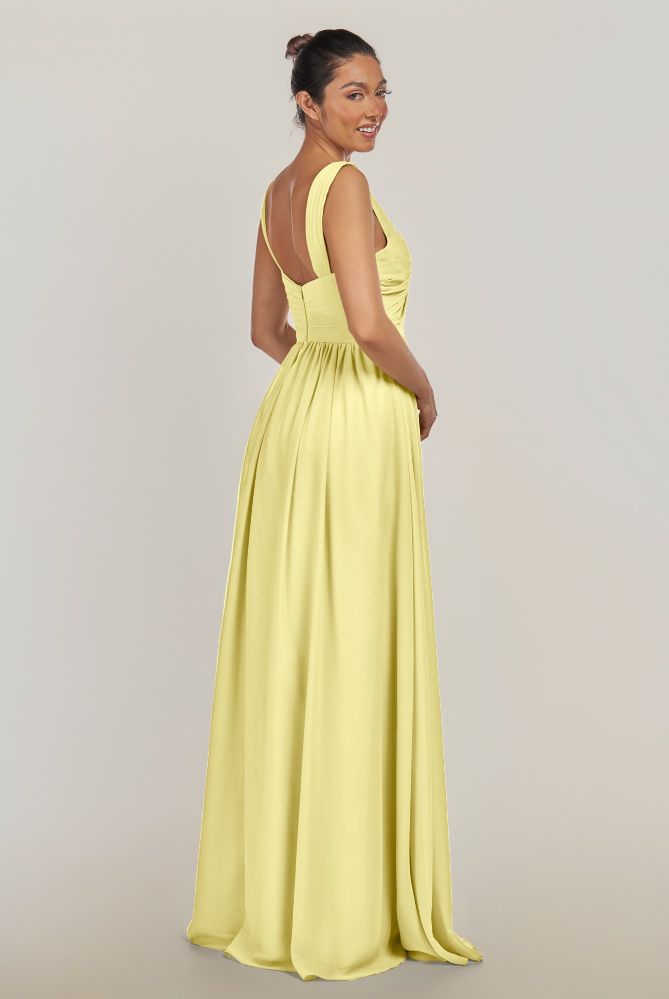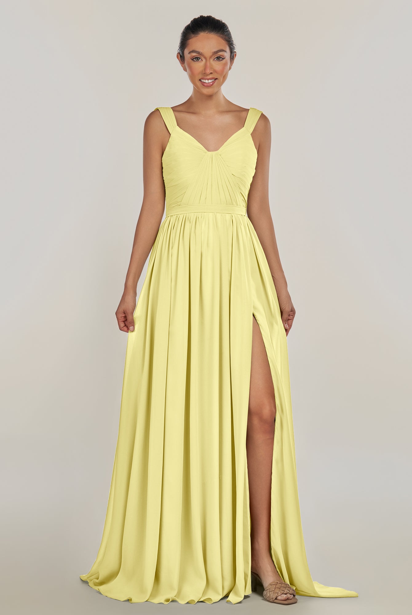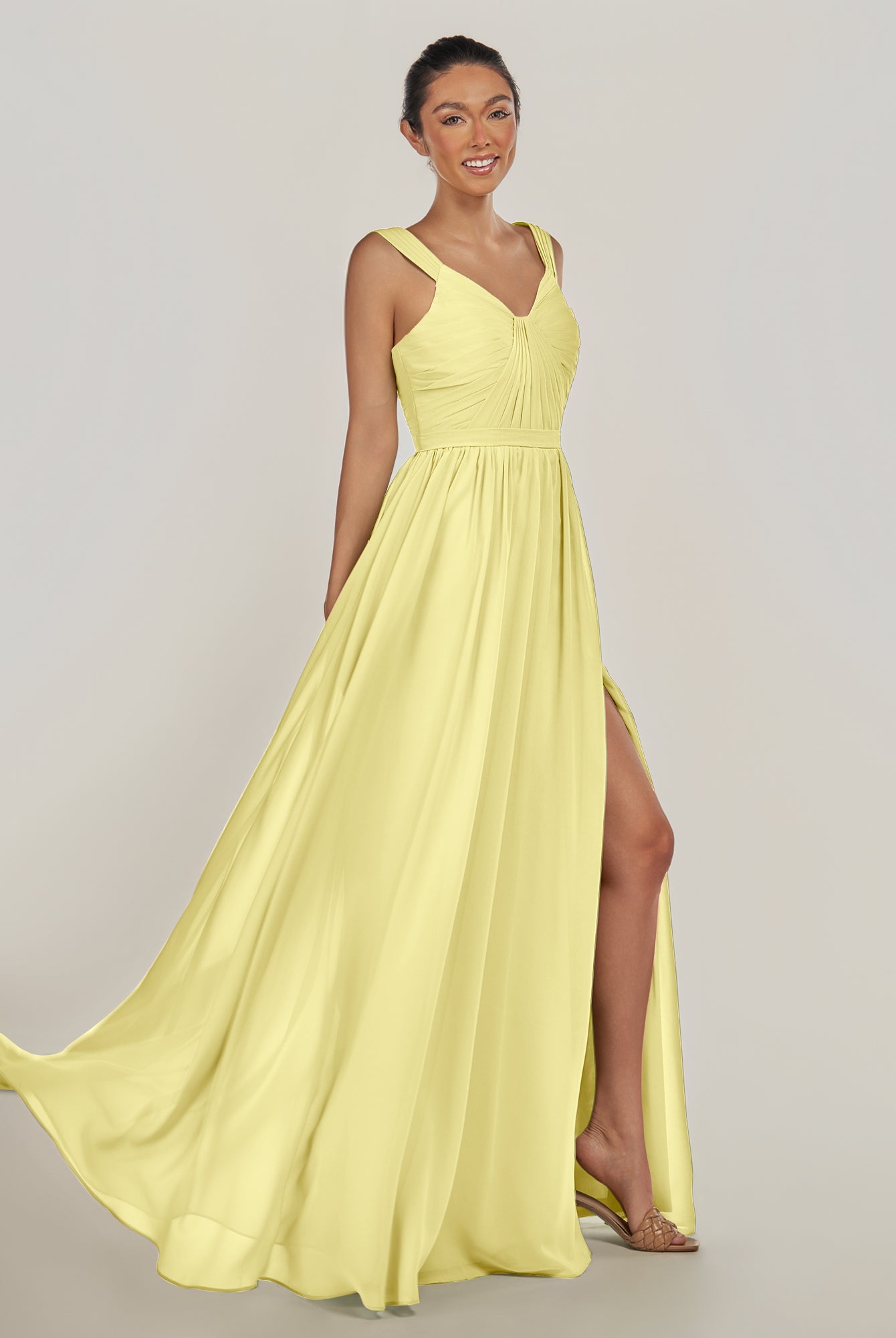 Fira | Buttercup - A Line Chiffon V Neck Pleated Long Bridesmaid Dress with Slit