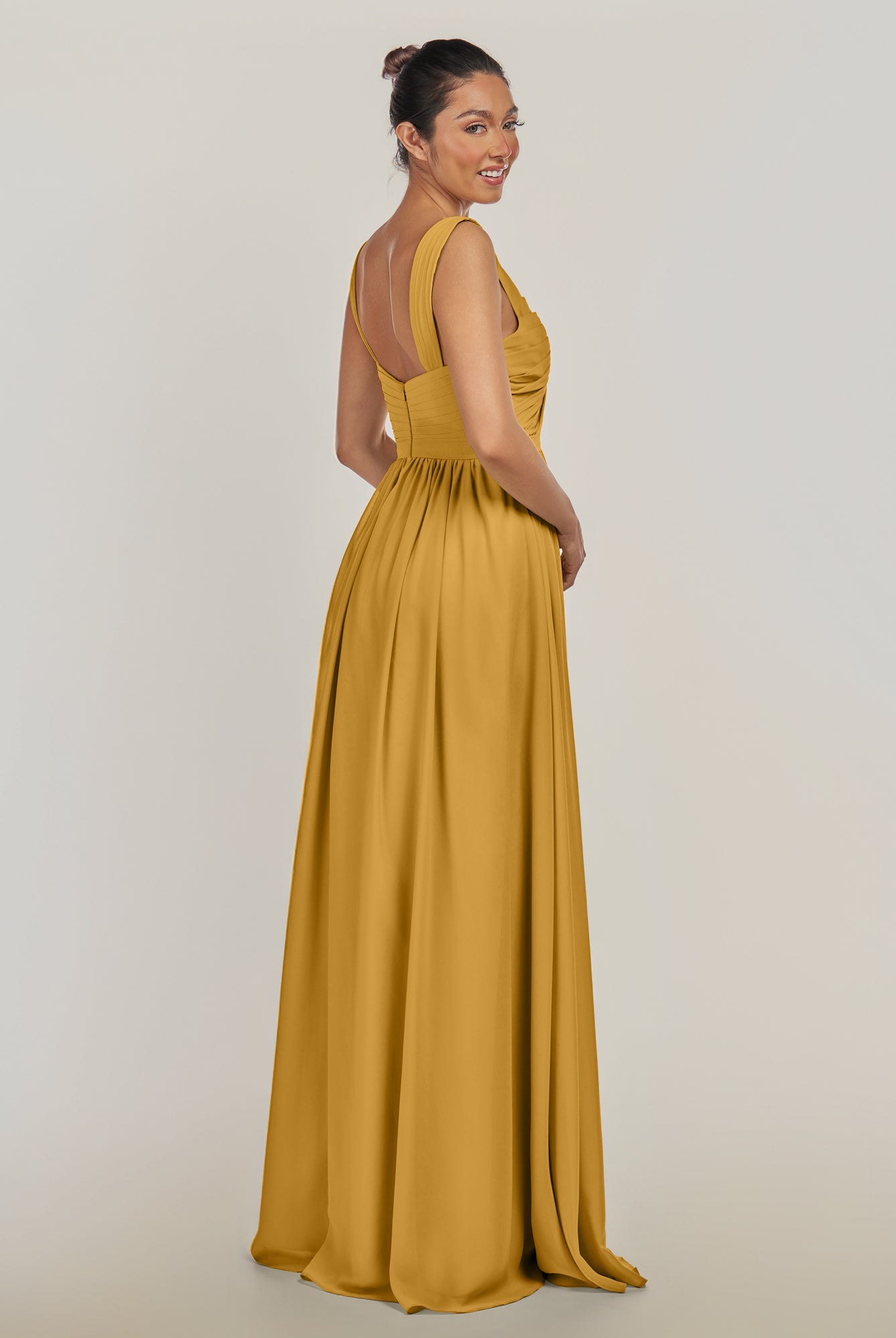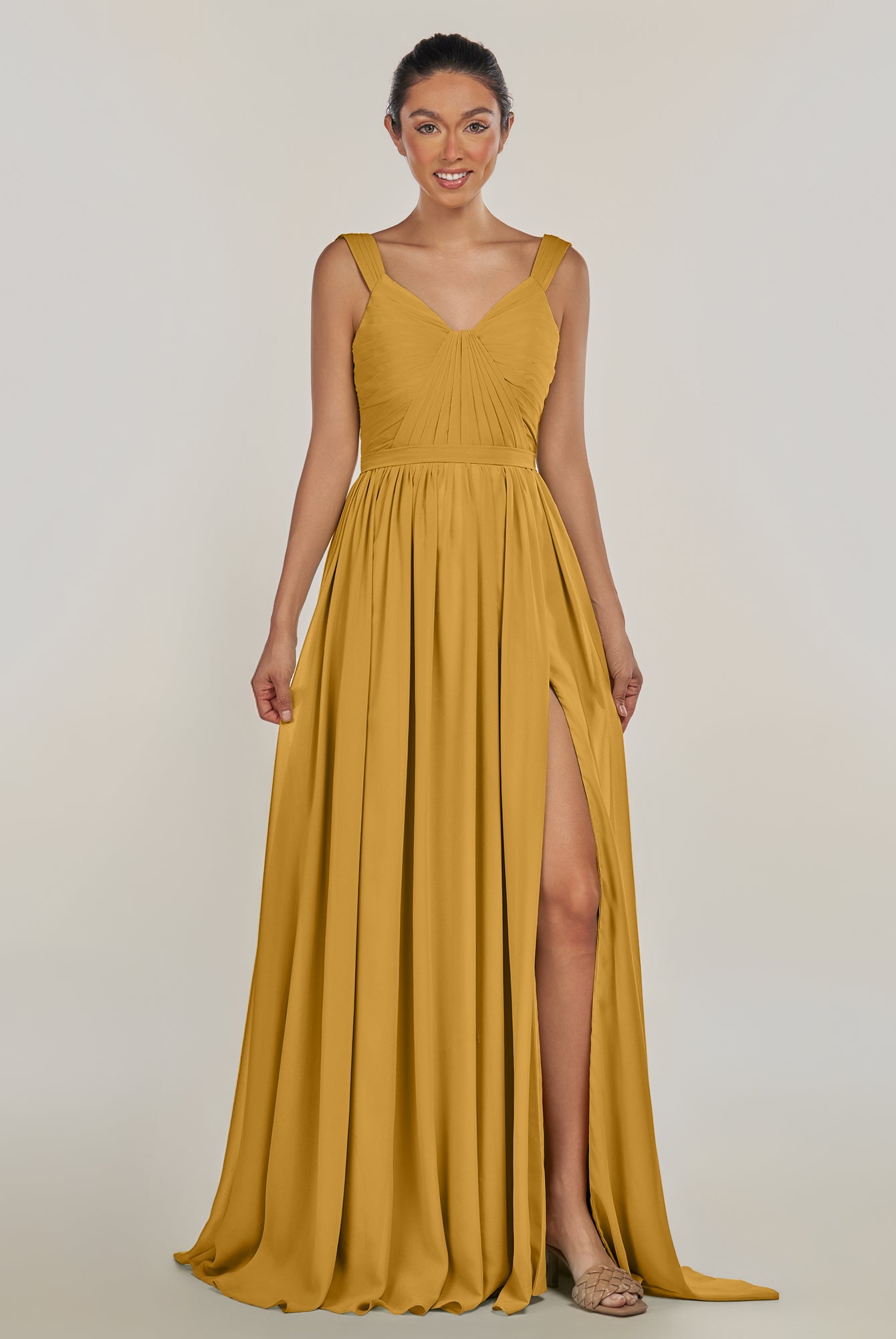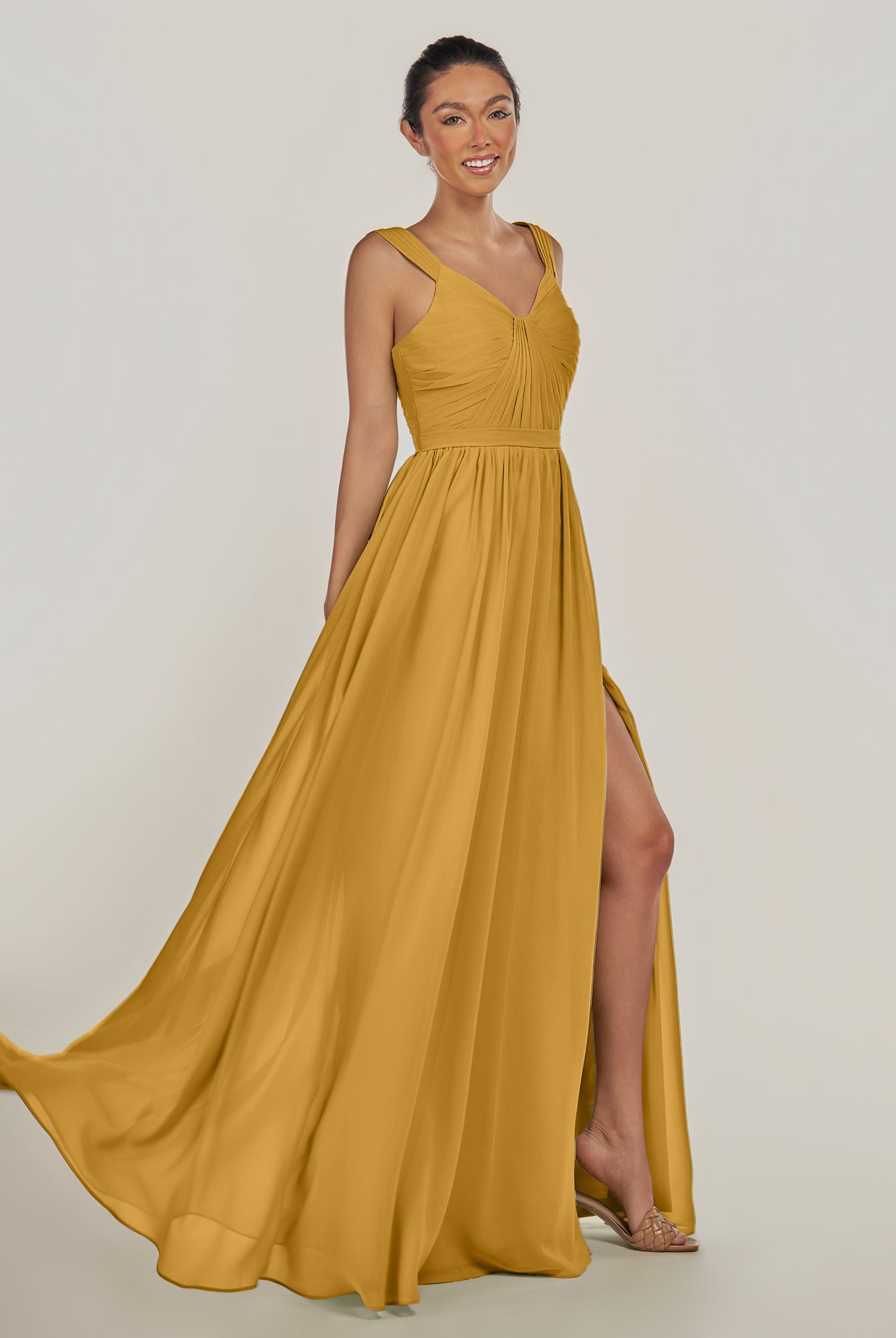 Fira | Marigold - A Line Chiffon V Neck Pleated Long Bridesmaid Dress with Slit