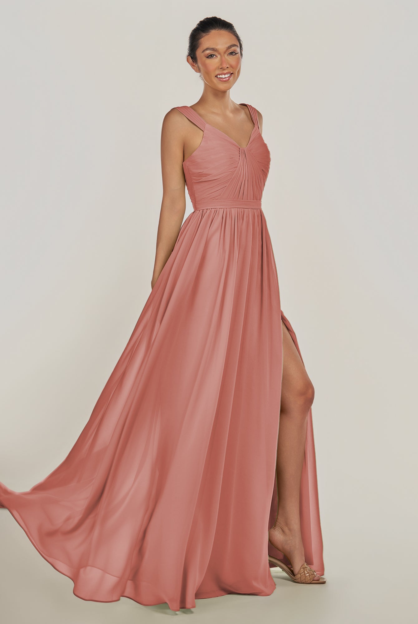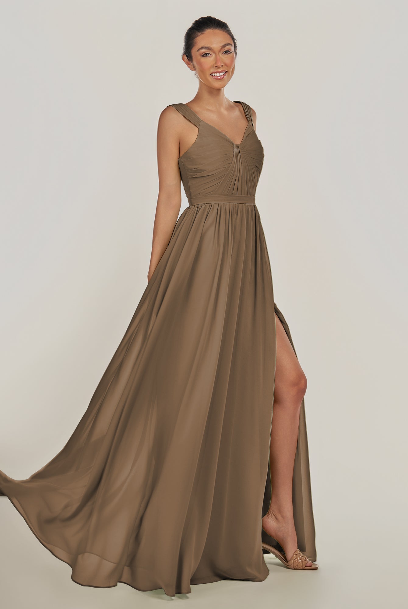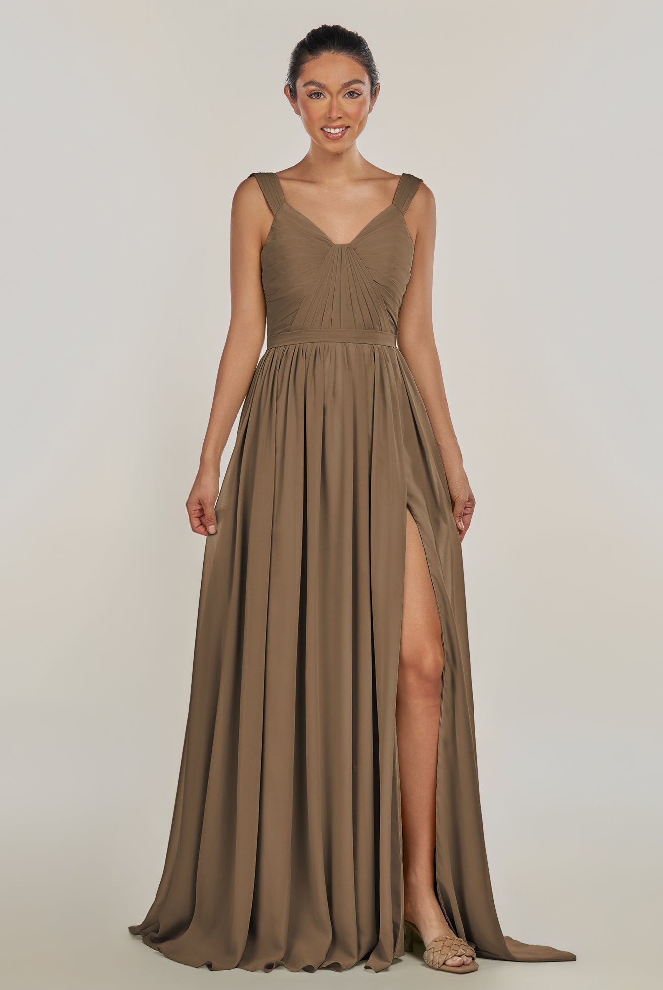Fira | Cinnamon - A Line Chiffon V Neck Pleated Long Bridesmaid Dress with Slit