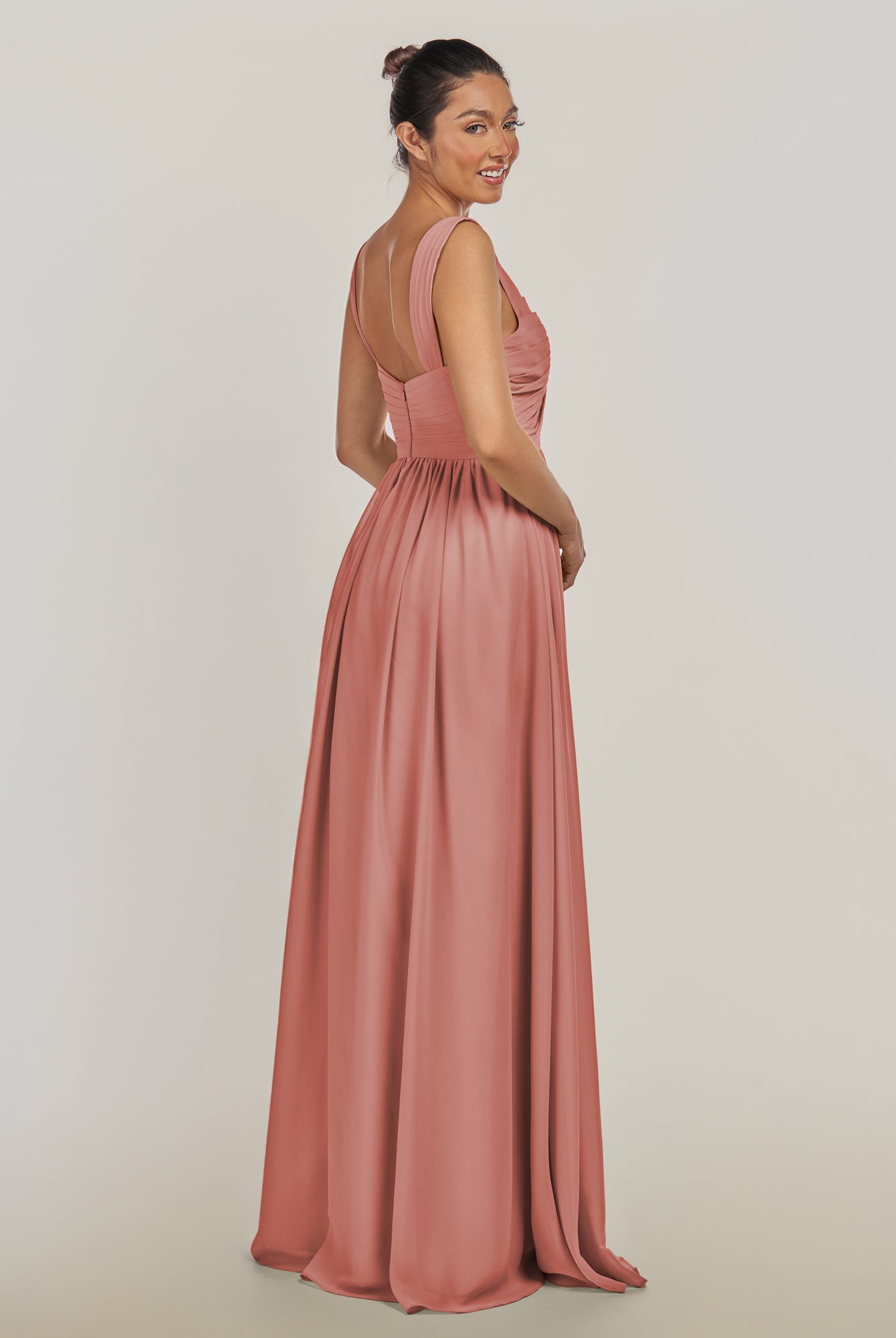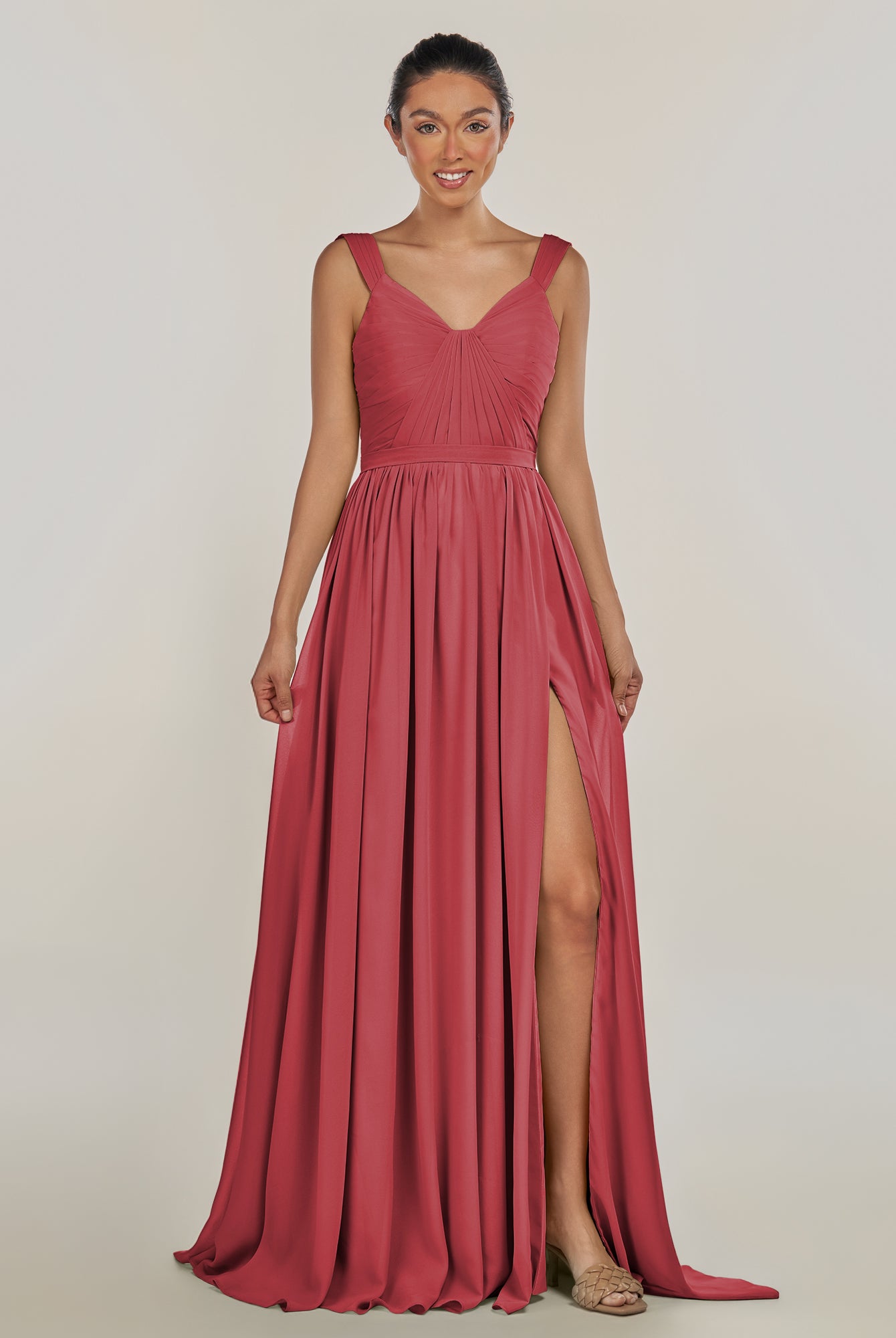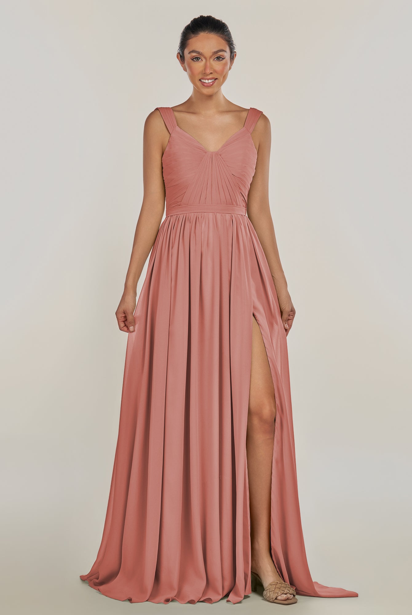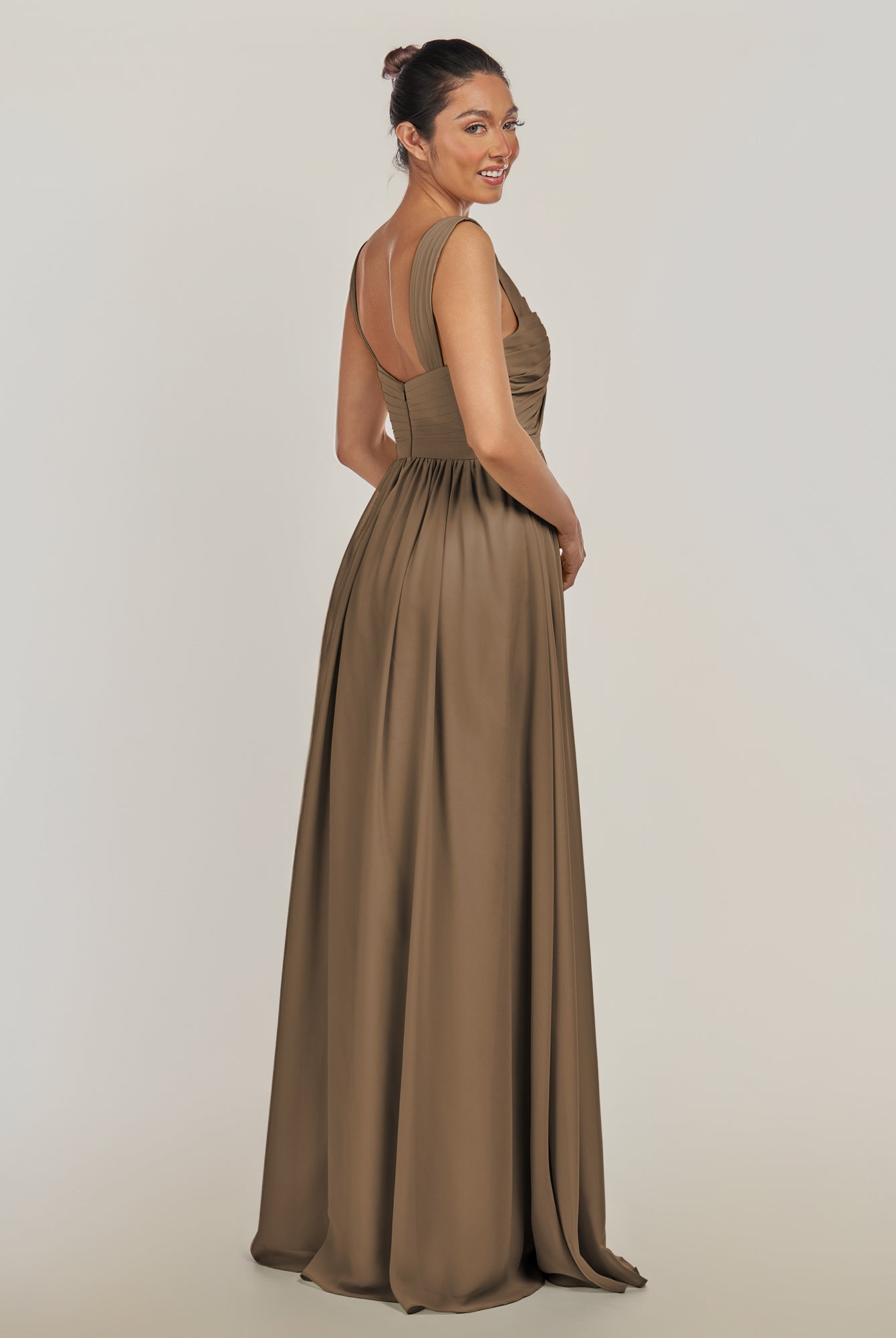 Fira | Cinnamon - A Line Chiffon V Neck Pleated Long Bridesmaid Dress with Slit