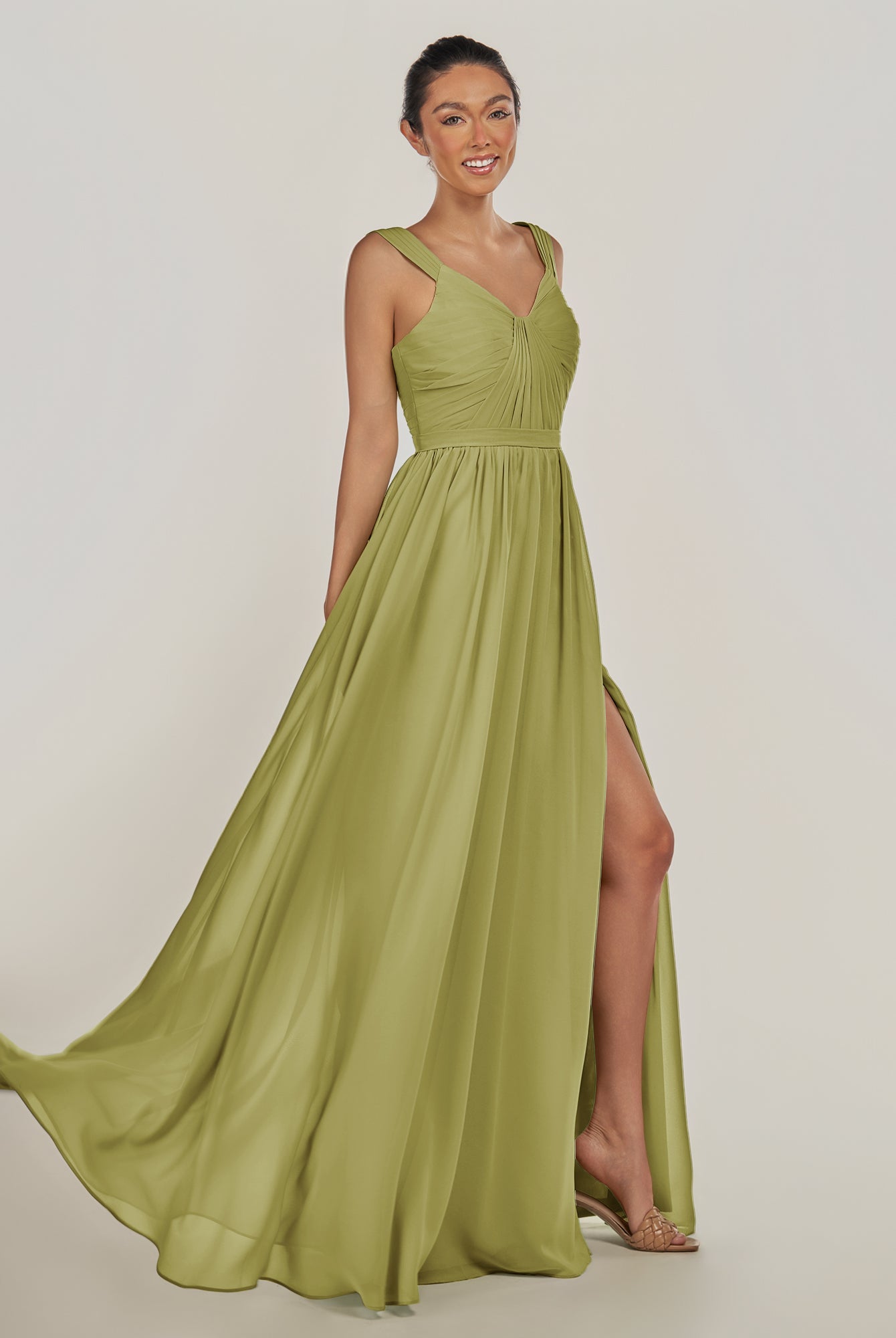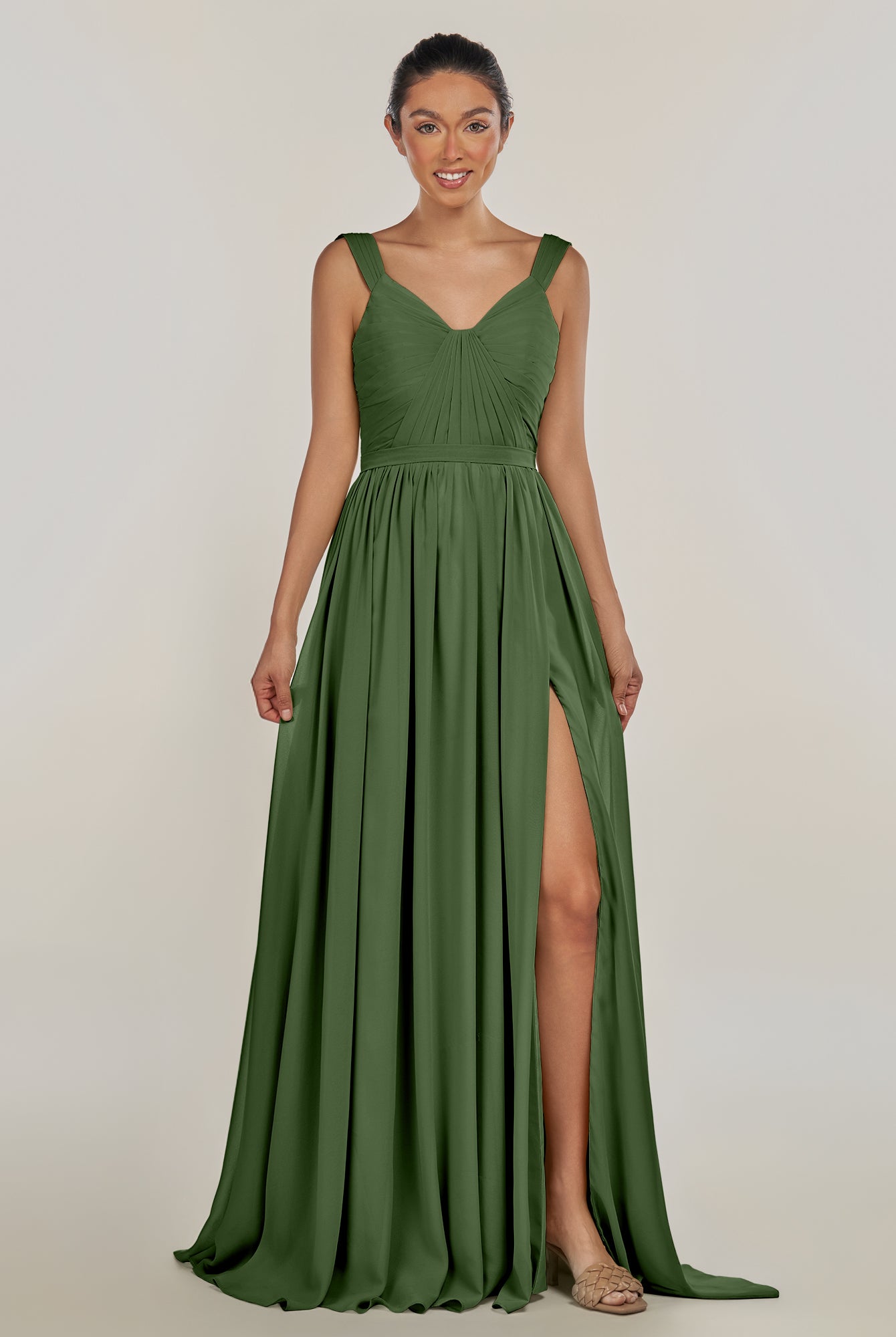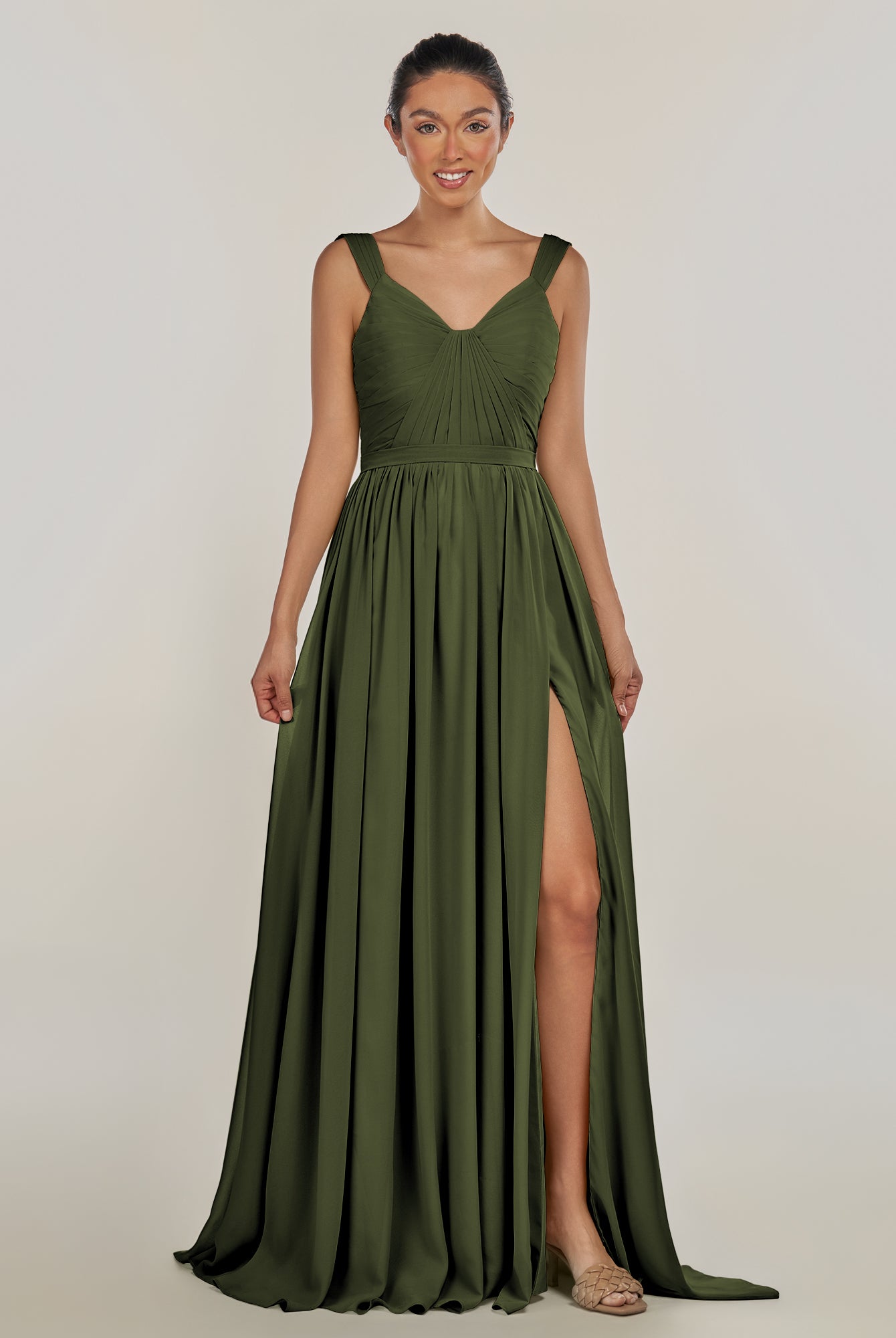 Fira | Olive - A Line Chiffon V Neck Pleated Long Bridesmaid Dress with Slit