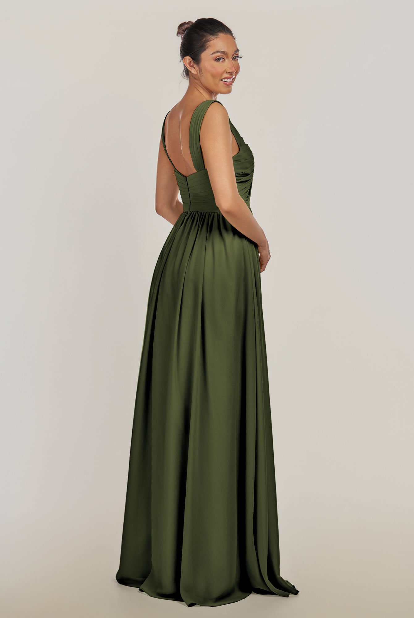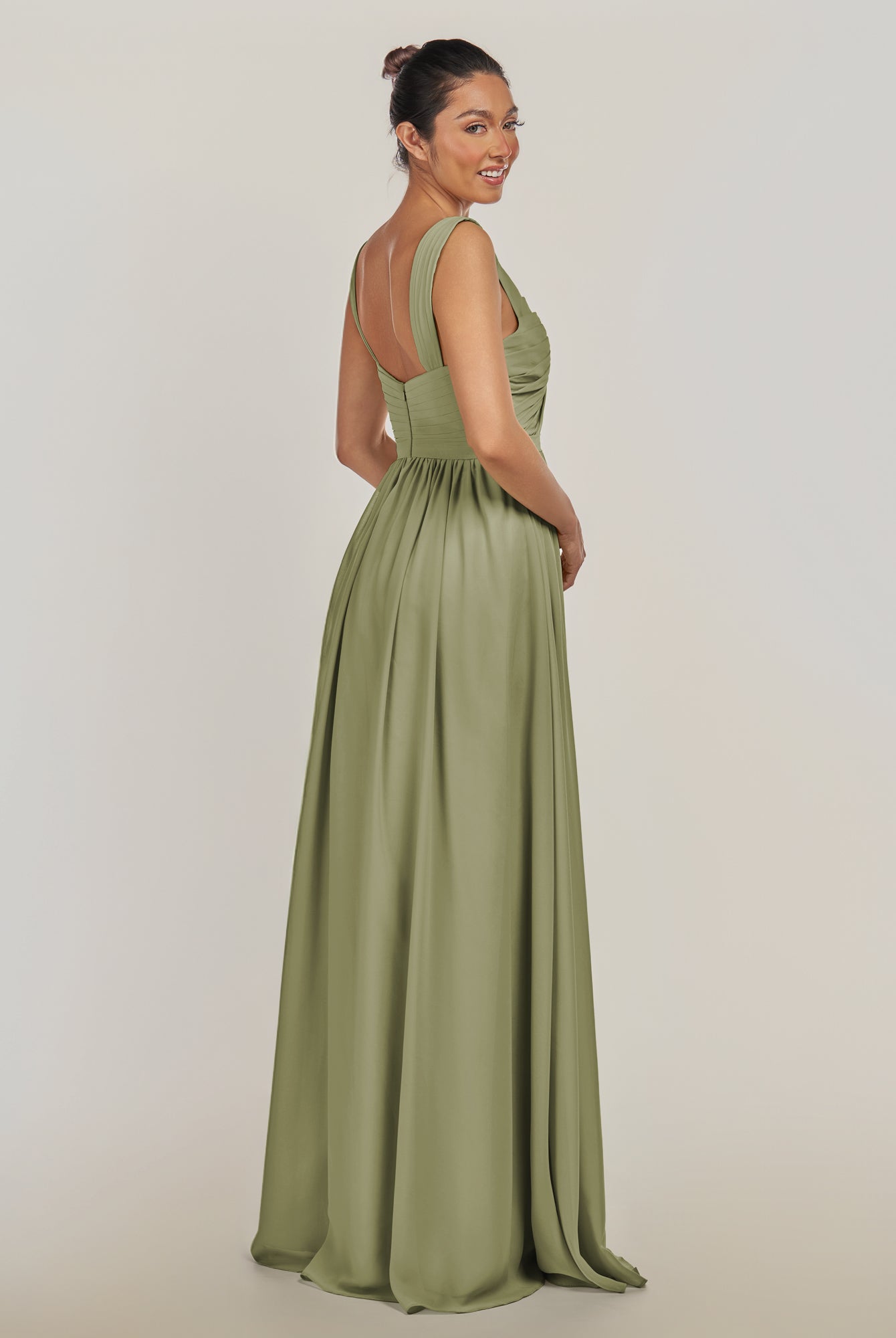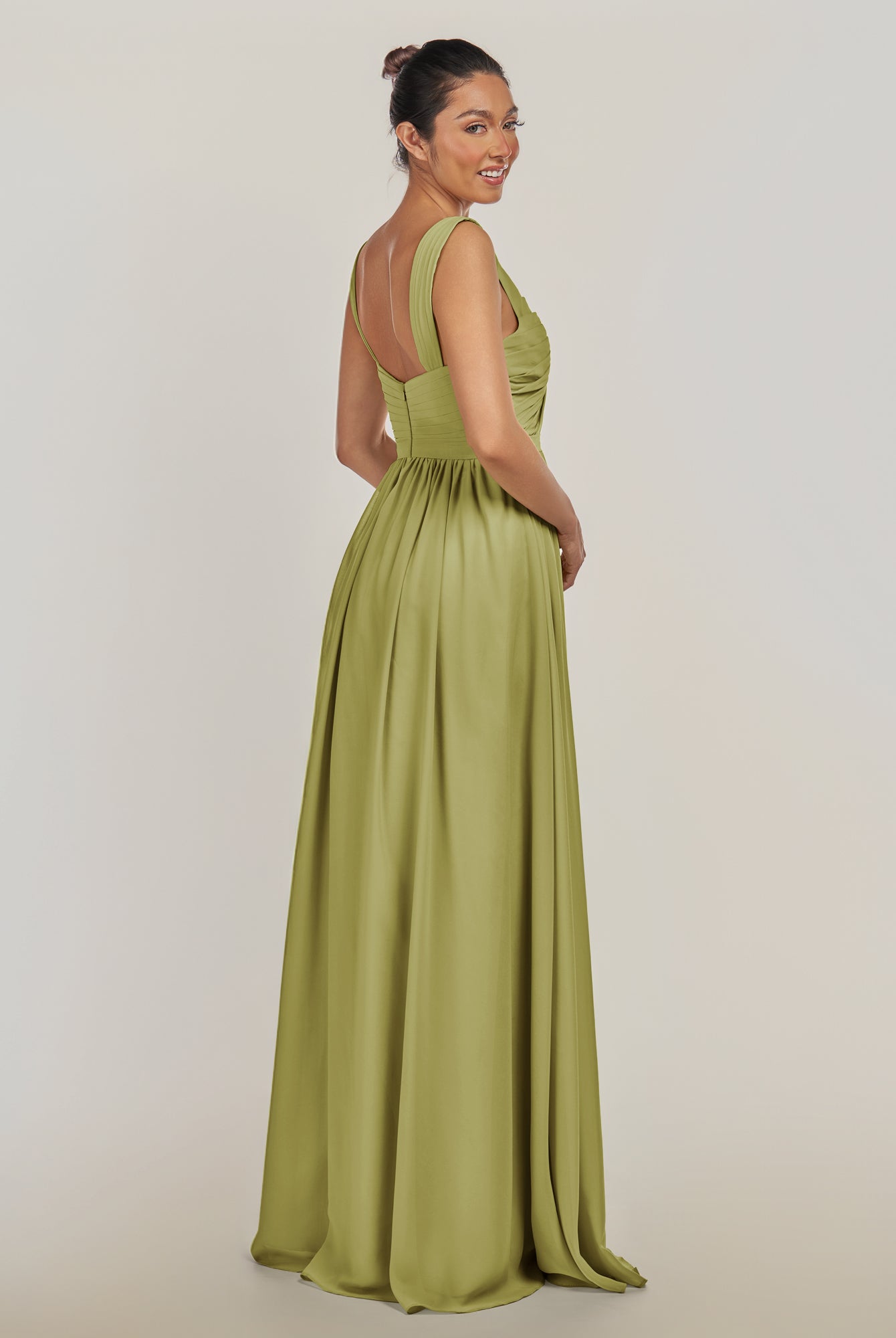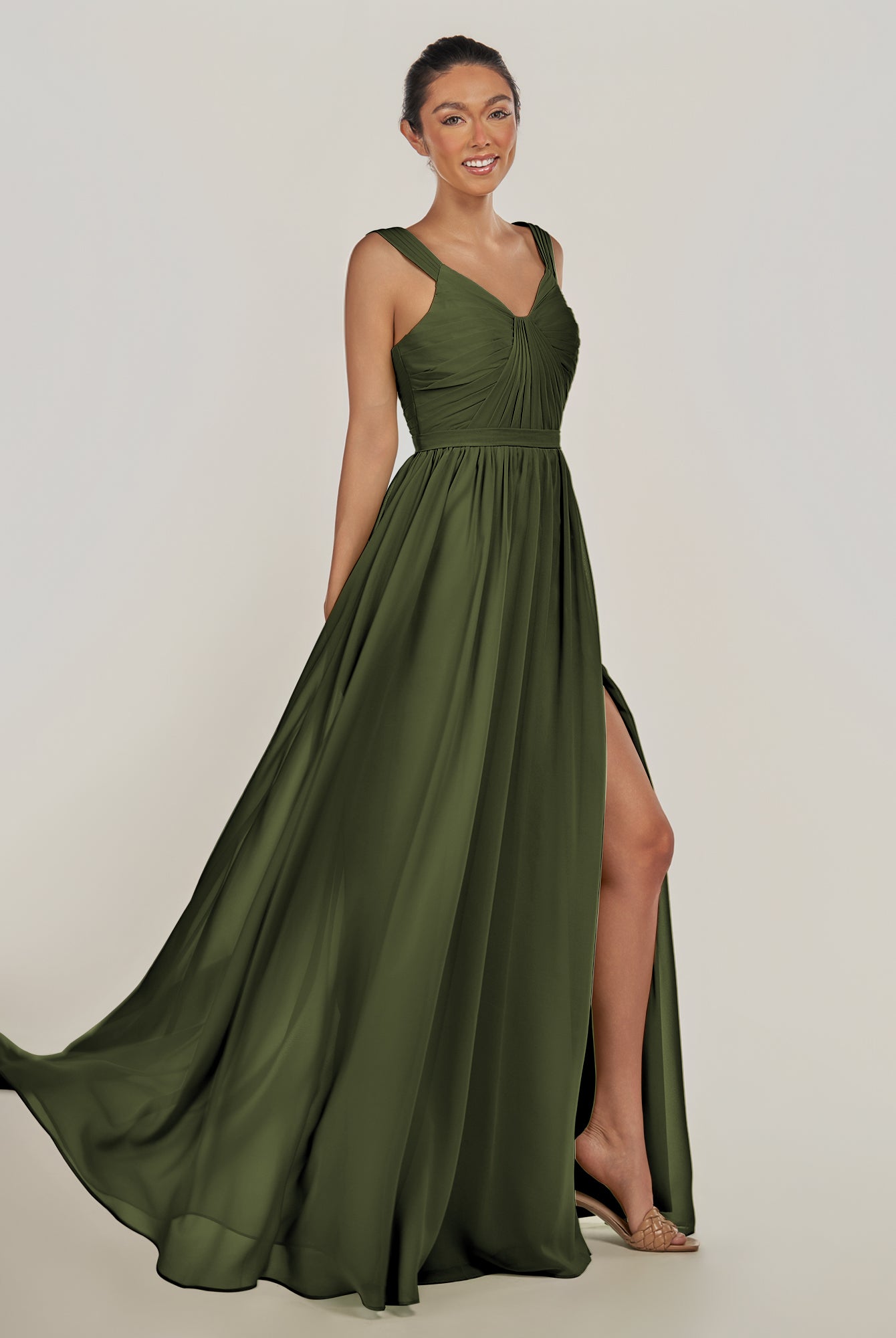 Fira | Olive - A Line Chiffon V Neck Pleated Long Bridesmaid Dress with Slit