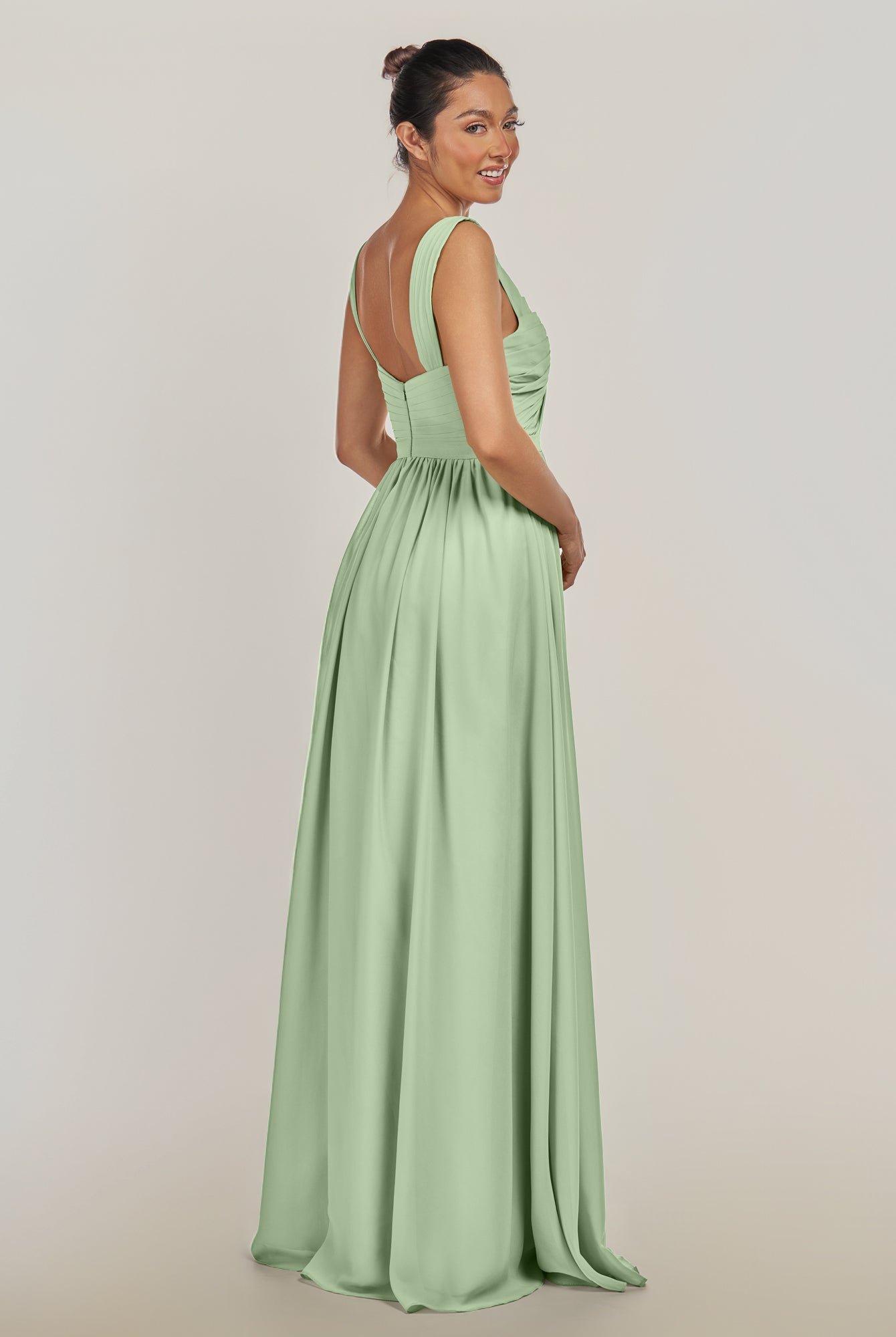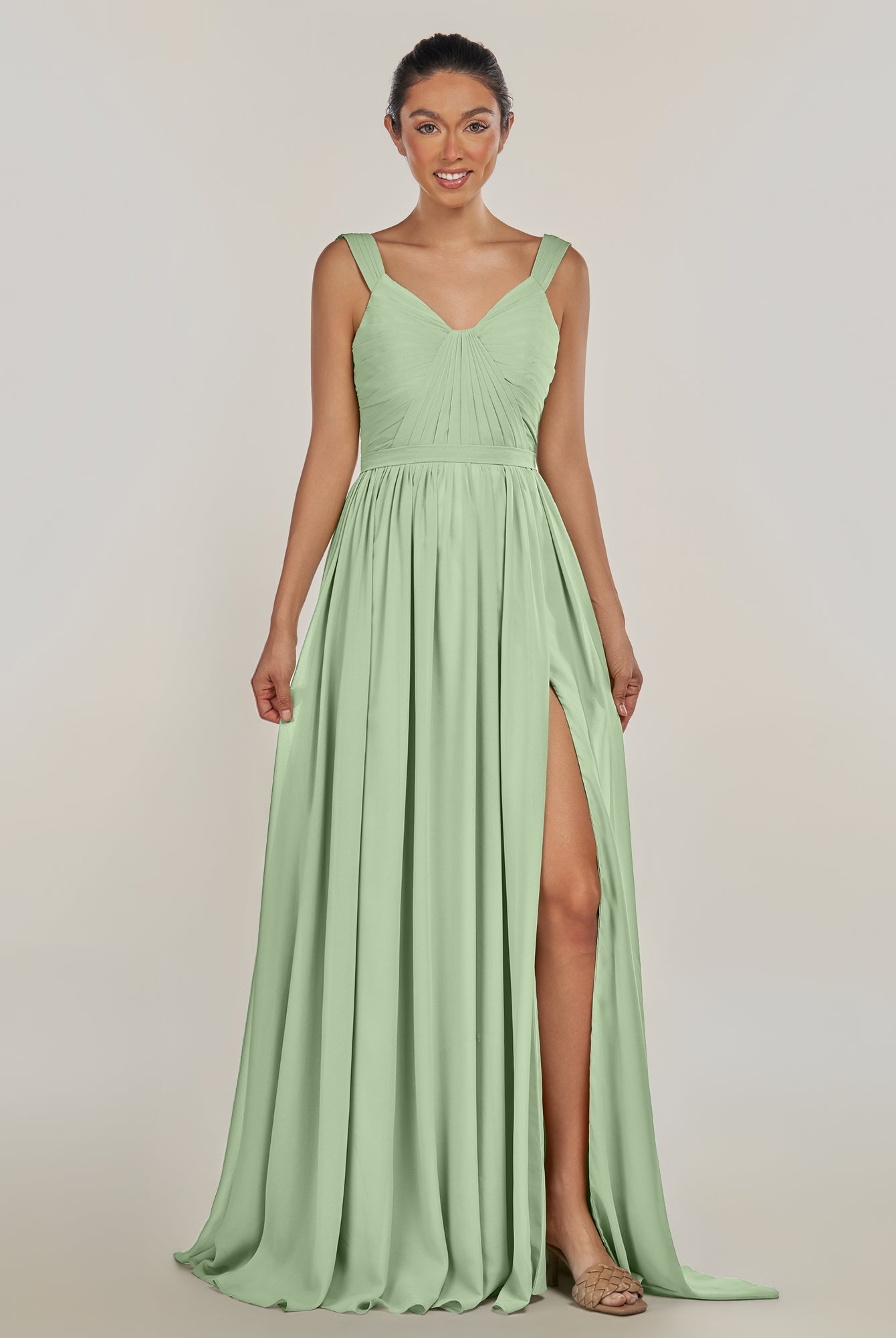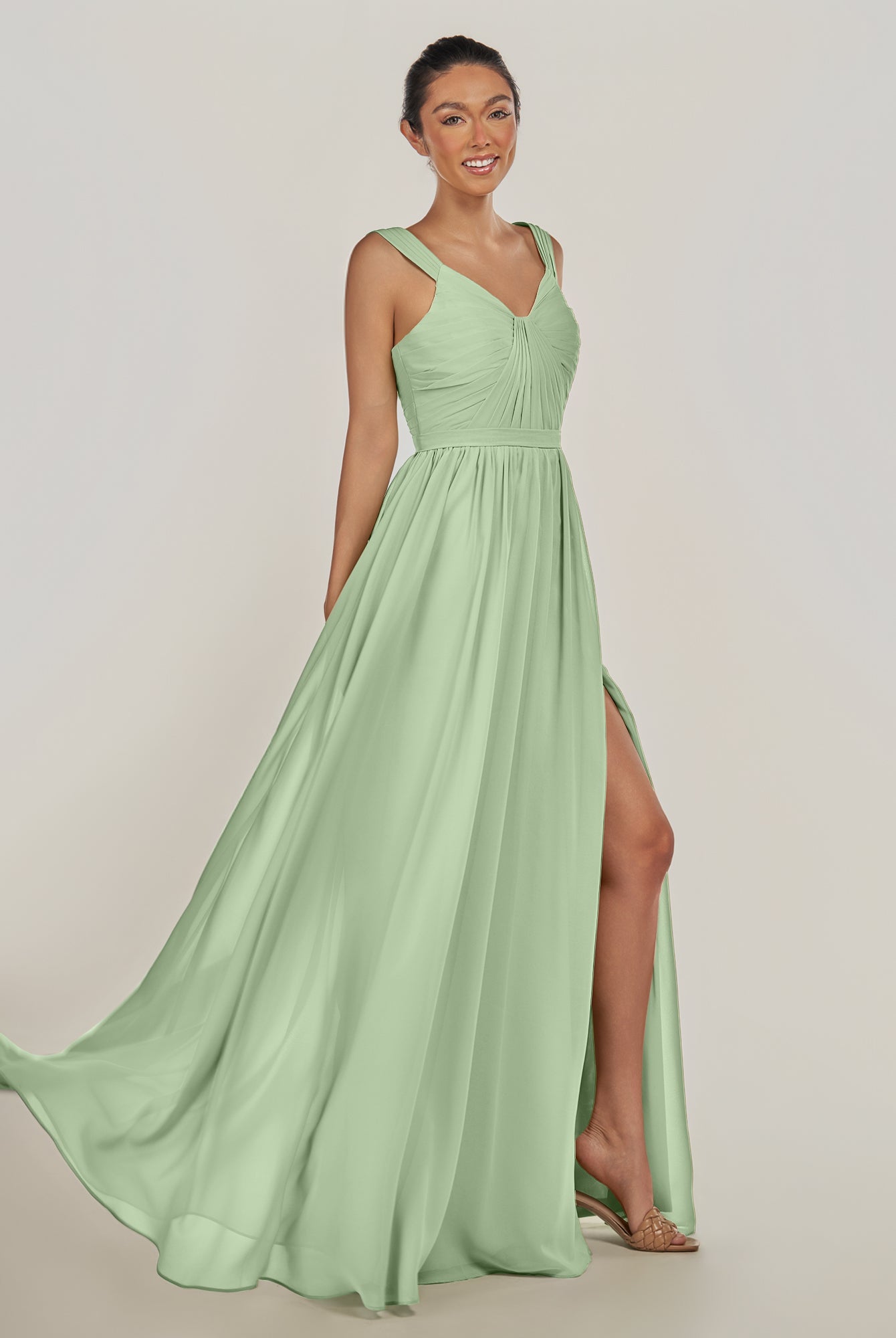 Fira | Pale Pistachio - A Line Chiffon V Neck Pleated Long Bridesmaid Dress with Slit