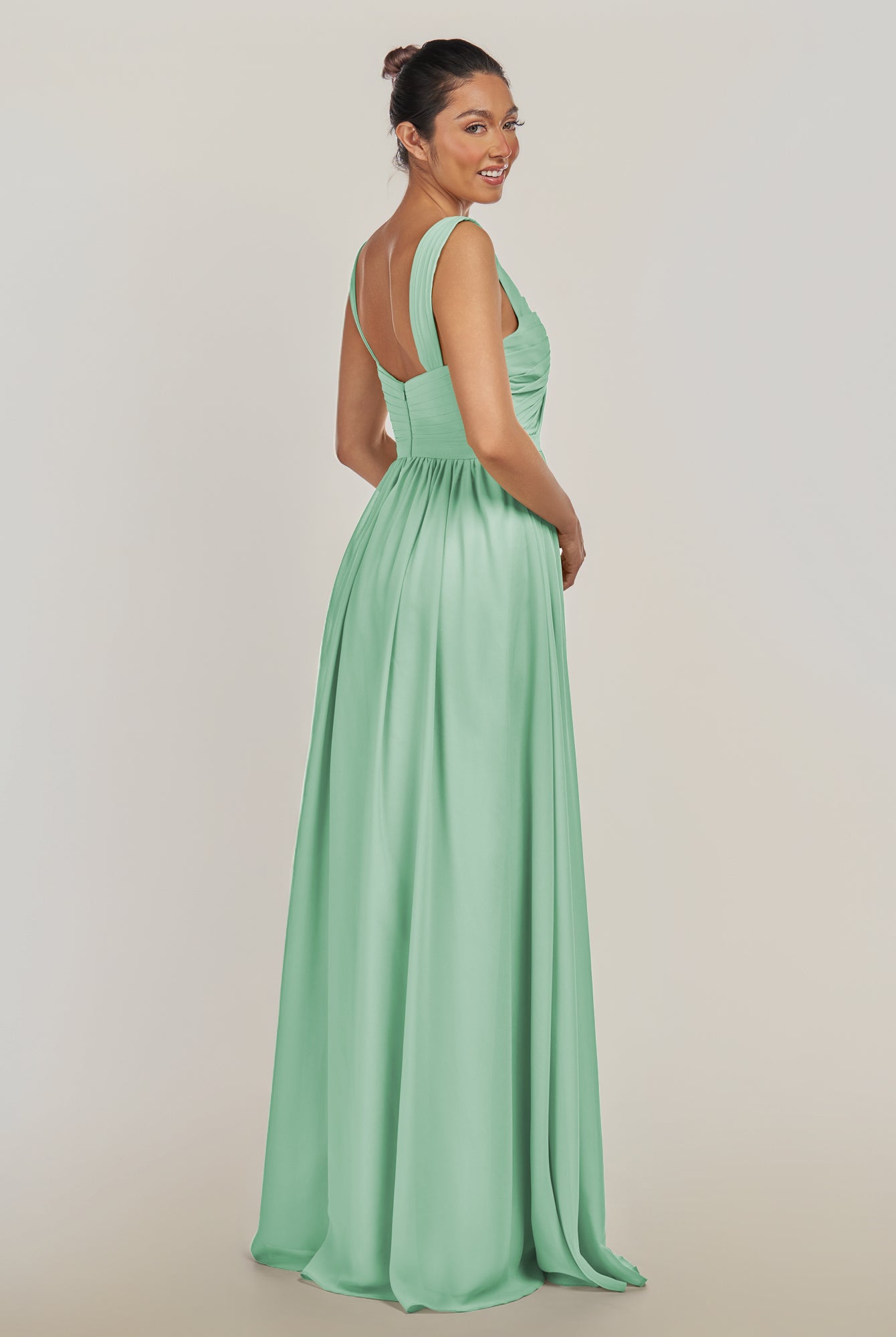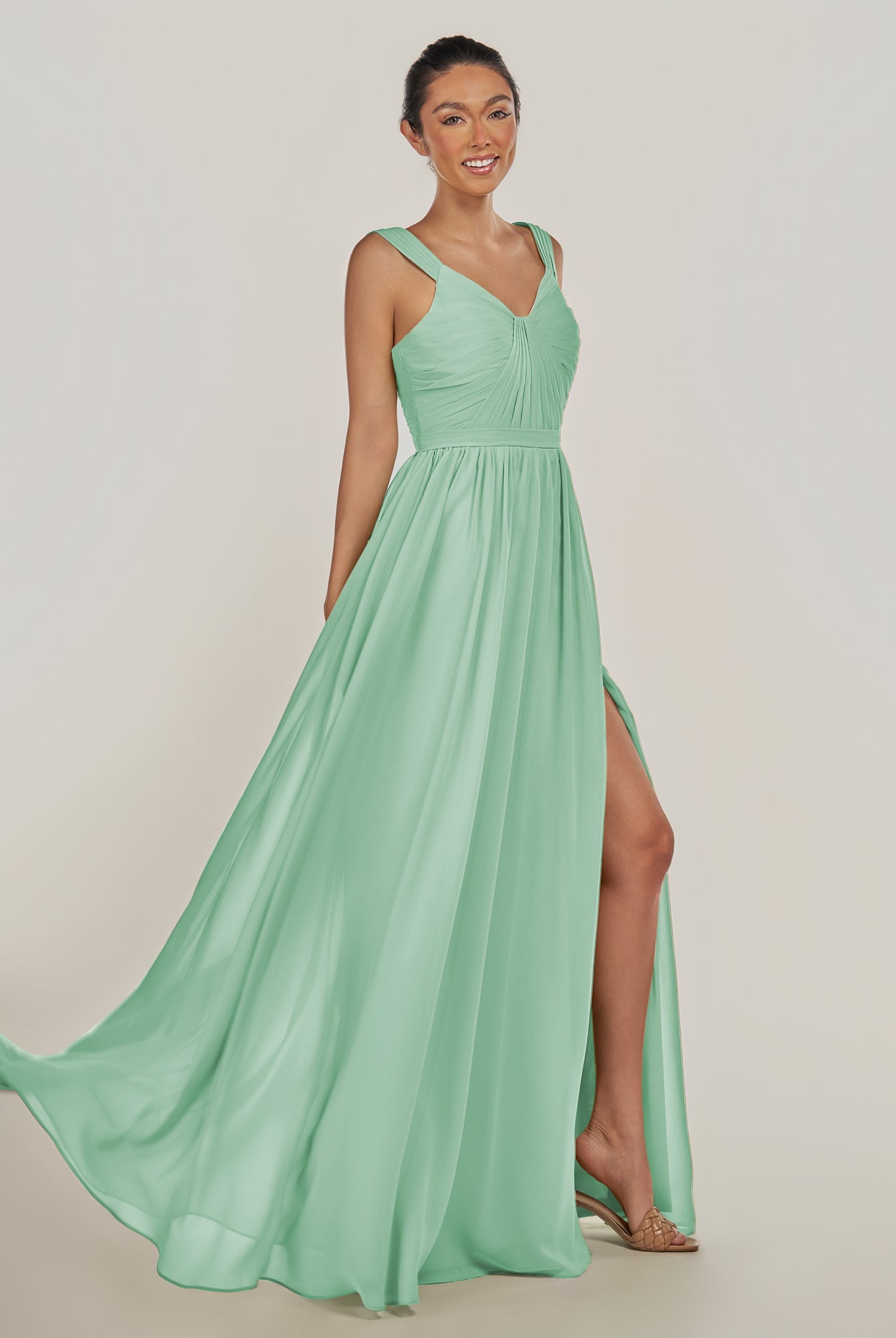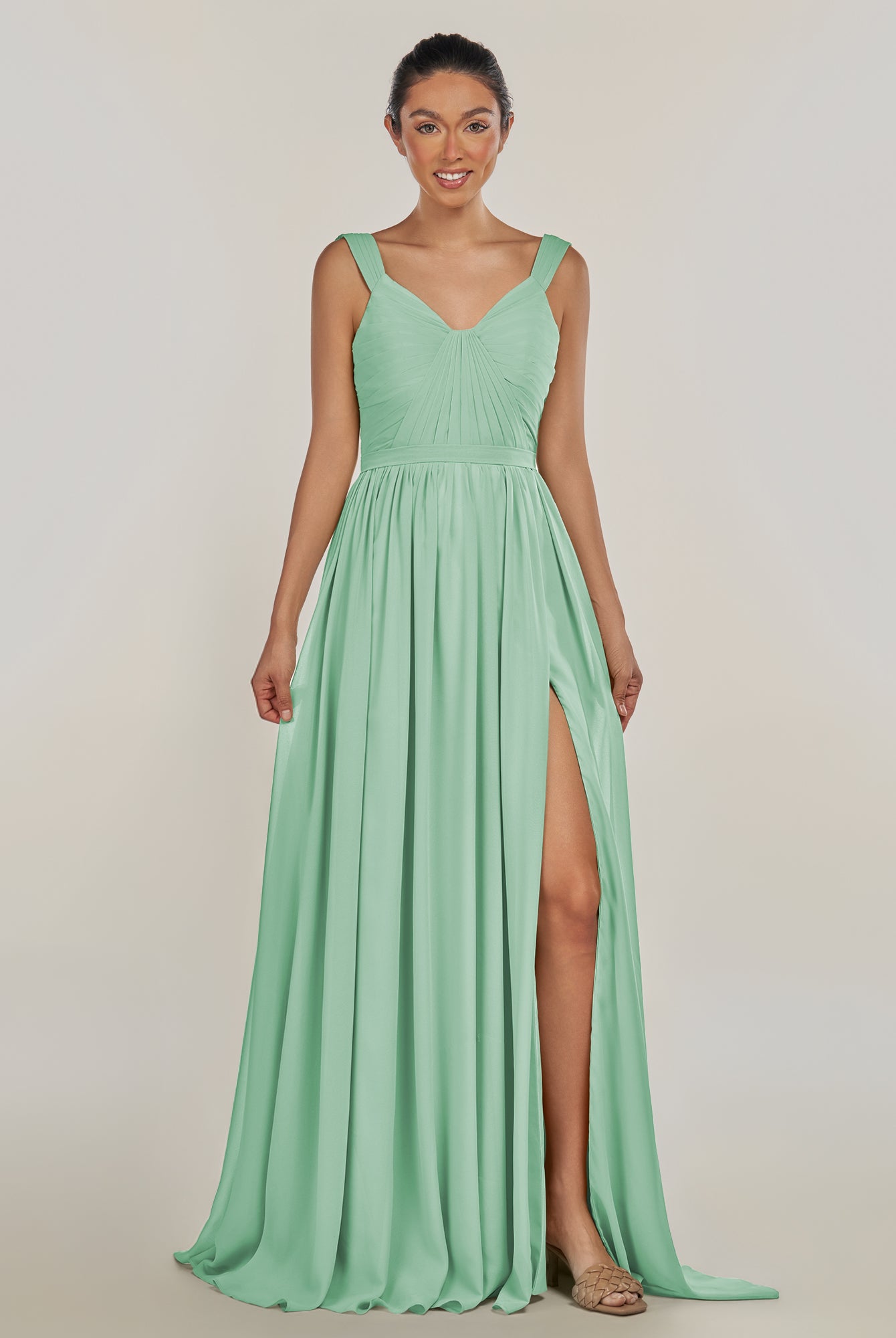 Fira | Pale Pistachio - A Line Chiffon V Neck Pleated Long Bridesmaid Dress with Slit