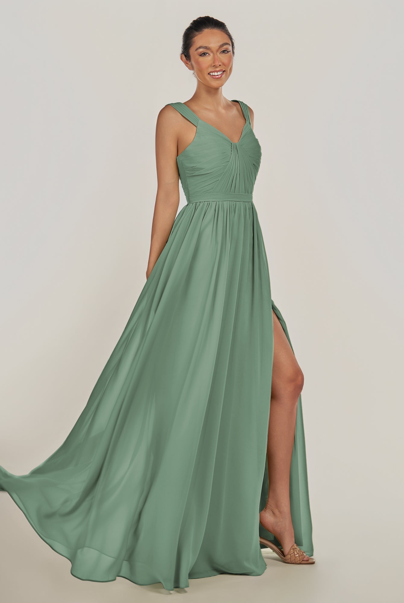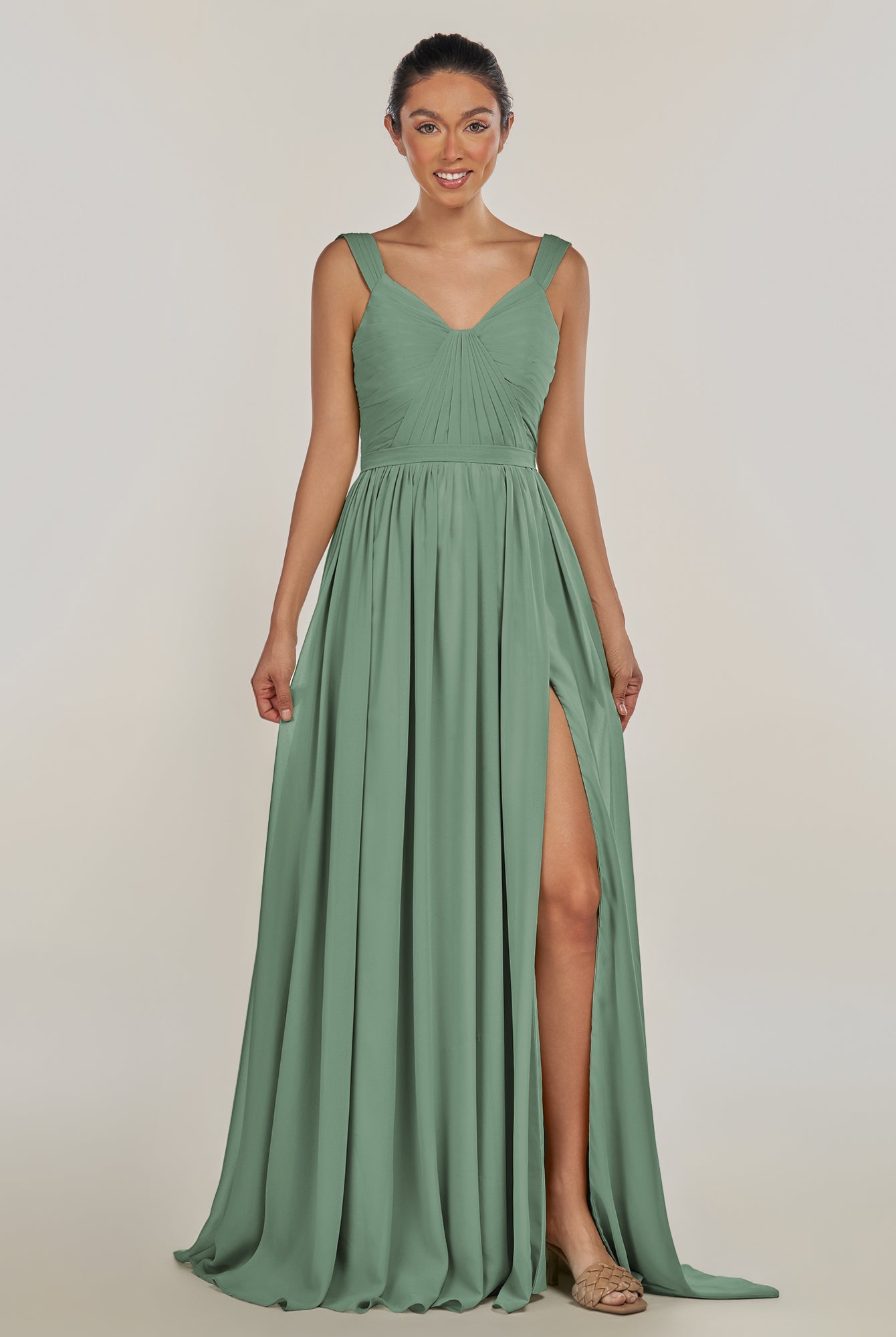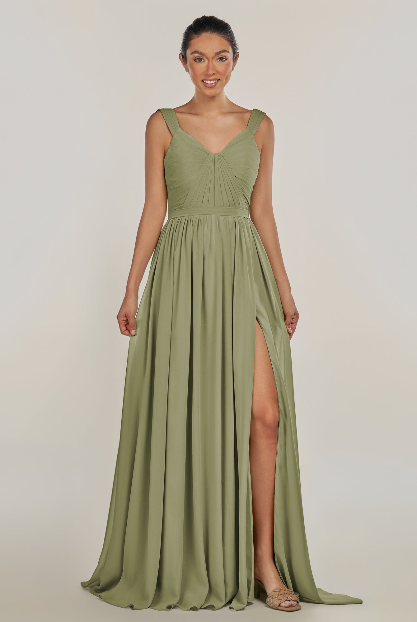 Fira | Sage - A Line Chiffon V Neck Pleated Long Bridesmaid Dress with Slit