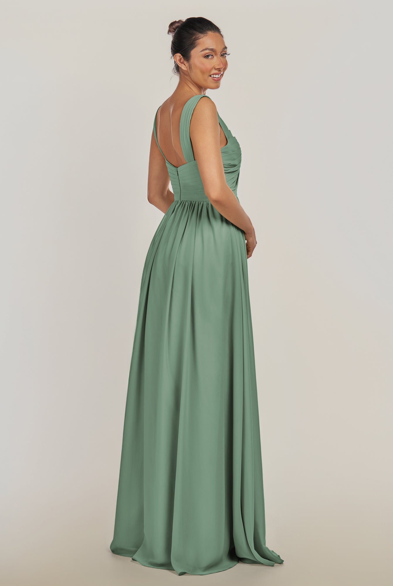 Fira | Willow Green - A Line Chiffon V Neck Pleated Long Bridesmaid Dress with Slit