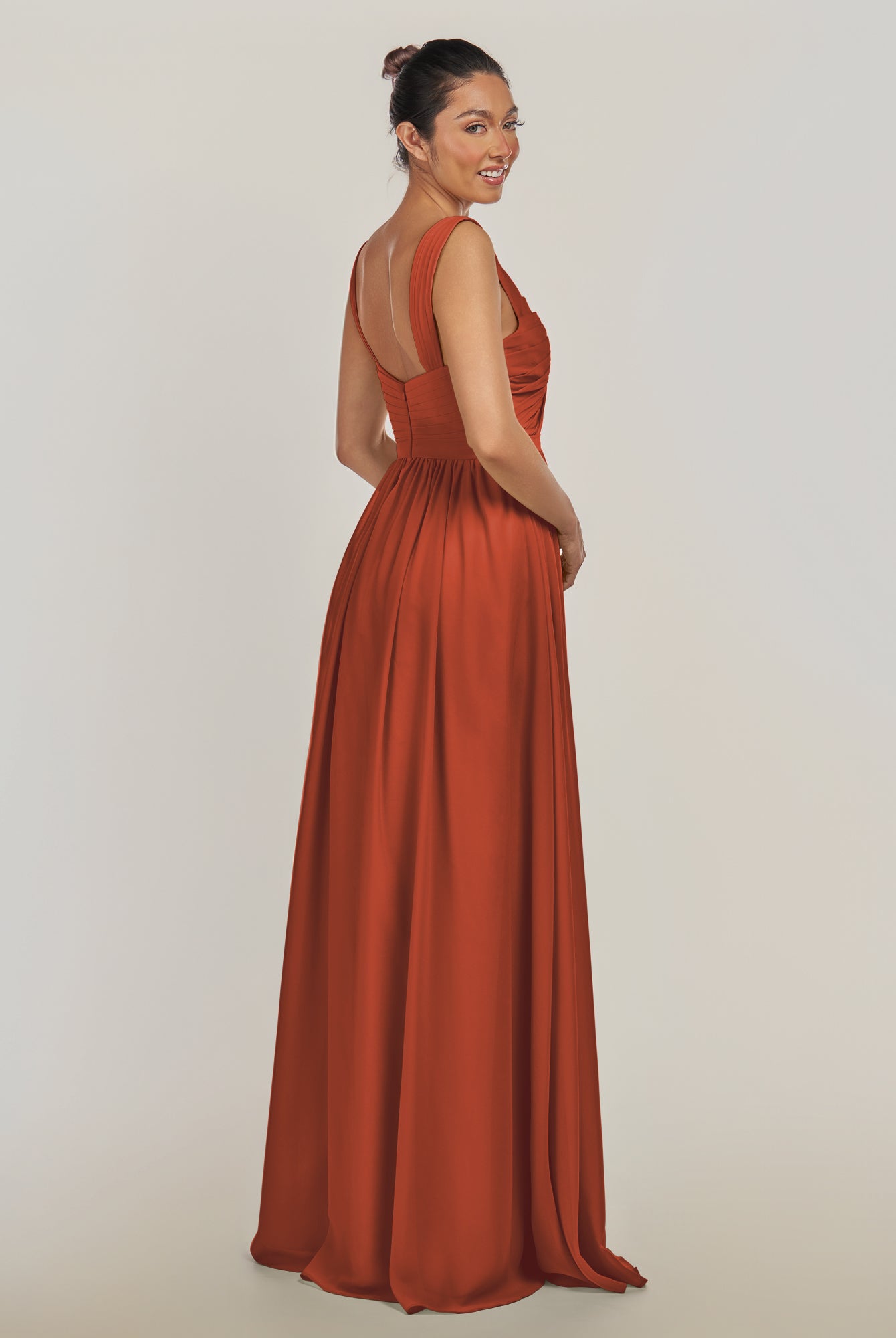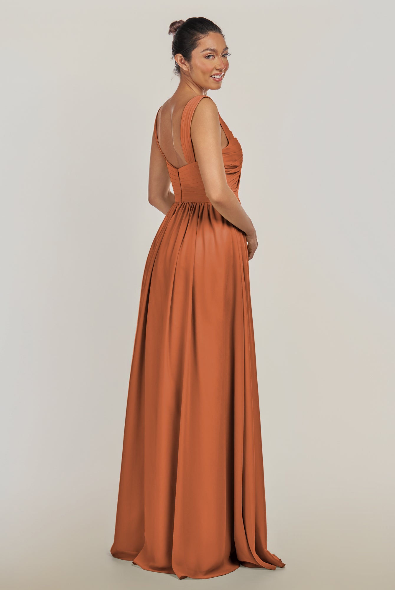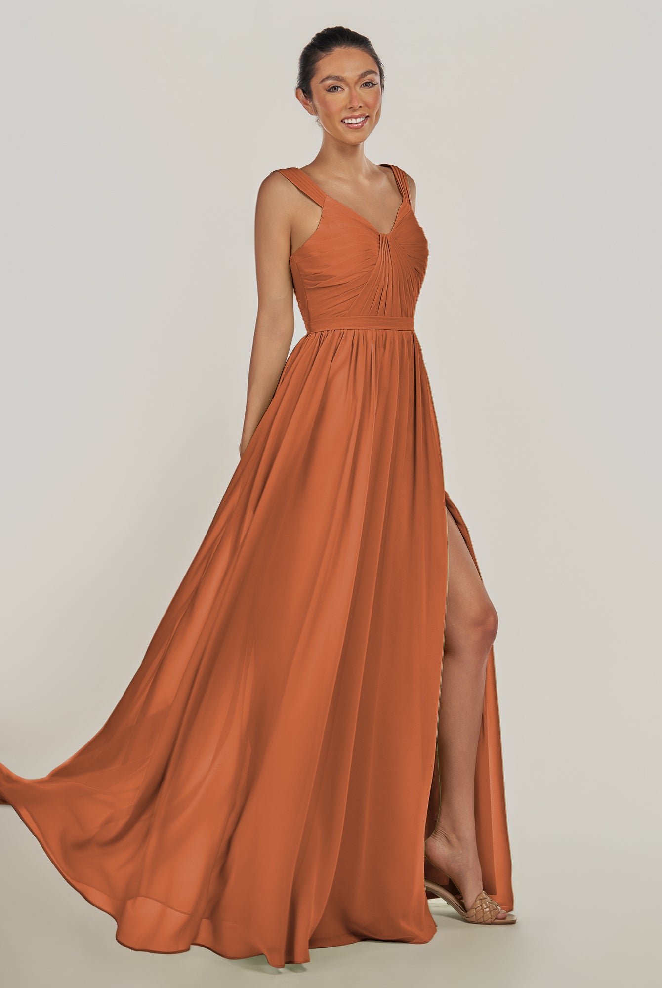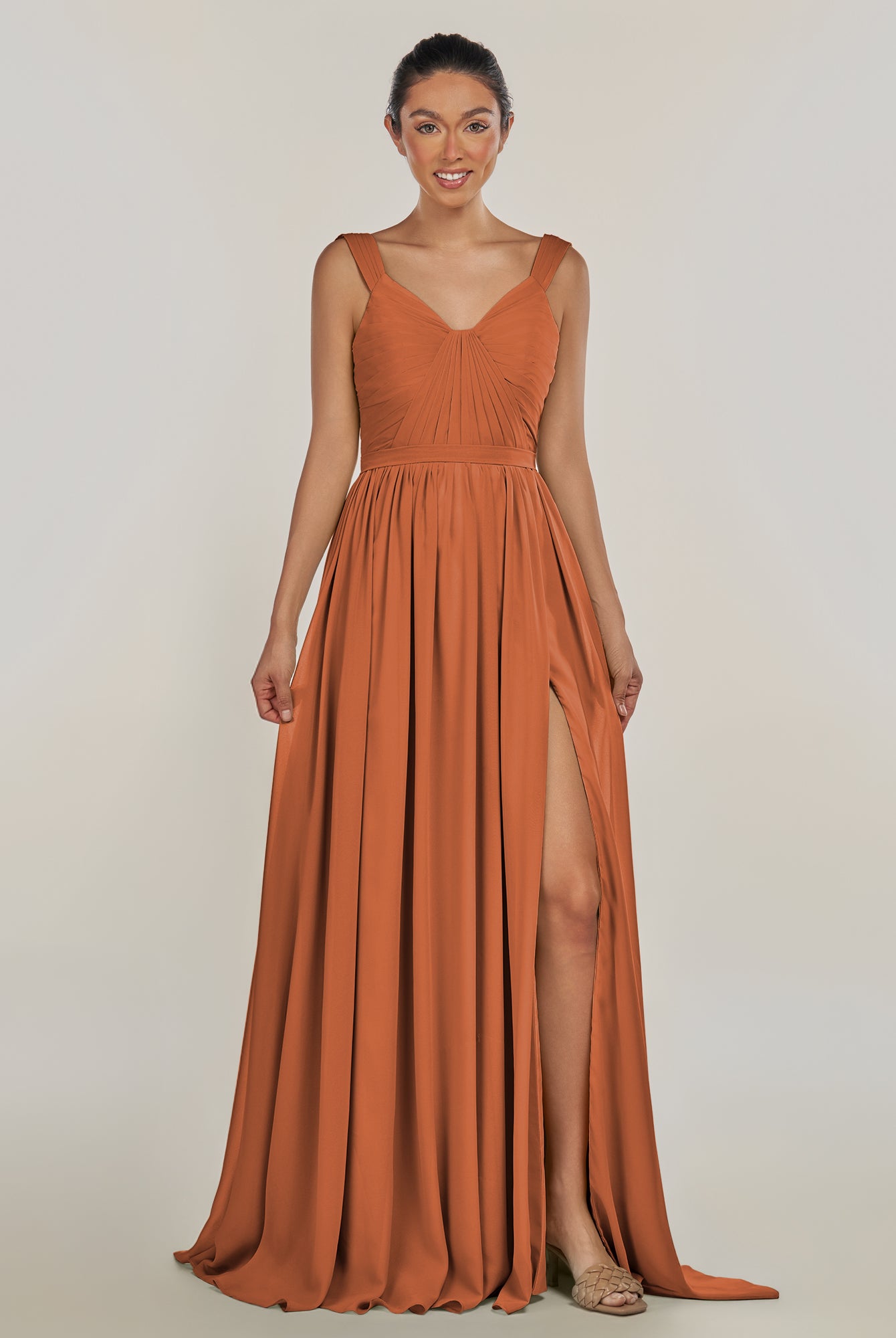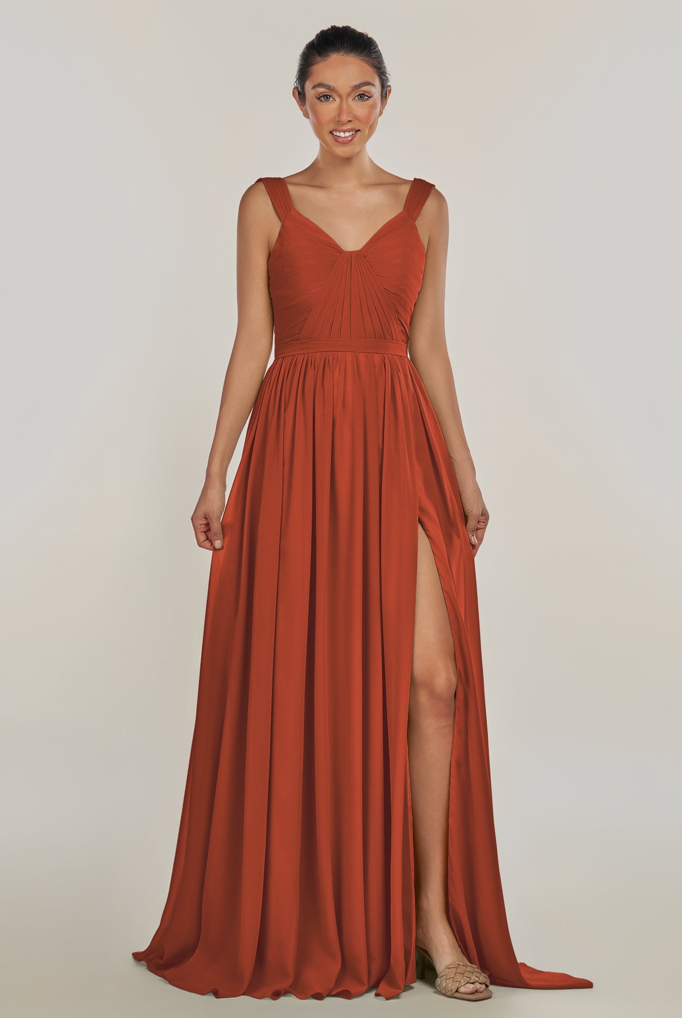 Fira | Terracotta - A Line Chiffon V Neck Pleated Long Bridesmaid Dress with Slit