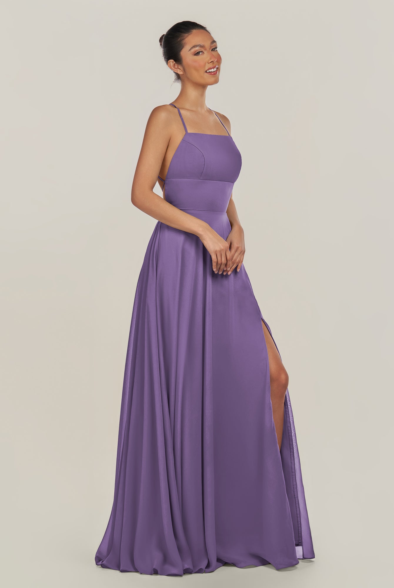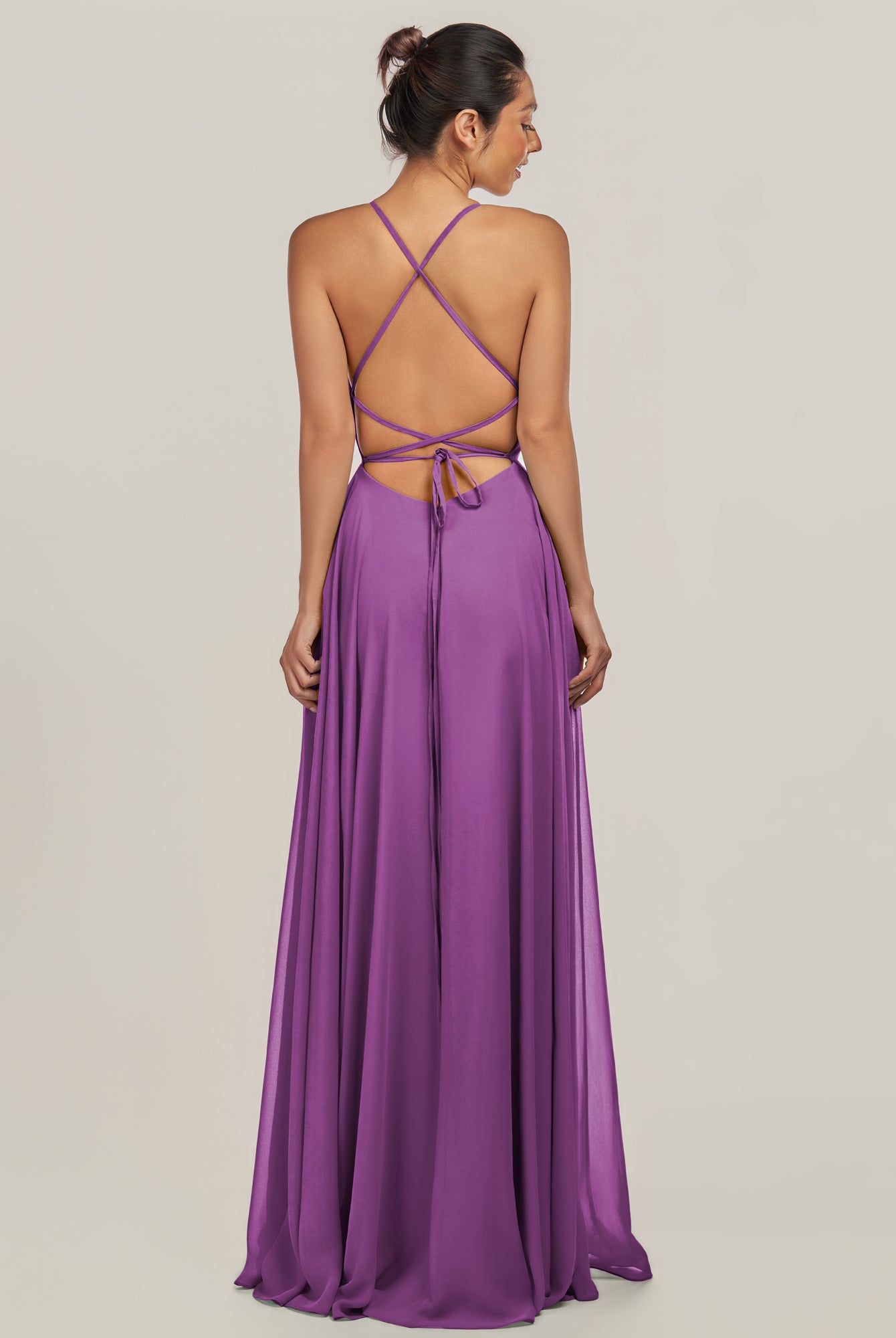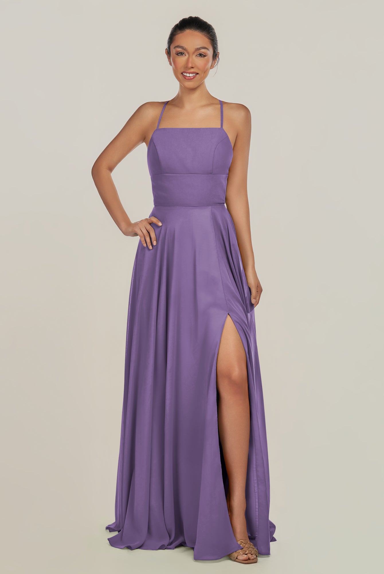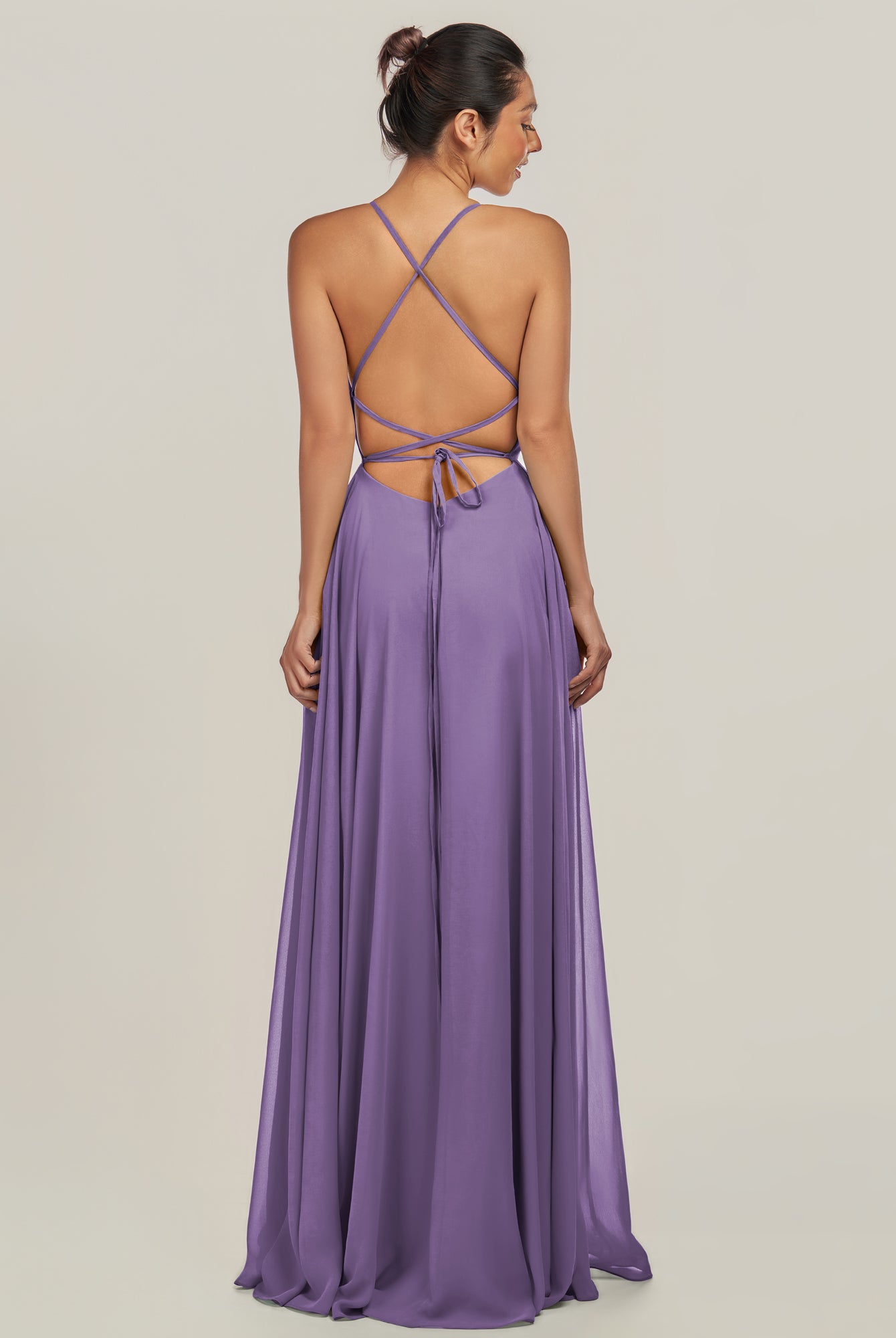 Dena | Wisteria - A Line Chiffon Spaghetti Straps Long Bridesmaid Dress with Slit