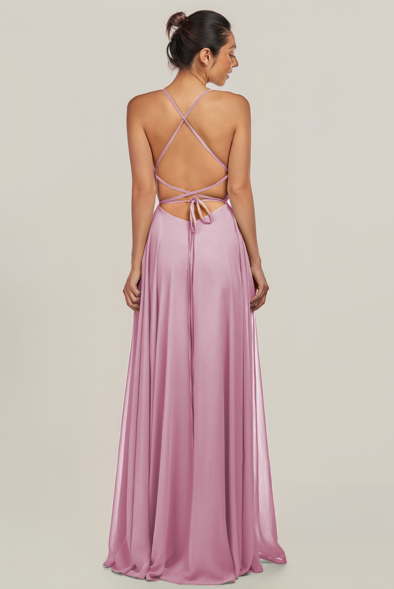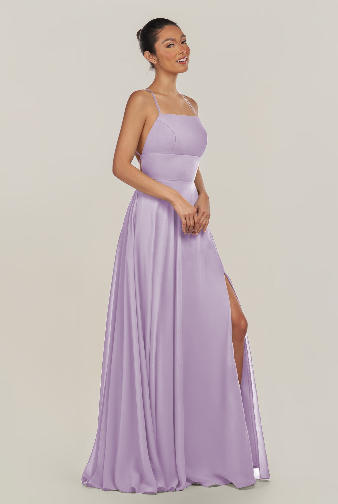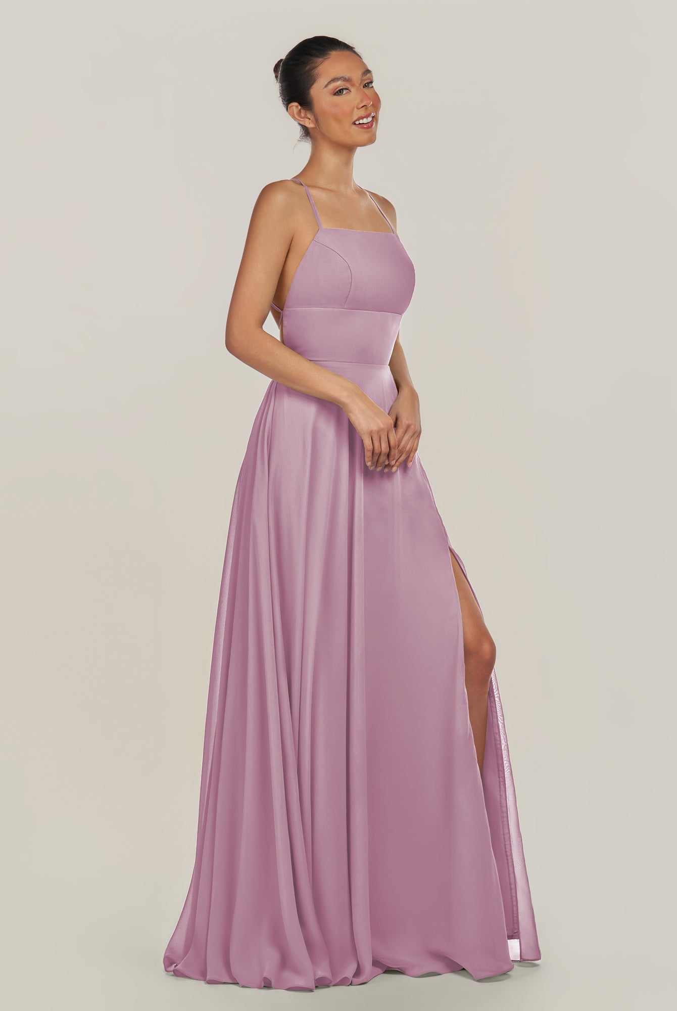 Dena | Wisteria - A Line Chiffon Spaghetti Straps Long Bridesmaid Dress with Slit