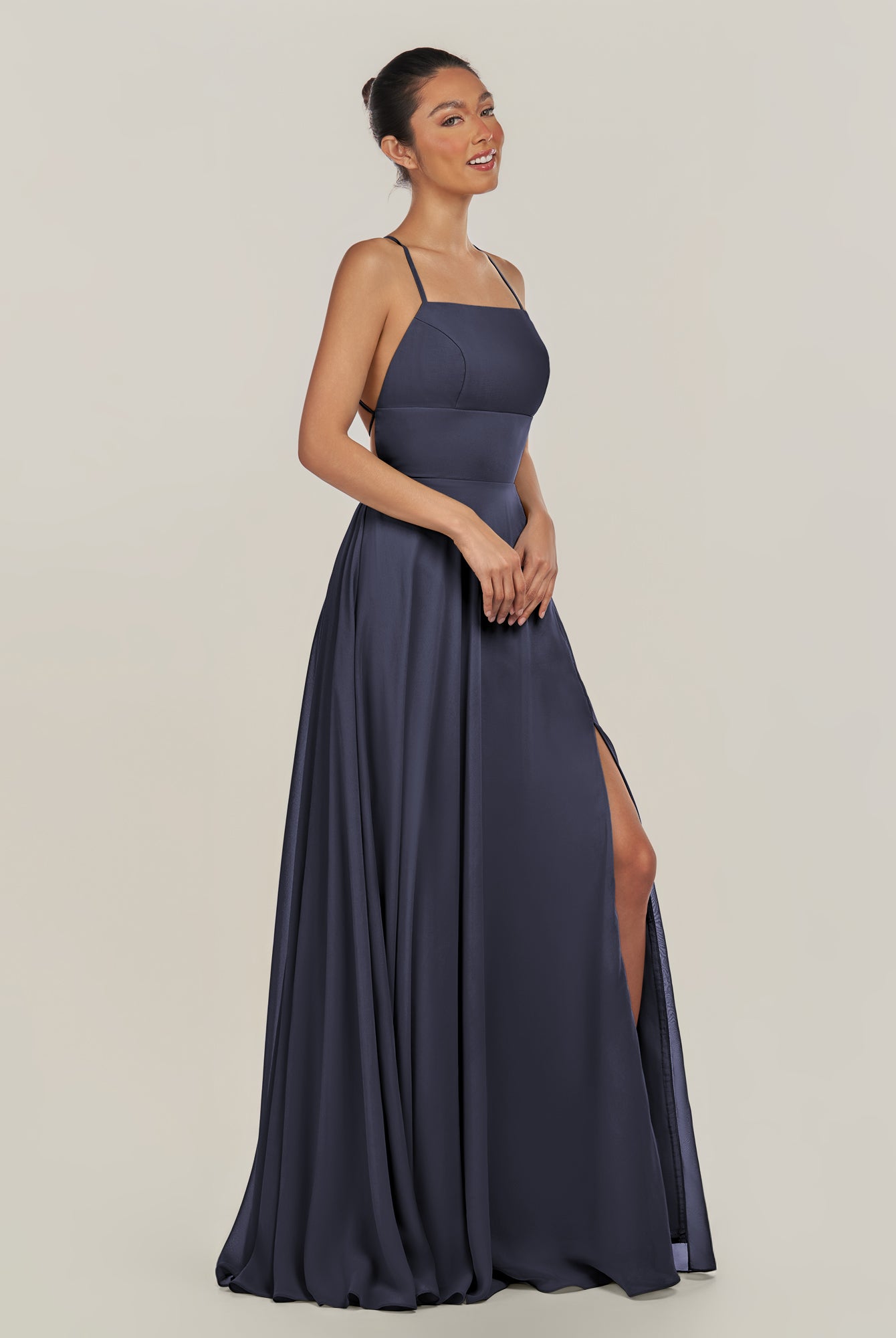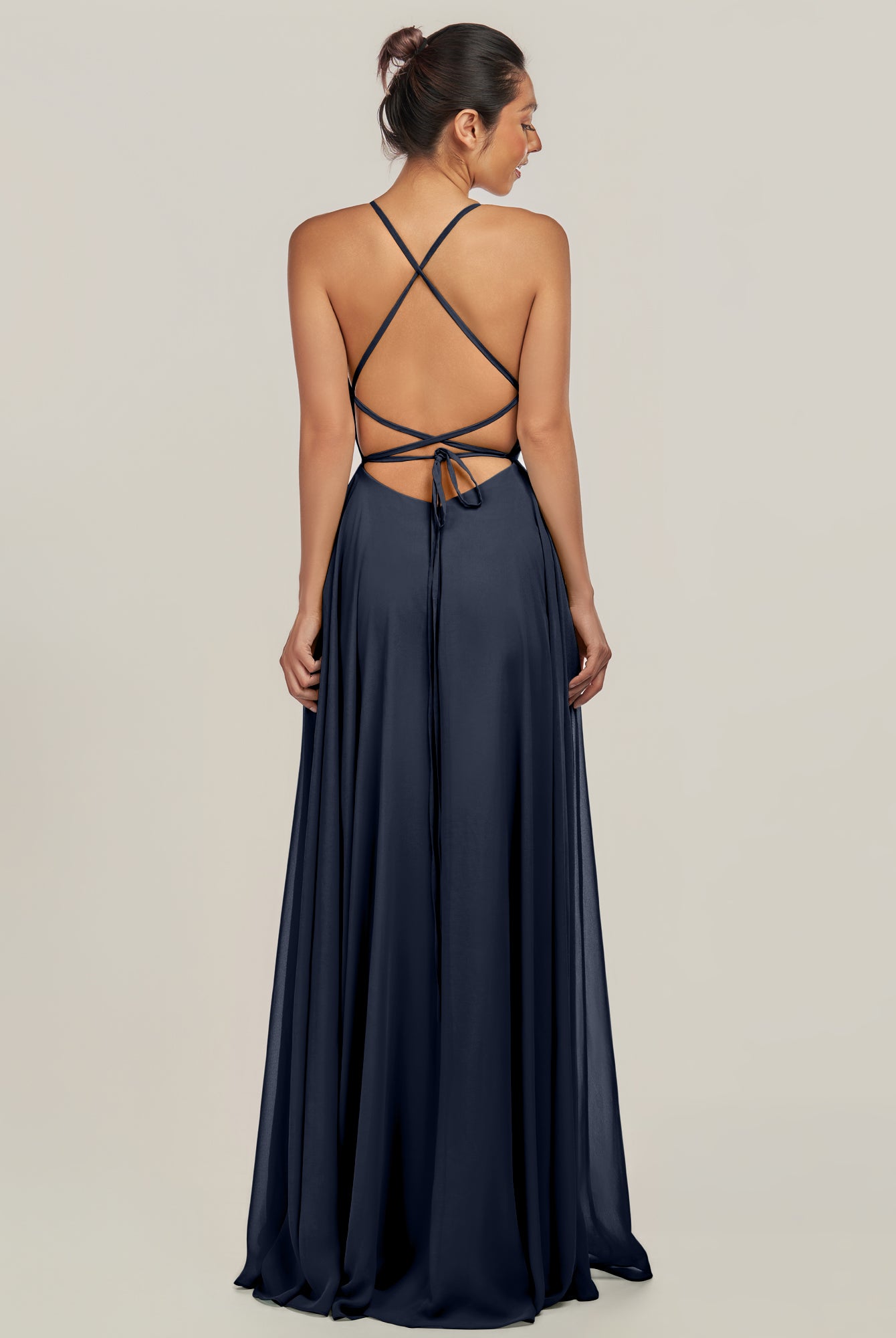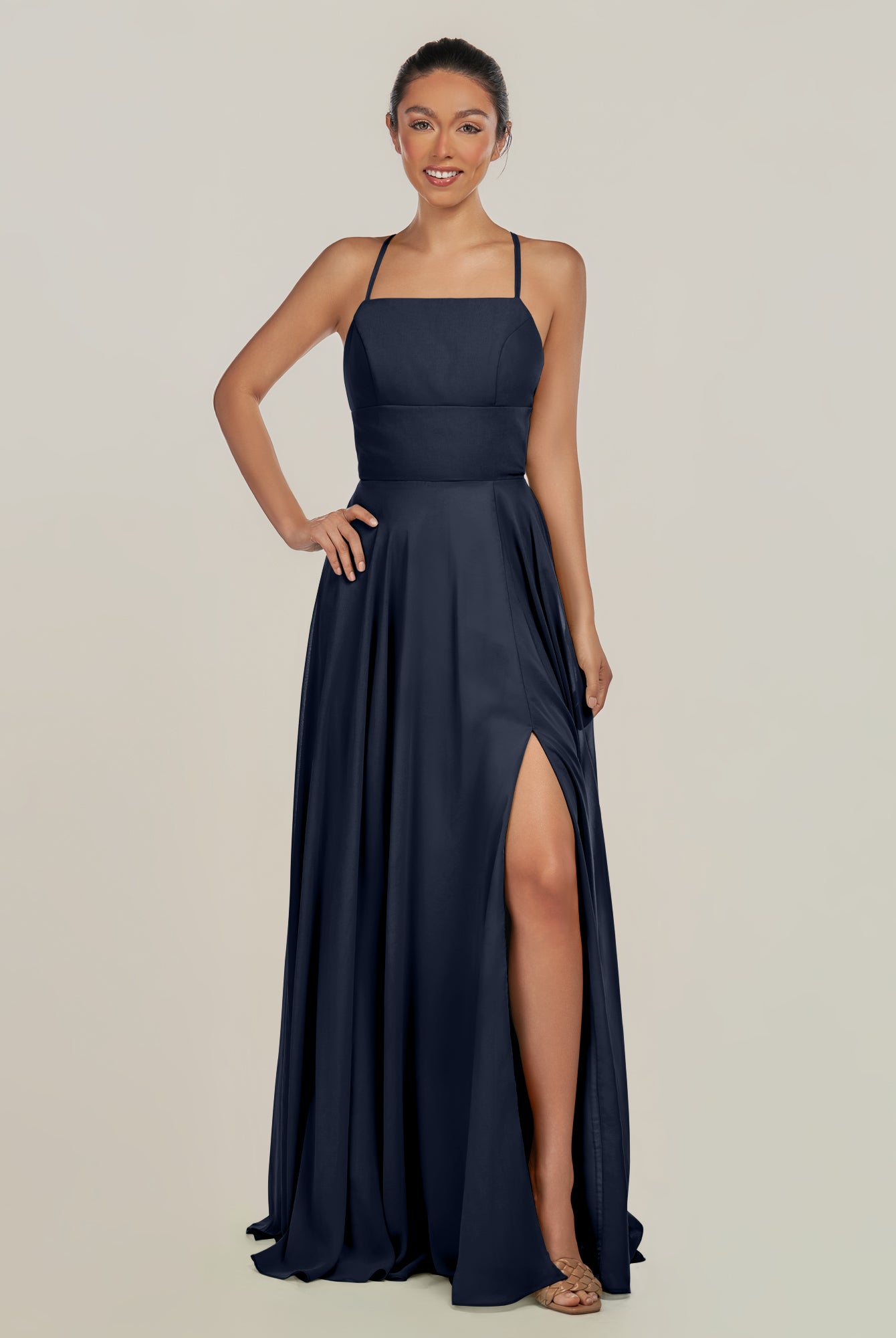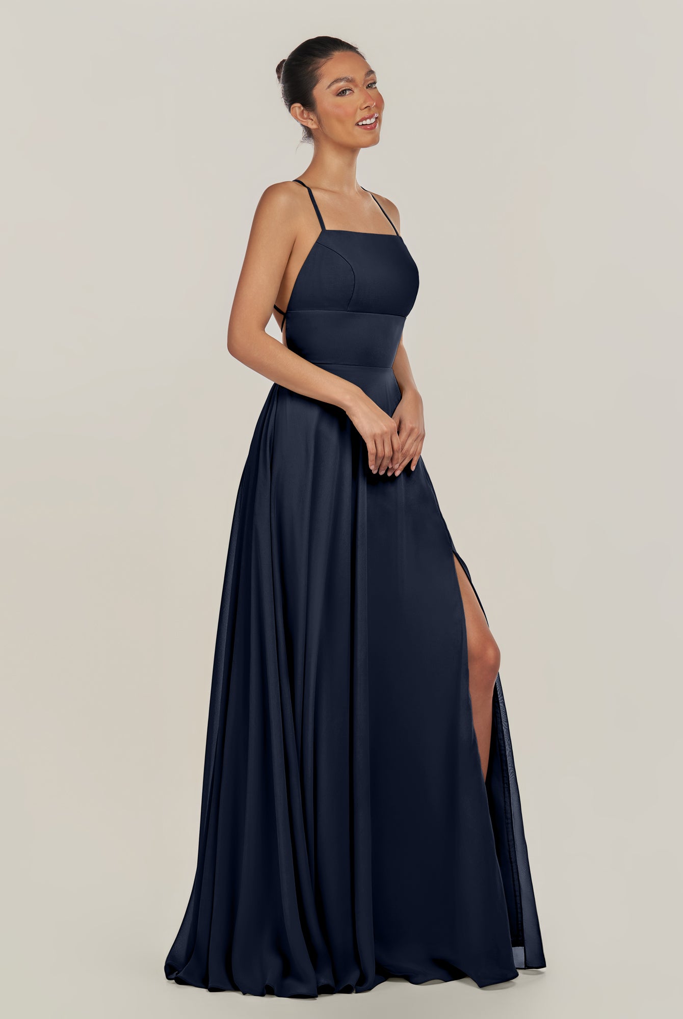 Dena | Navy - A Line Chiffon Spaghetti Straps Long Bridesmaid Dress with Slit