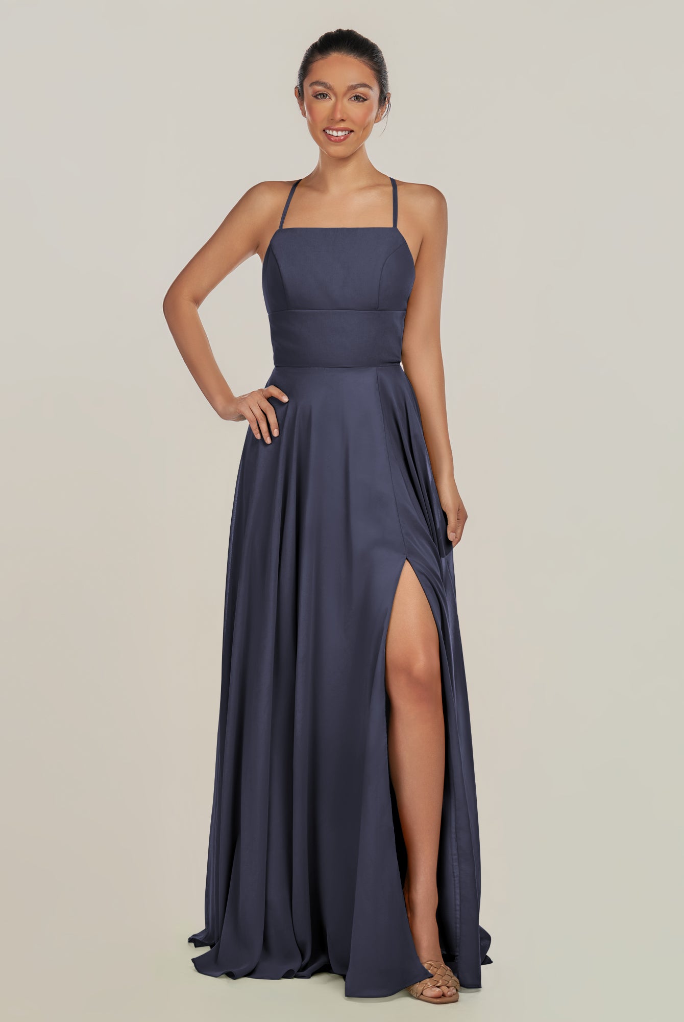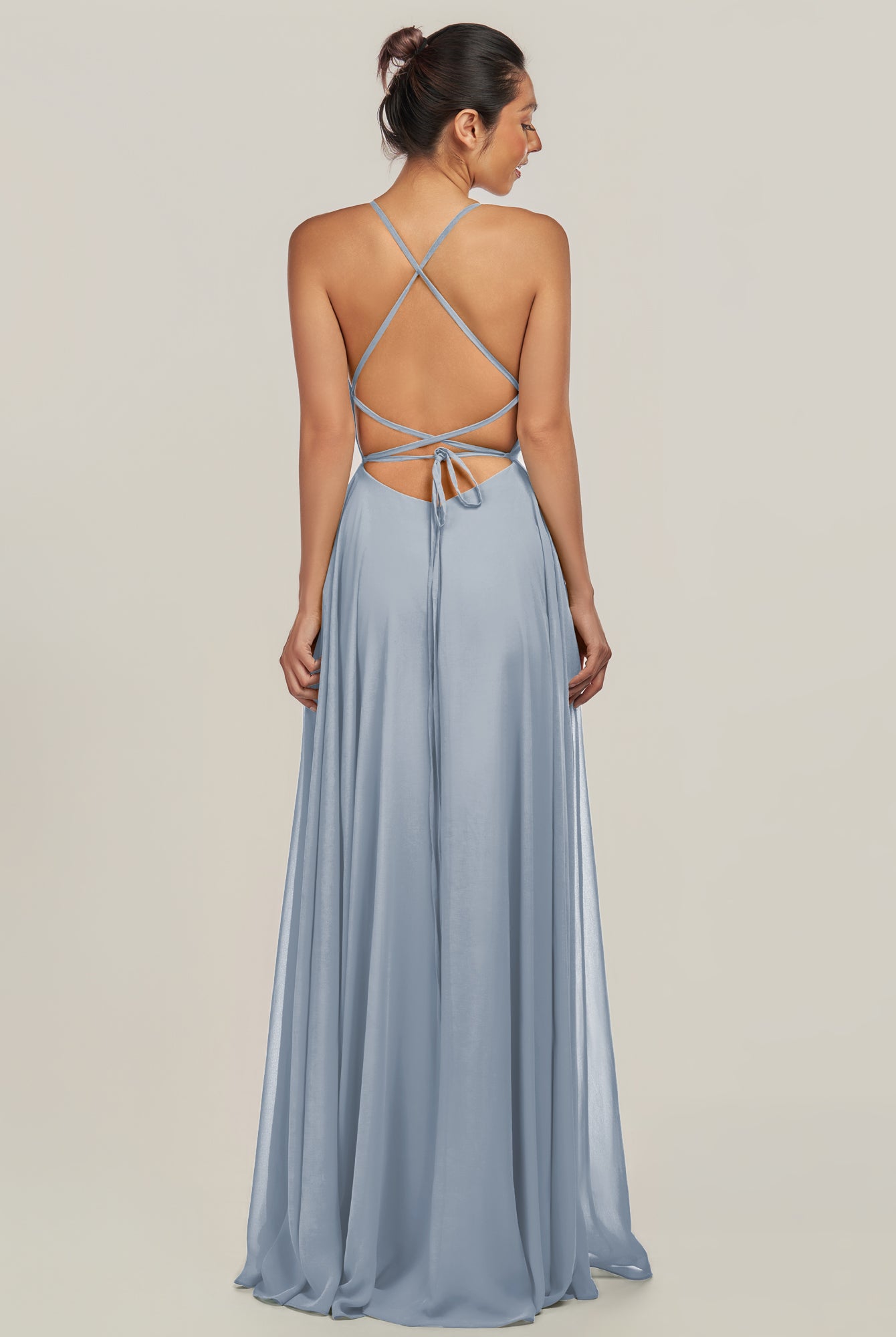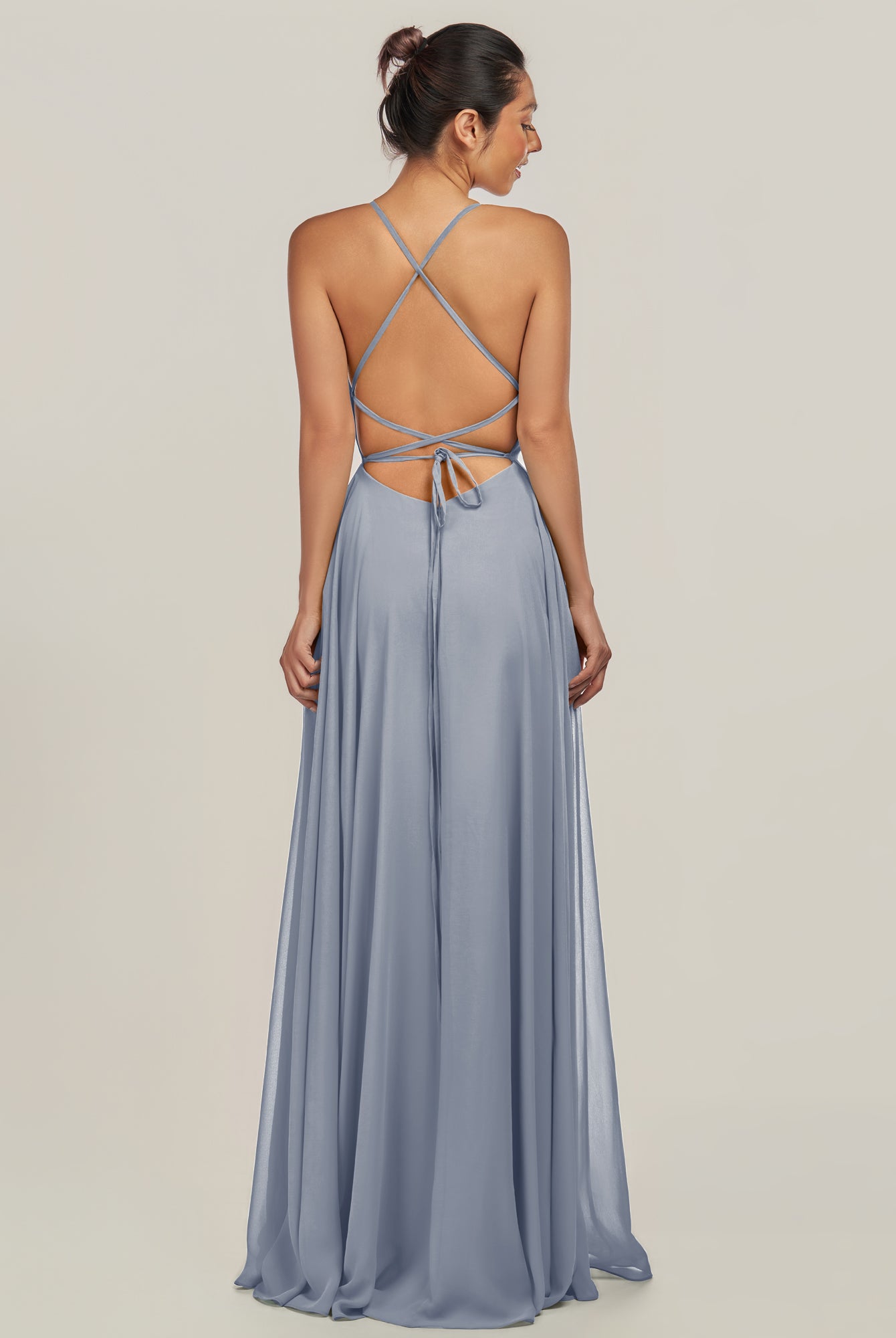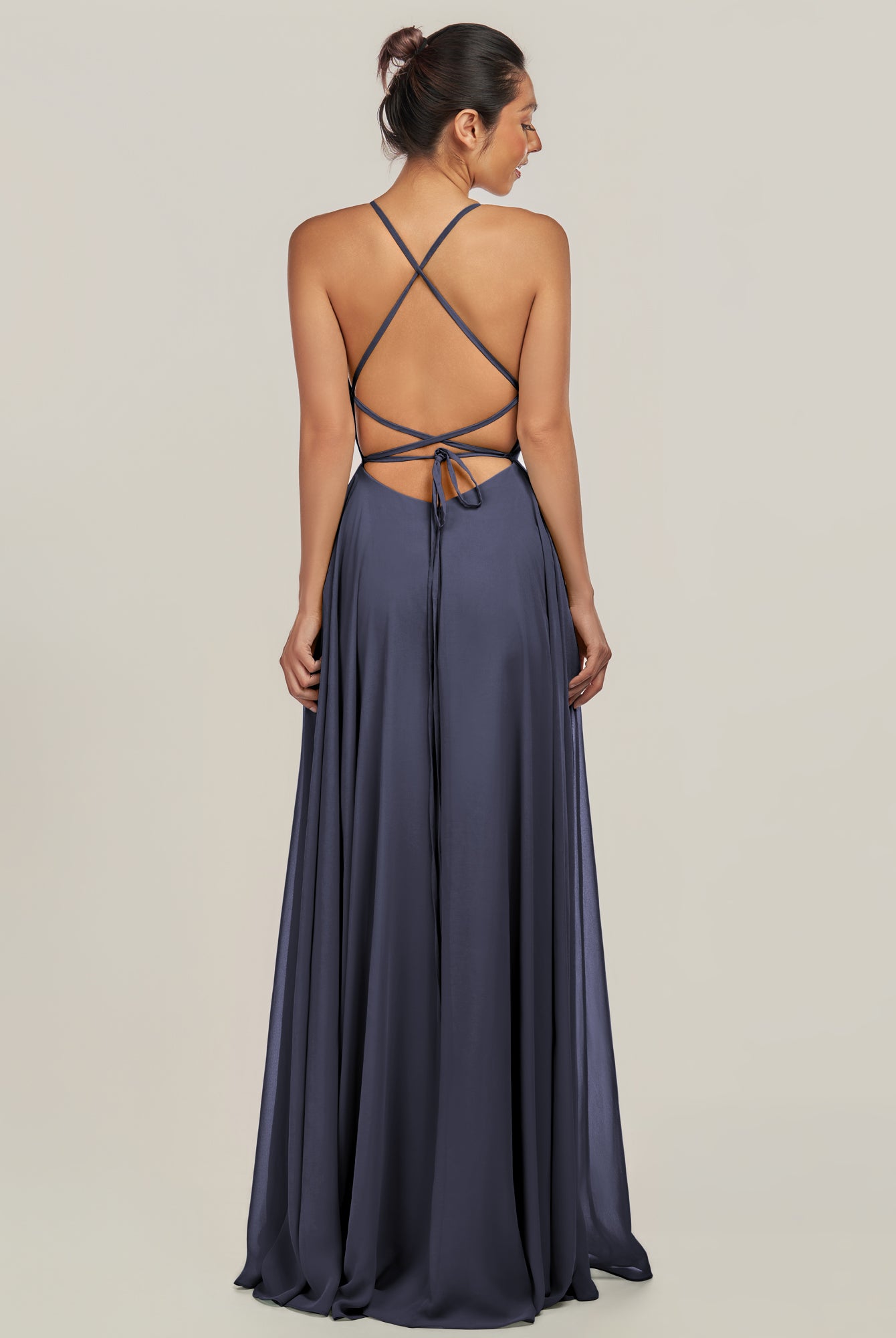 Dena | Blue Jay - A Line Chiffon Spaghetti Straps Long Bridesmaid Dress with Slit