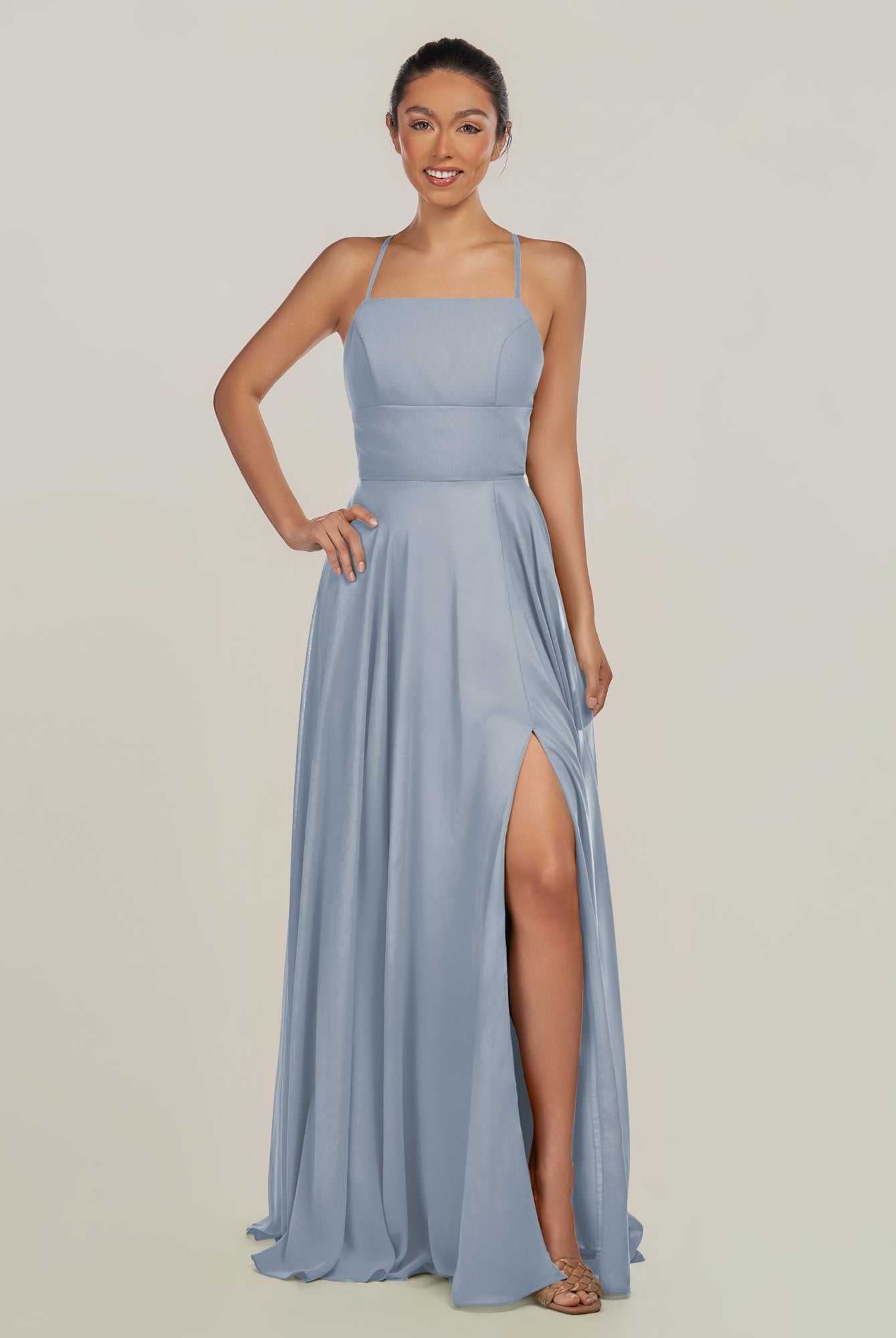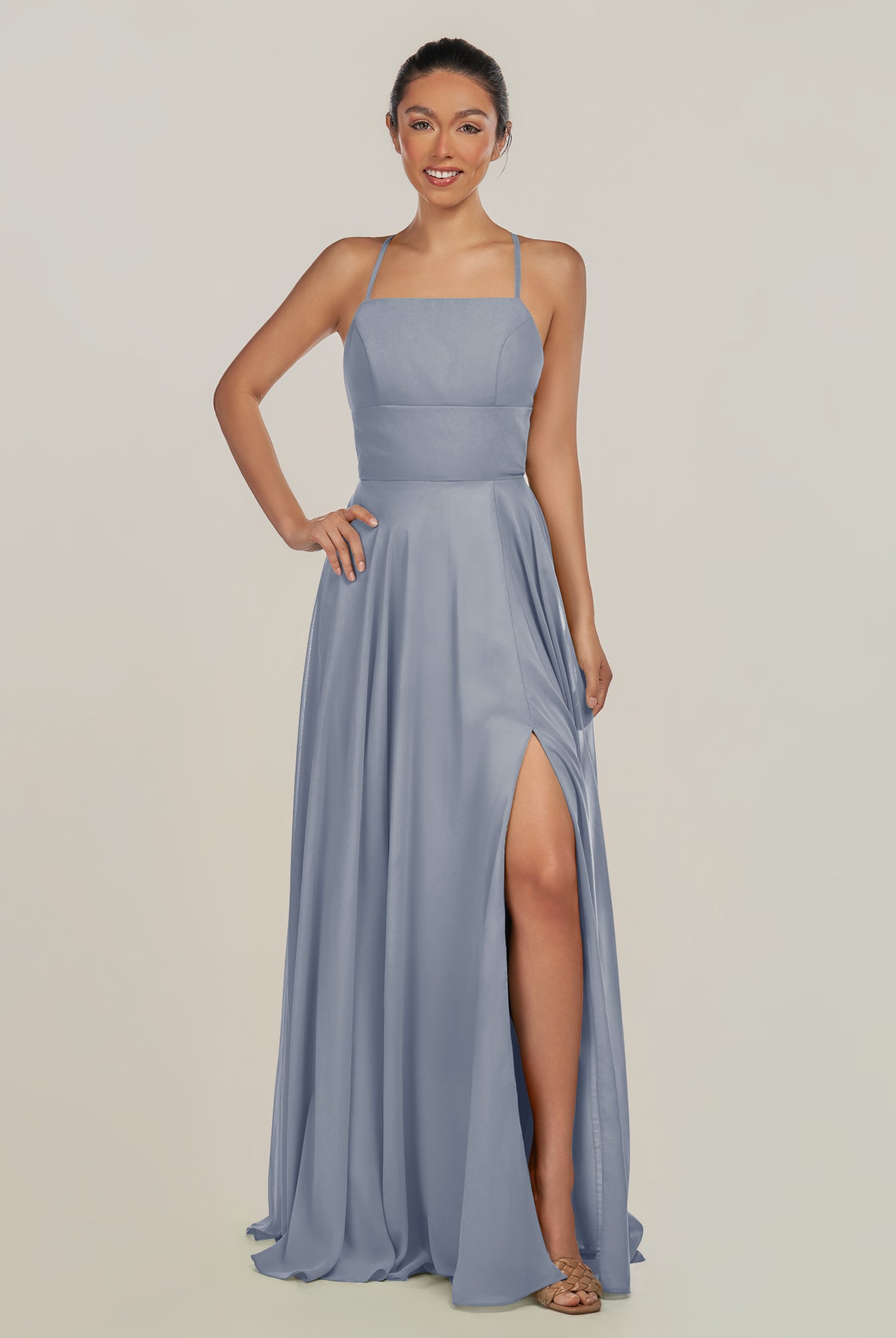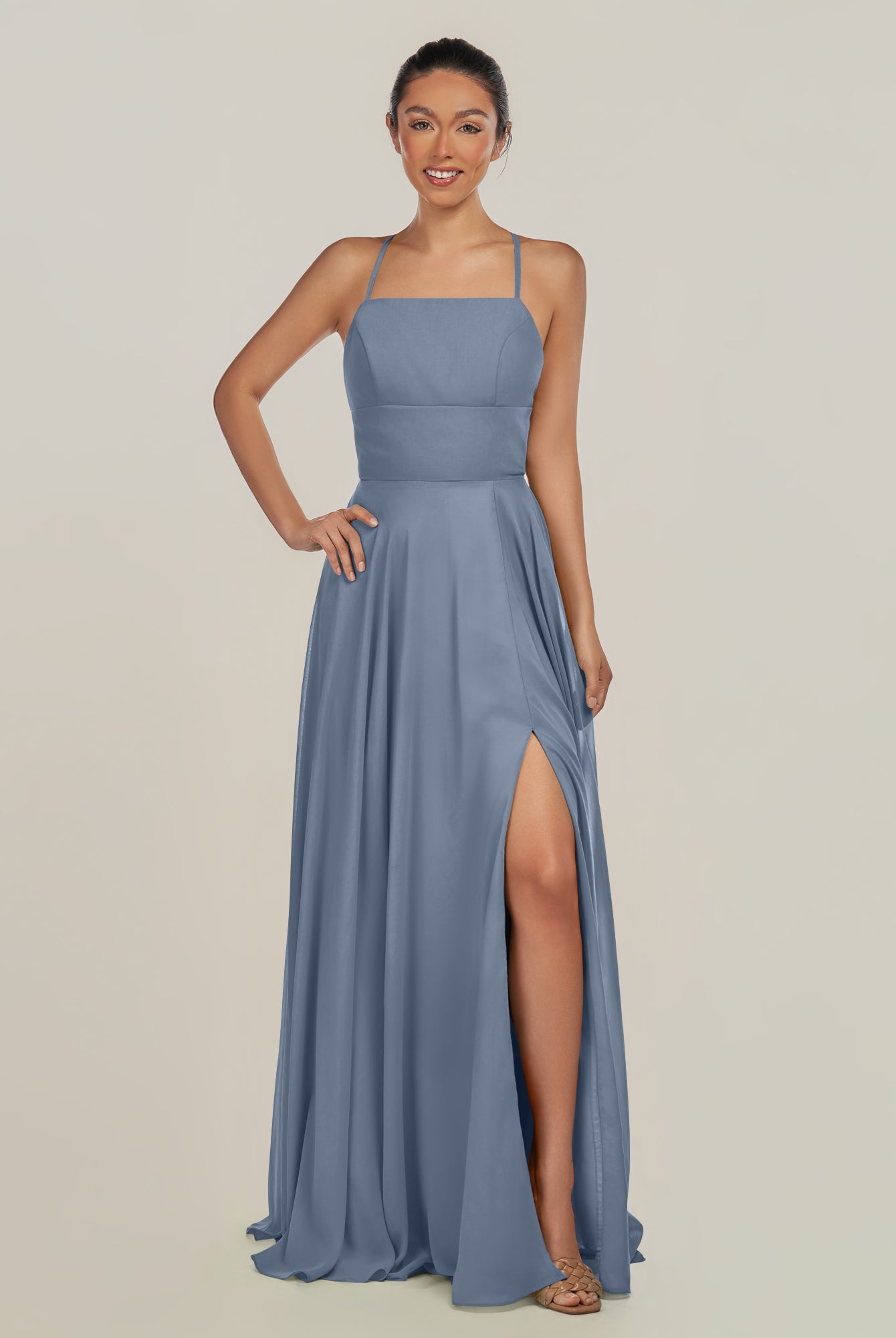 Dena | Dusk Blue - A Line Chiffon Spaghetti Straps Long Bridesmaid Dress with Slit