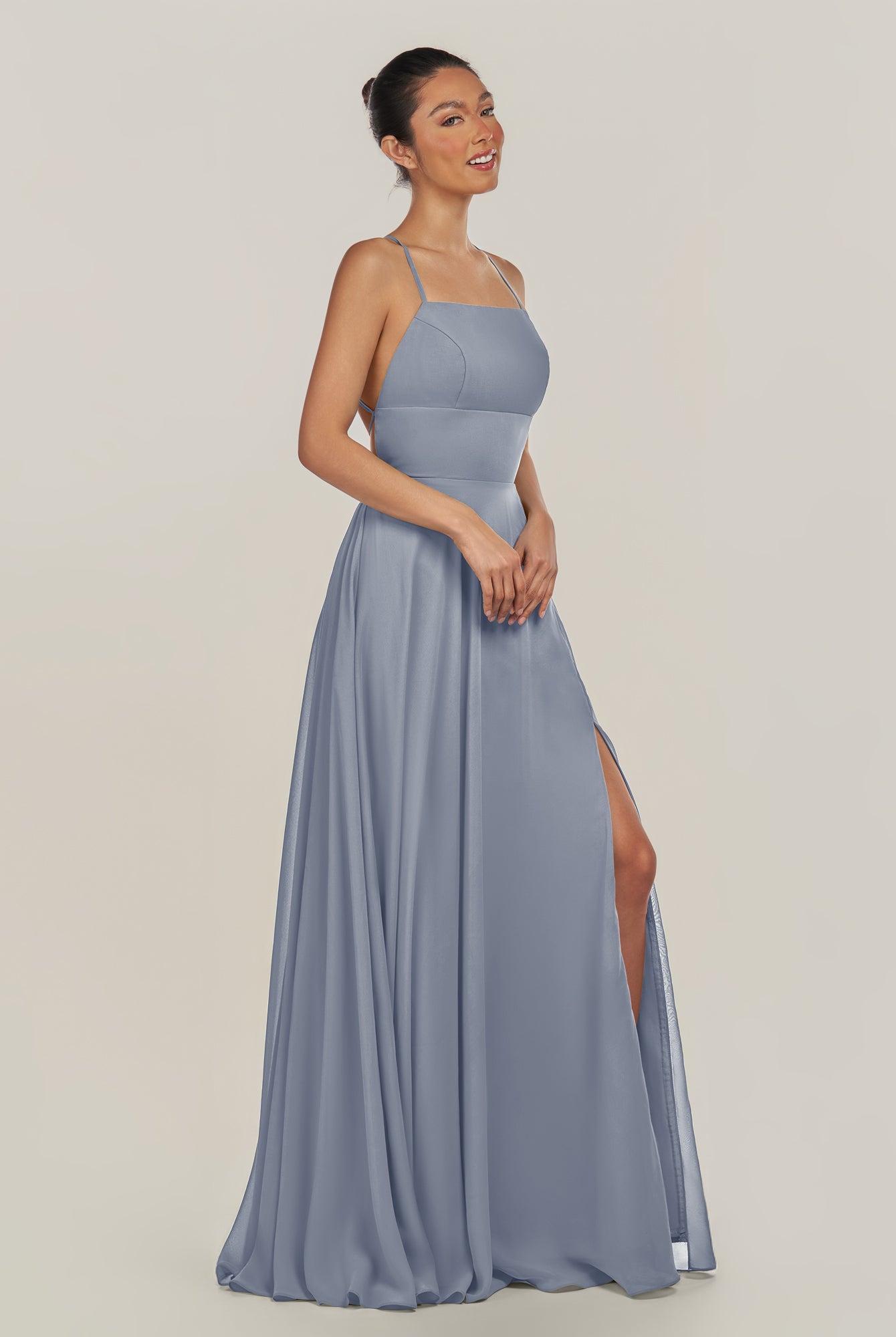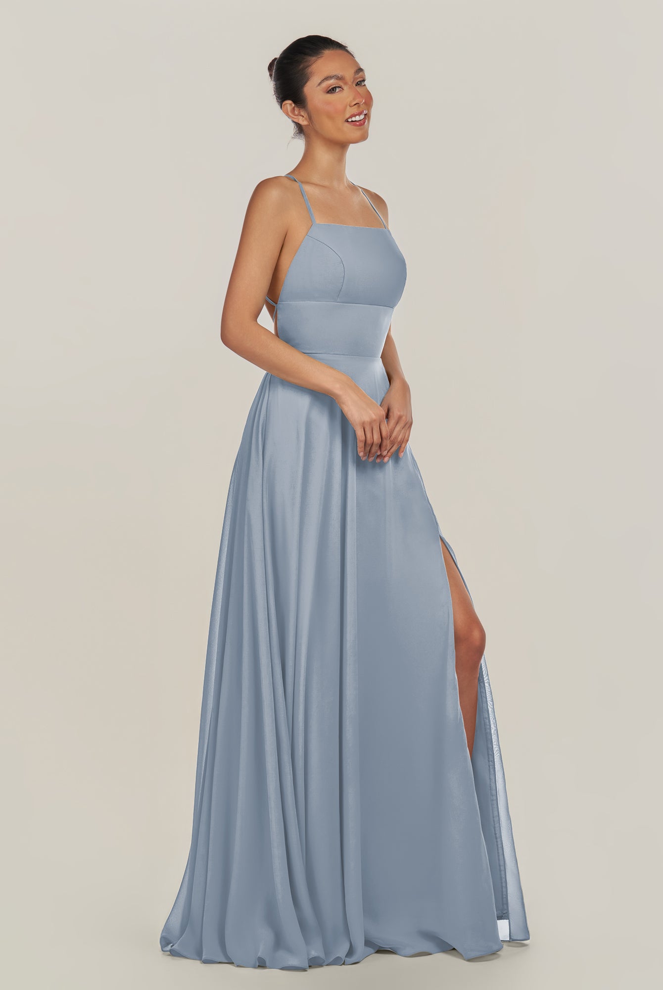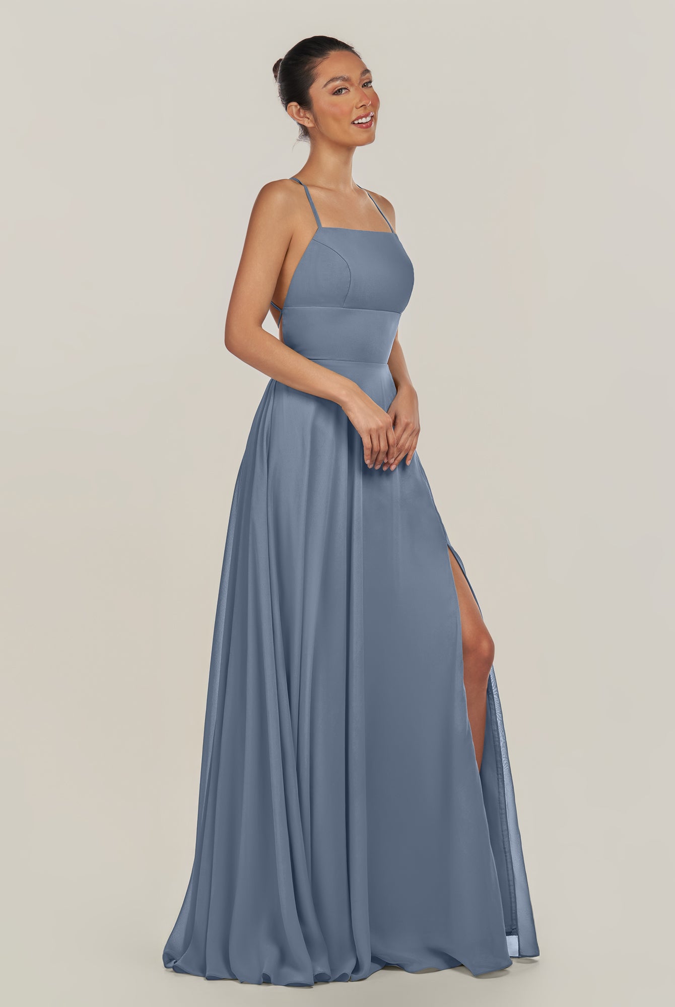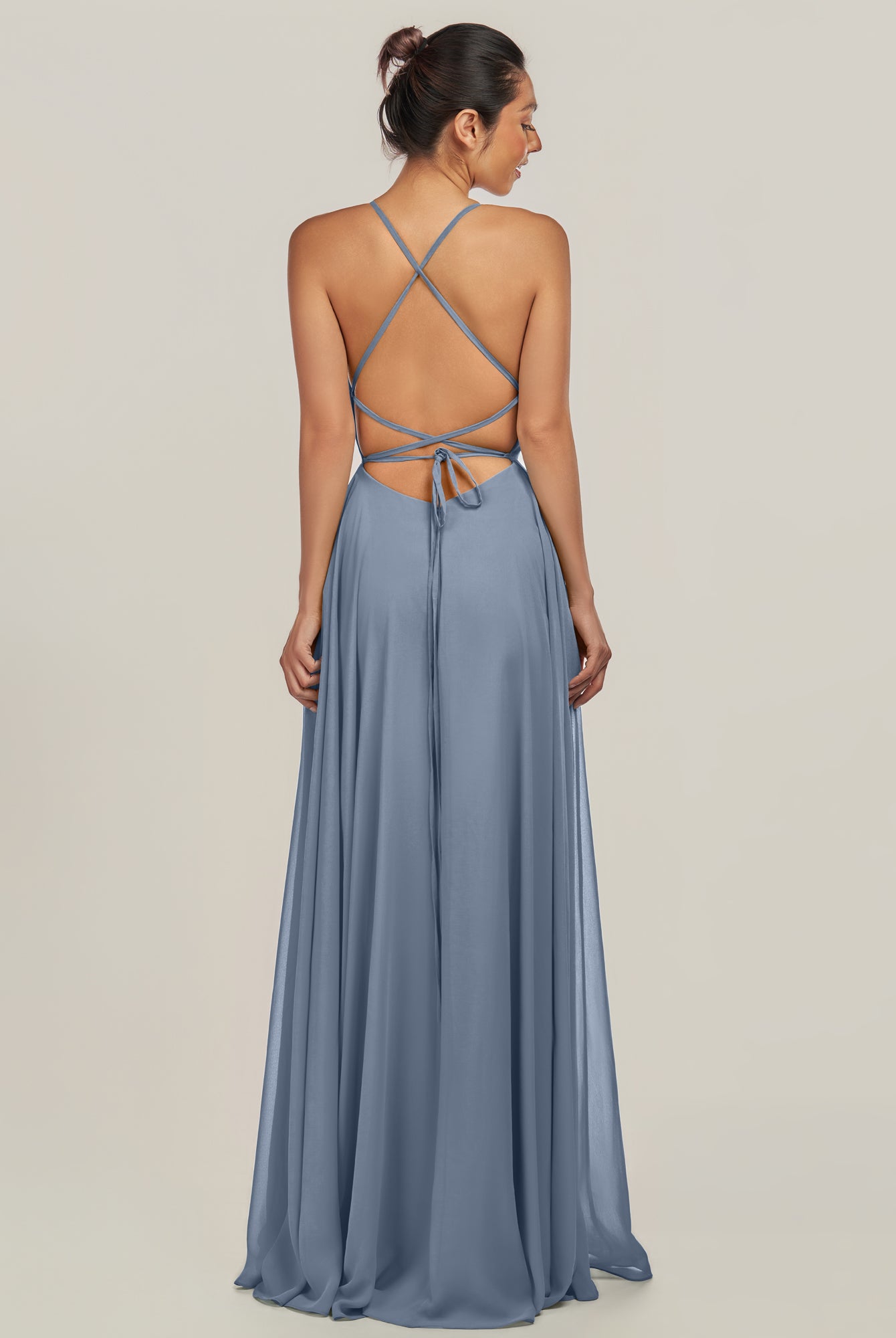 Dena | Dusk Blue - A Line Chiffon Spaghetti Straps Long Bridesmaid Dress with Slit
