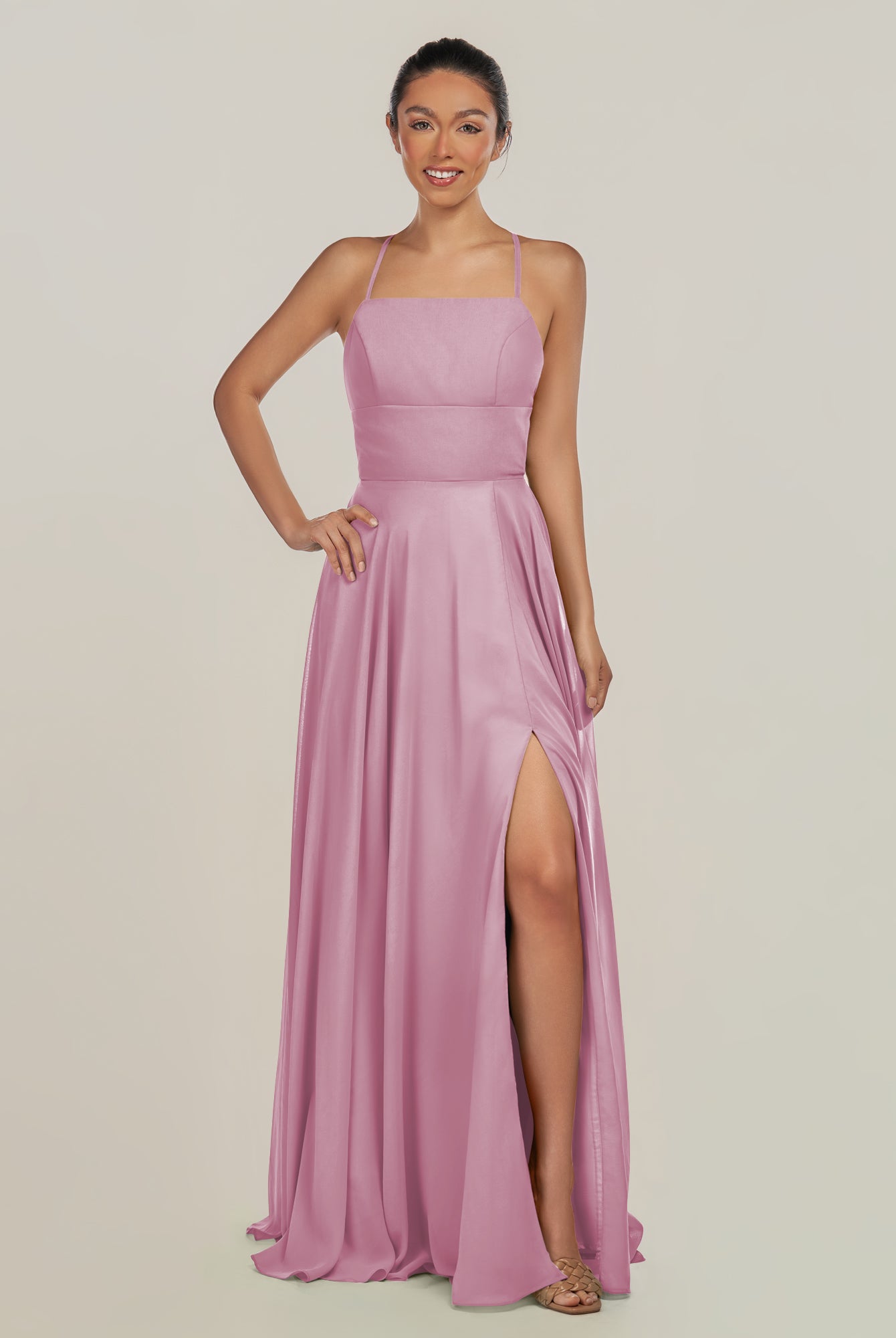 Dena | Desert Rose - A Line Chiffon Spaghetti Straps Long Bridesmaid Dress with Slit